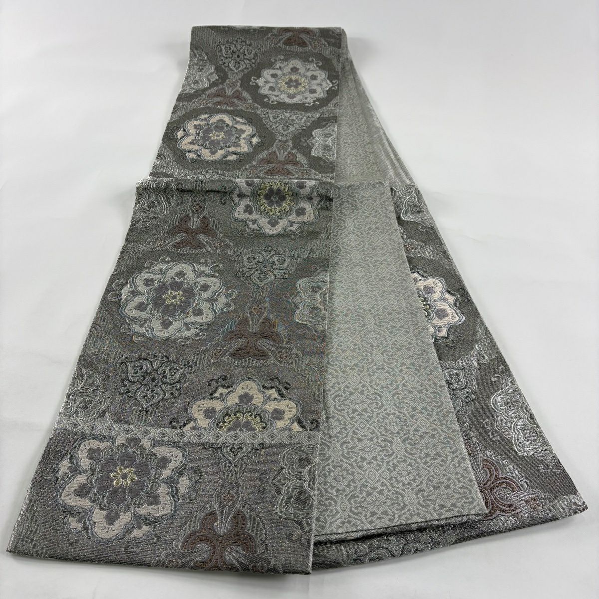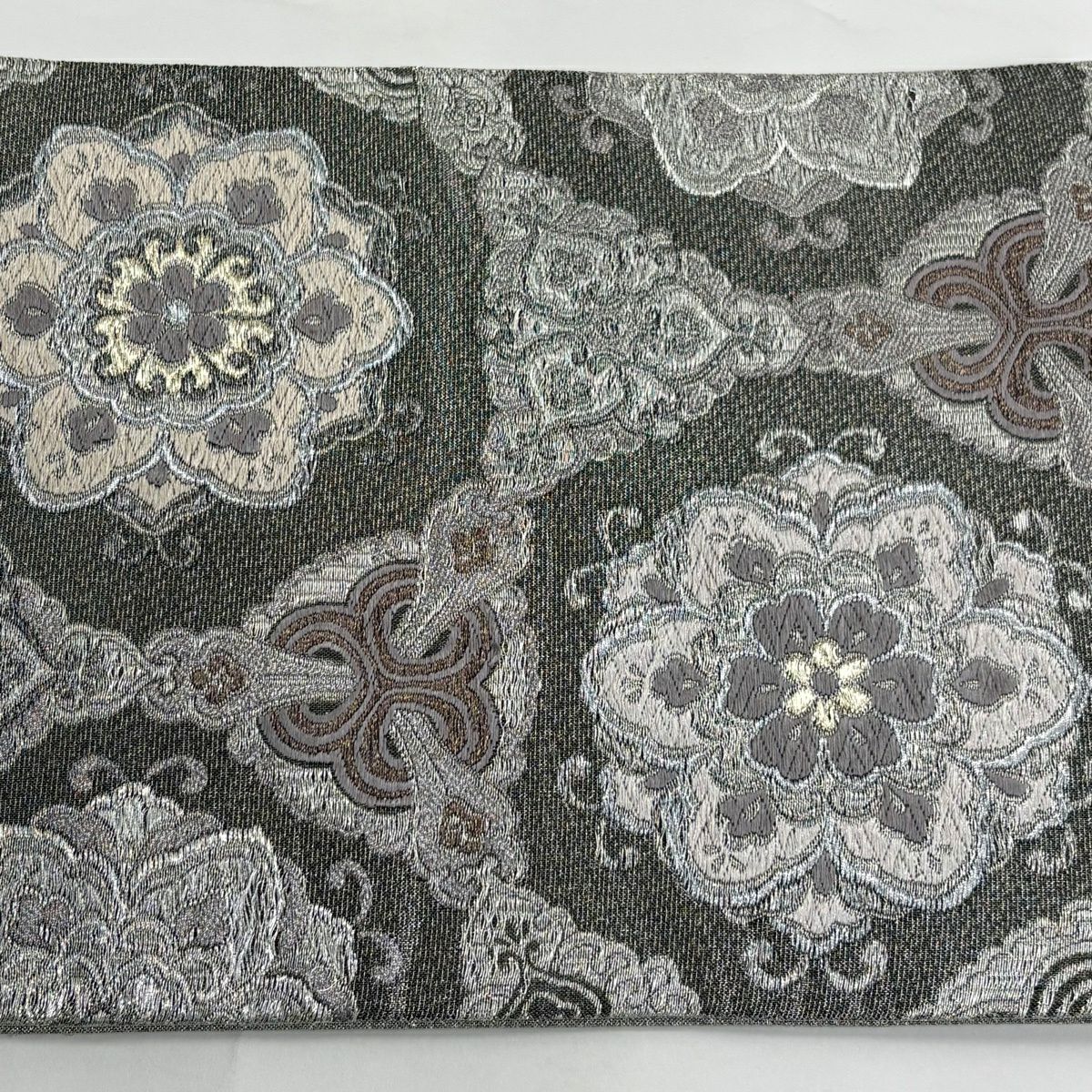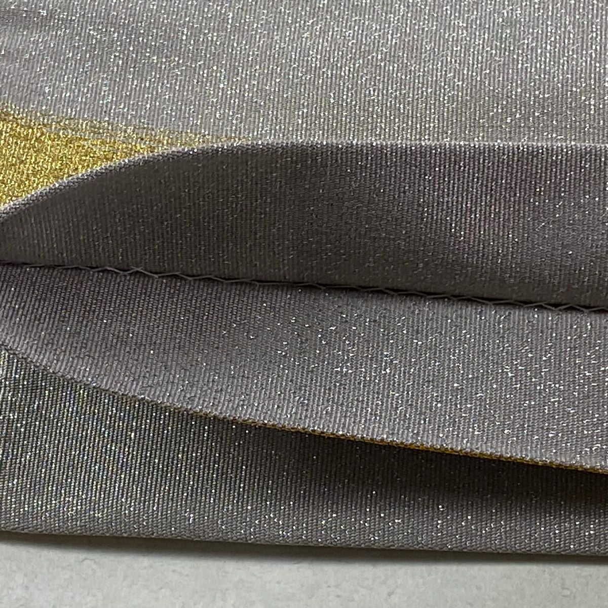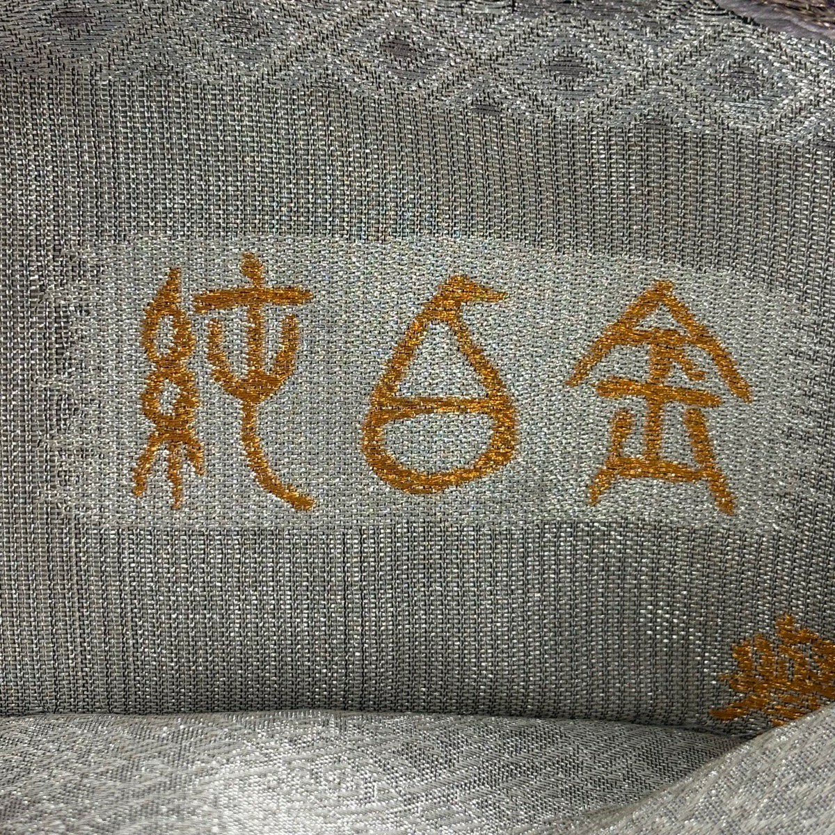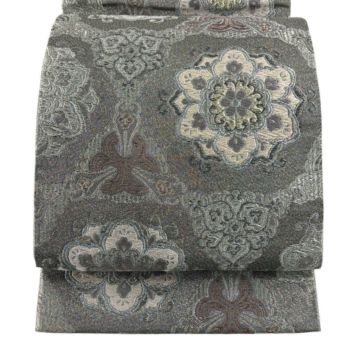 【美品】 袋帯 逸品 華文 紗綾形 金糸 箔 灰色 お太鼓柄 正絹