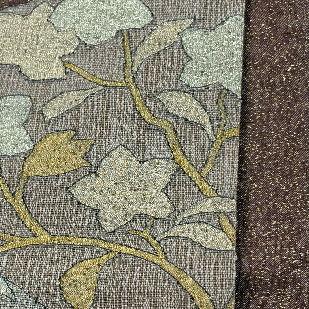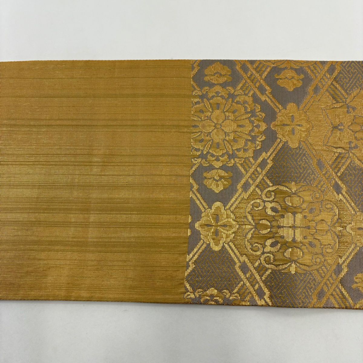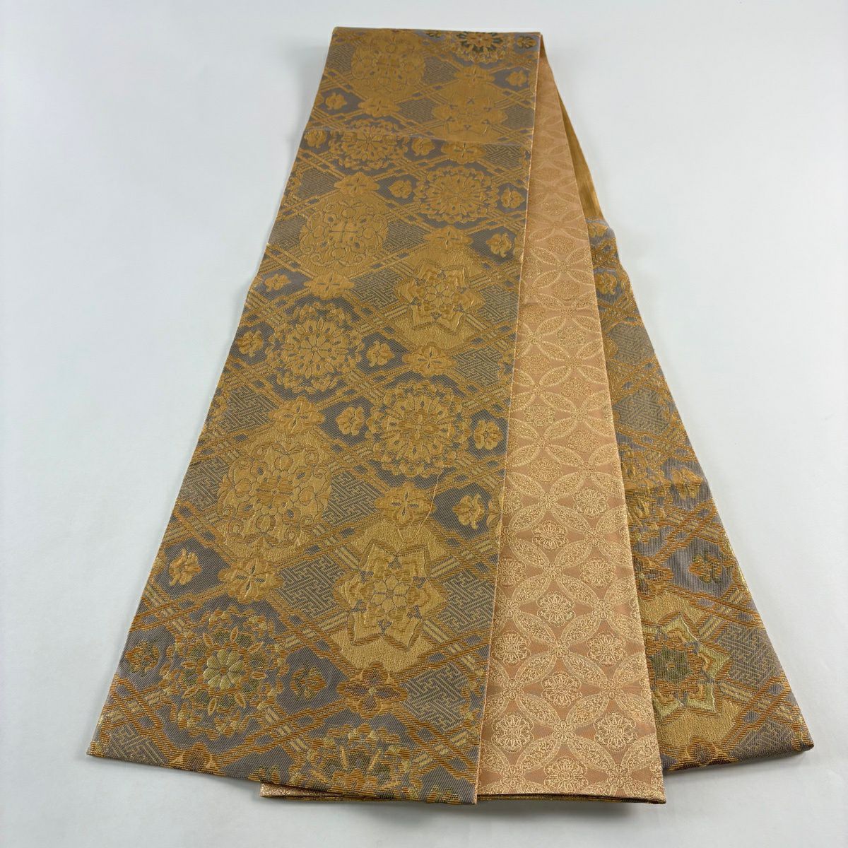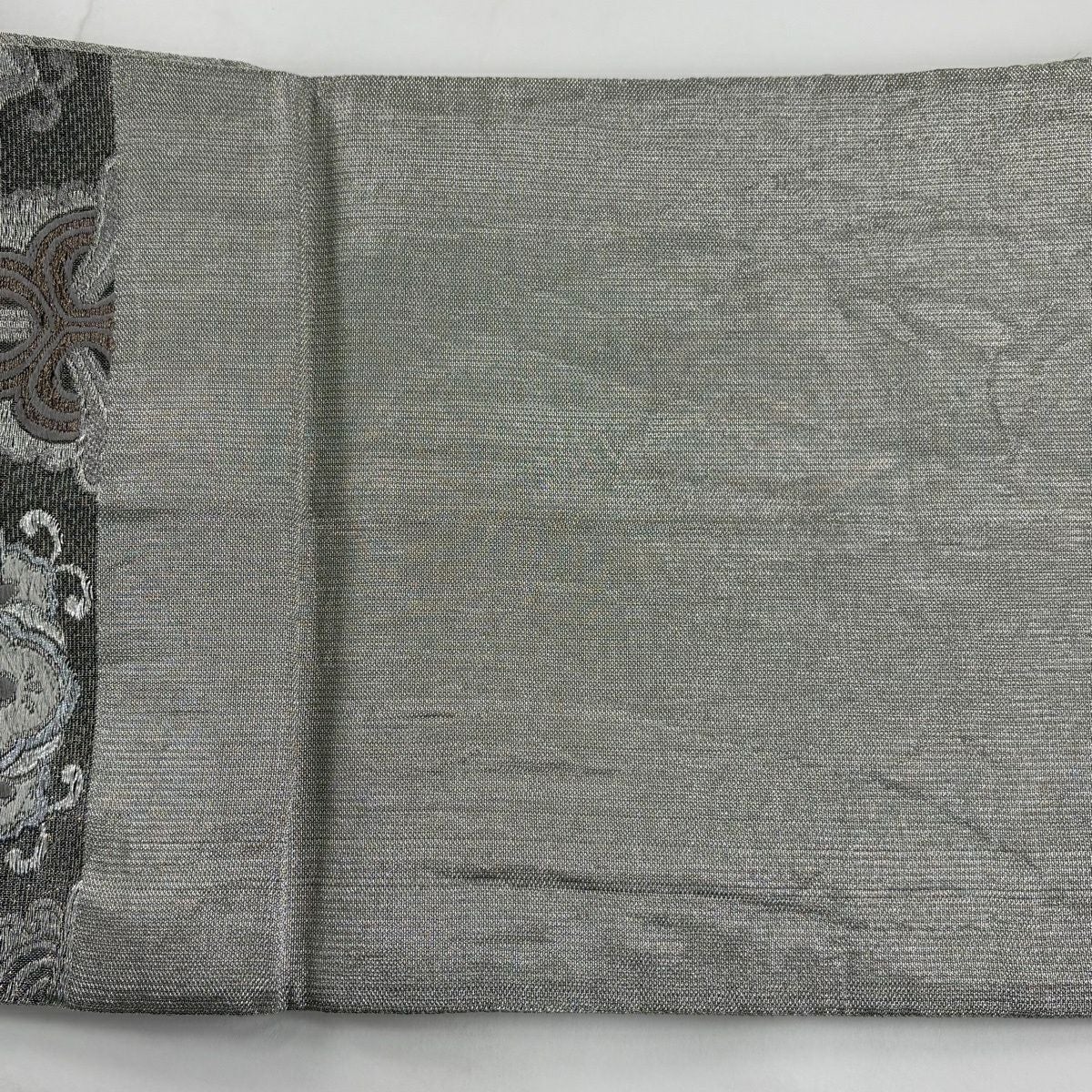 【美品】 袋帯 逸品 華文 紗綾形 金糸 箔 灰色 お太鼓柄 正絹