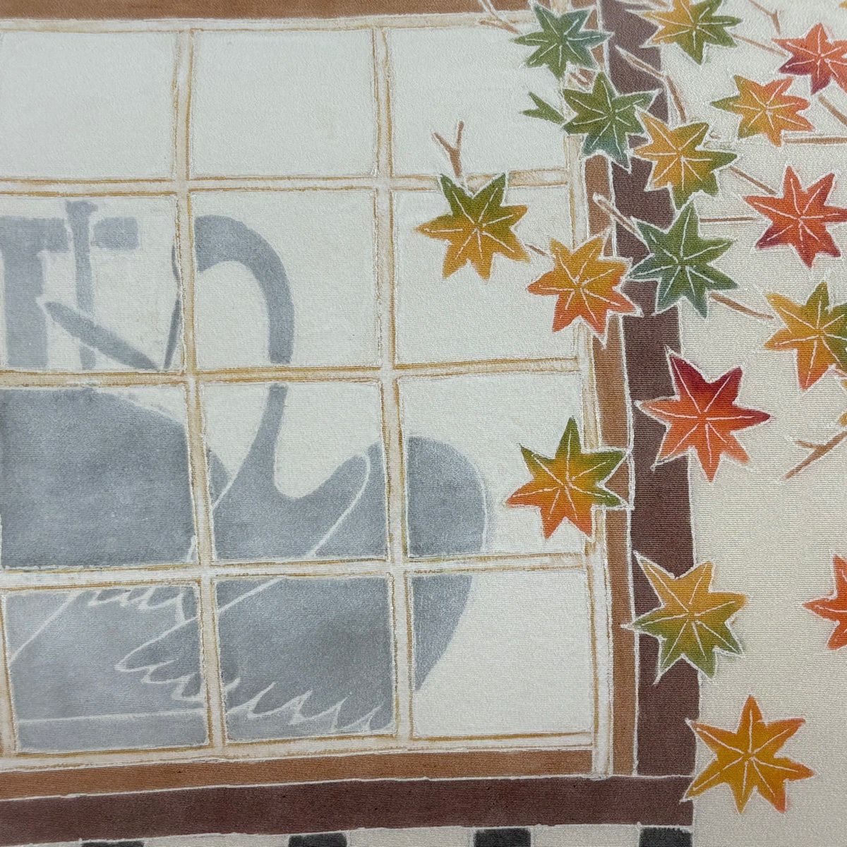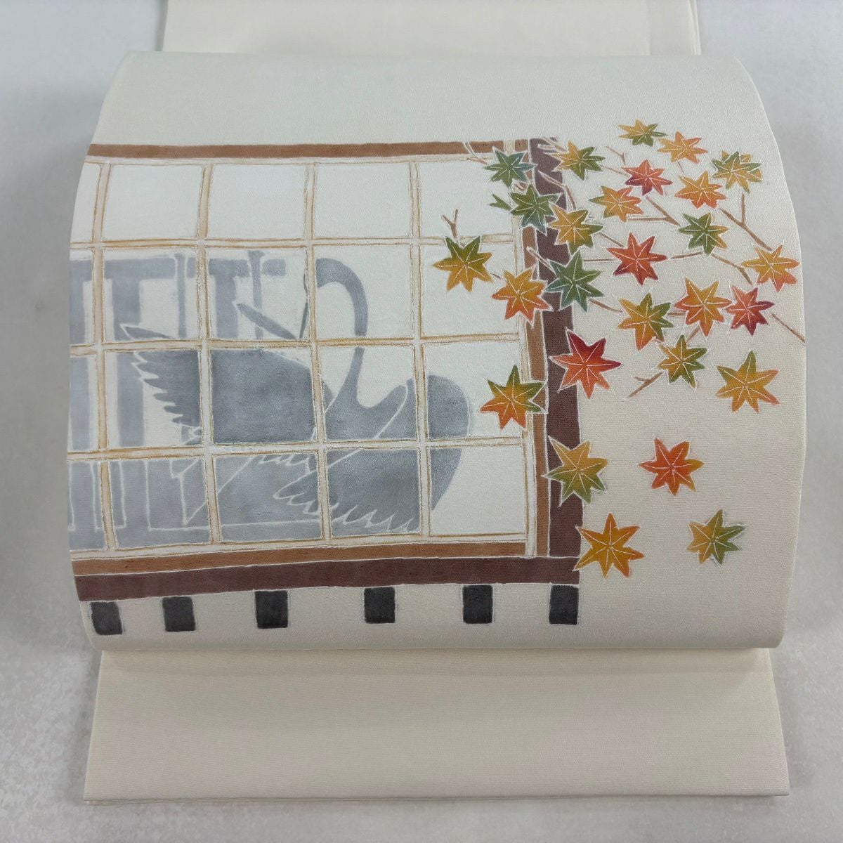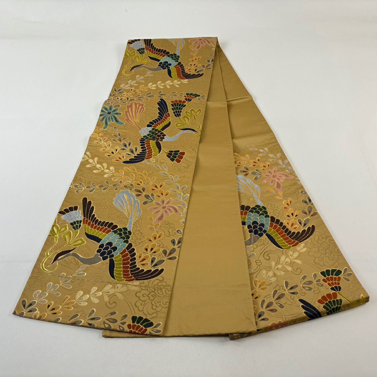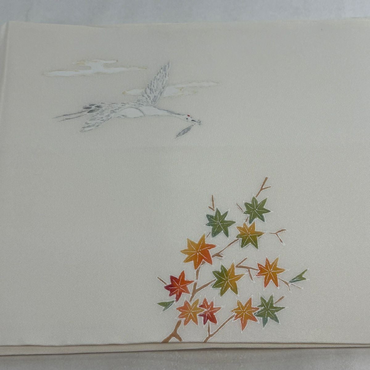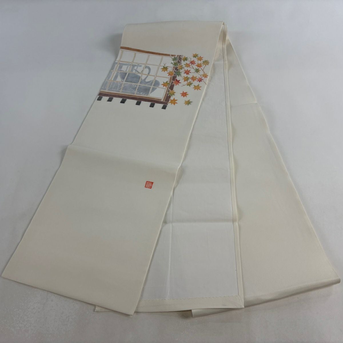 【美品】 開き名古屋帯 逸品 落款あり 鶴の恩返し クリーム 正絹