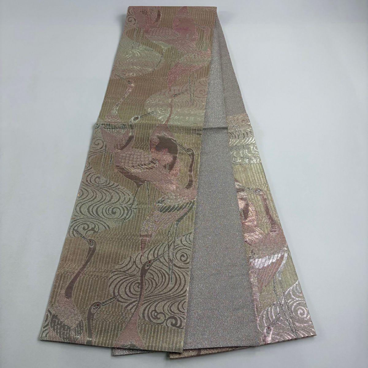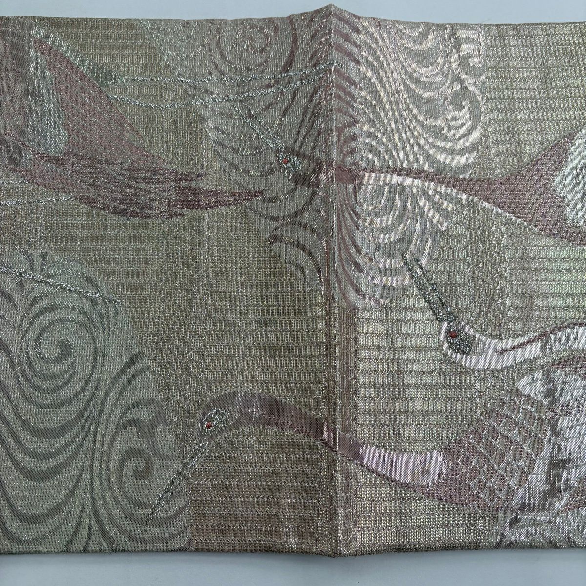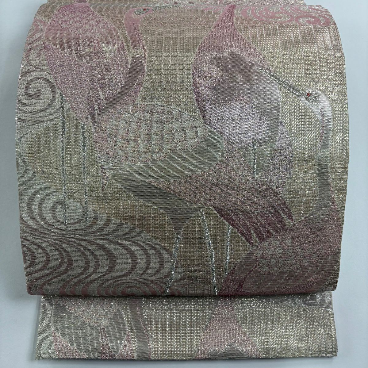 【美品】 袋帯 逸品 鶴 流水 銀糸 ラメ箔 ピンク 六通 正絹