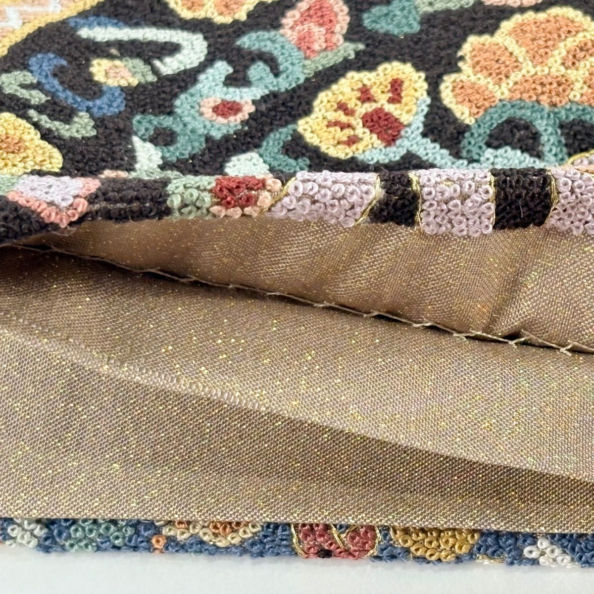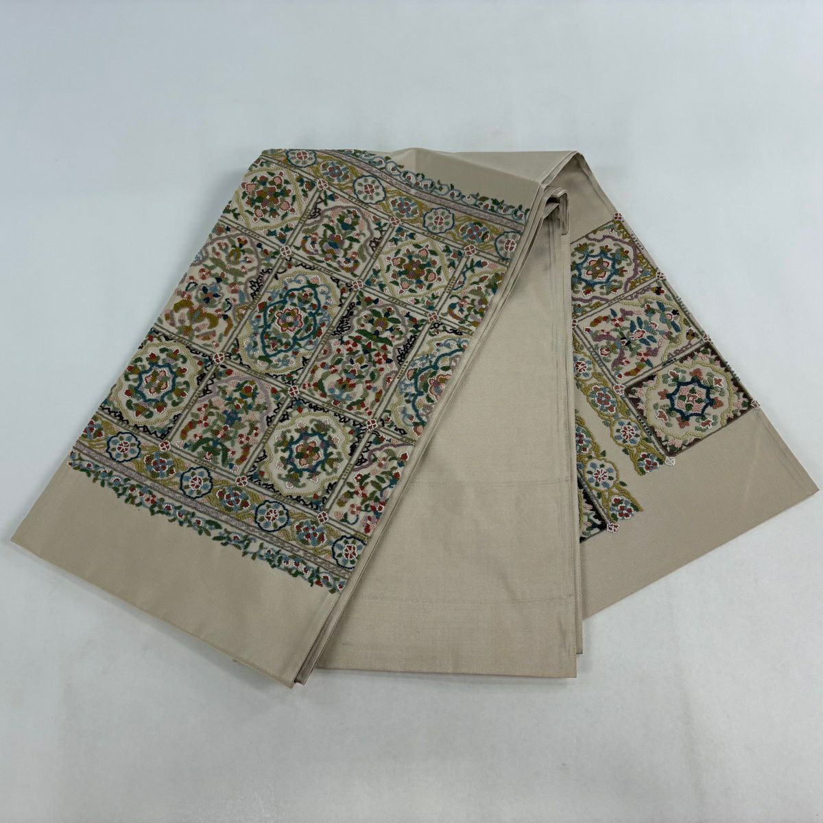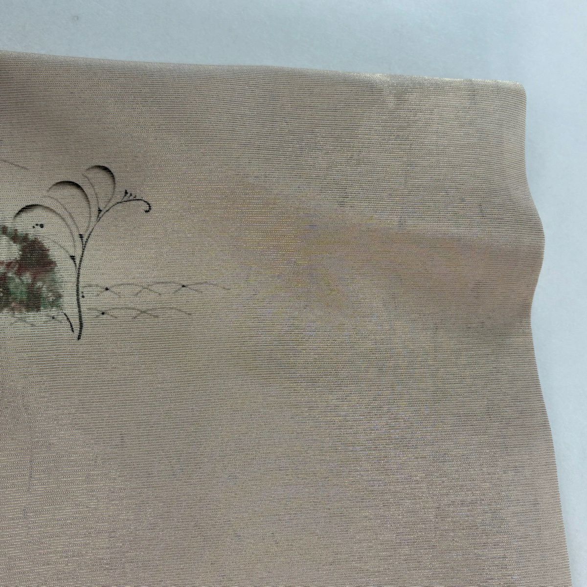【美品】 袋帯 逸品 華文 草花 相良刺繍 薄茶色 お太鼓柄 正絹