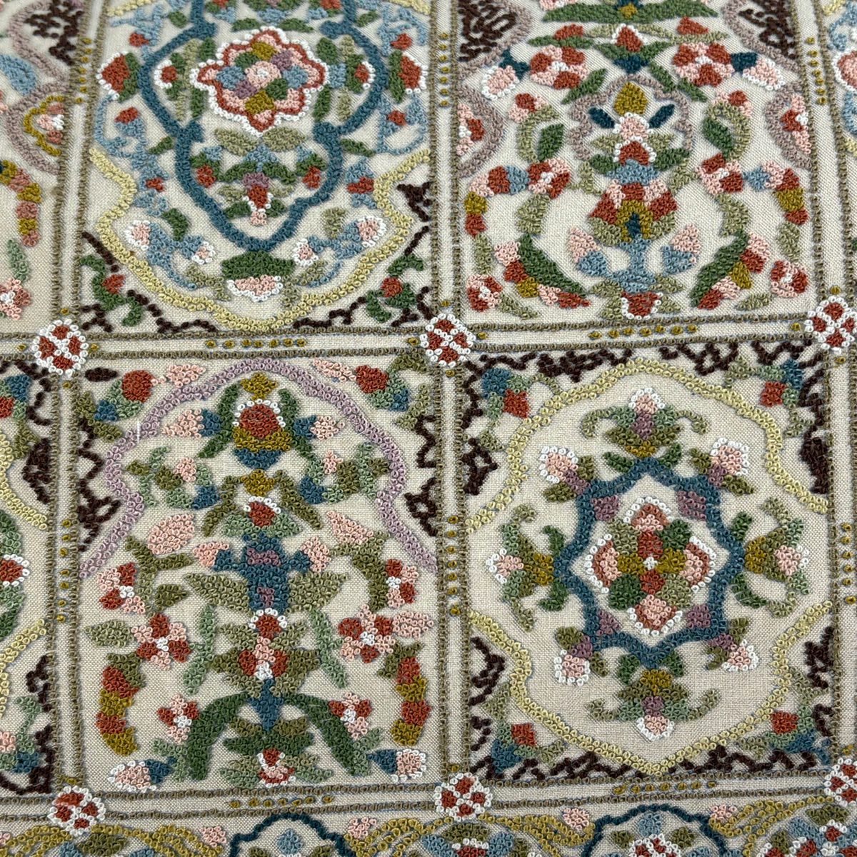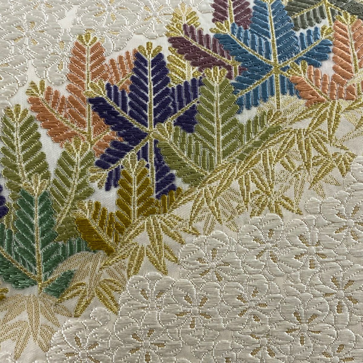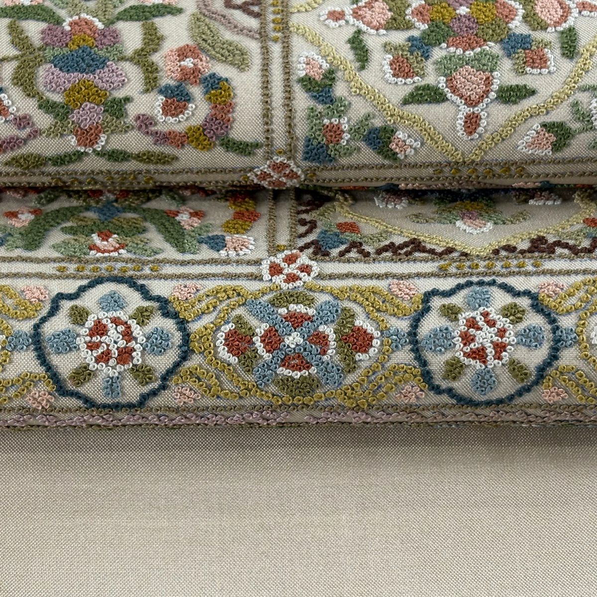 【美品】 袋帯 逸品 華文 草花 相良刺繍 薄茶色 お太鼓柄 正絹
