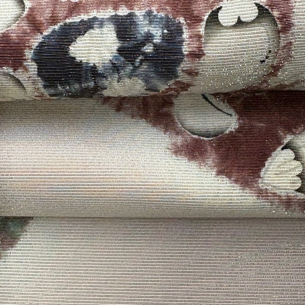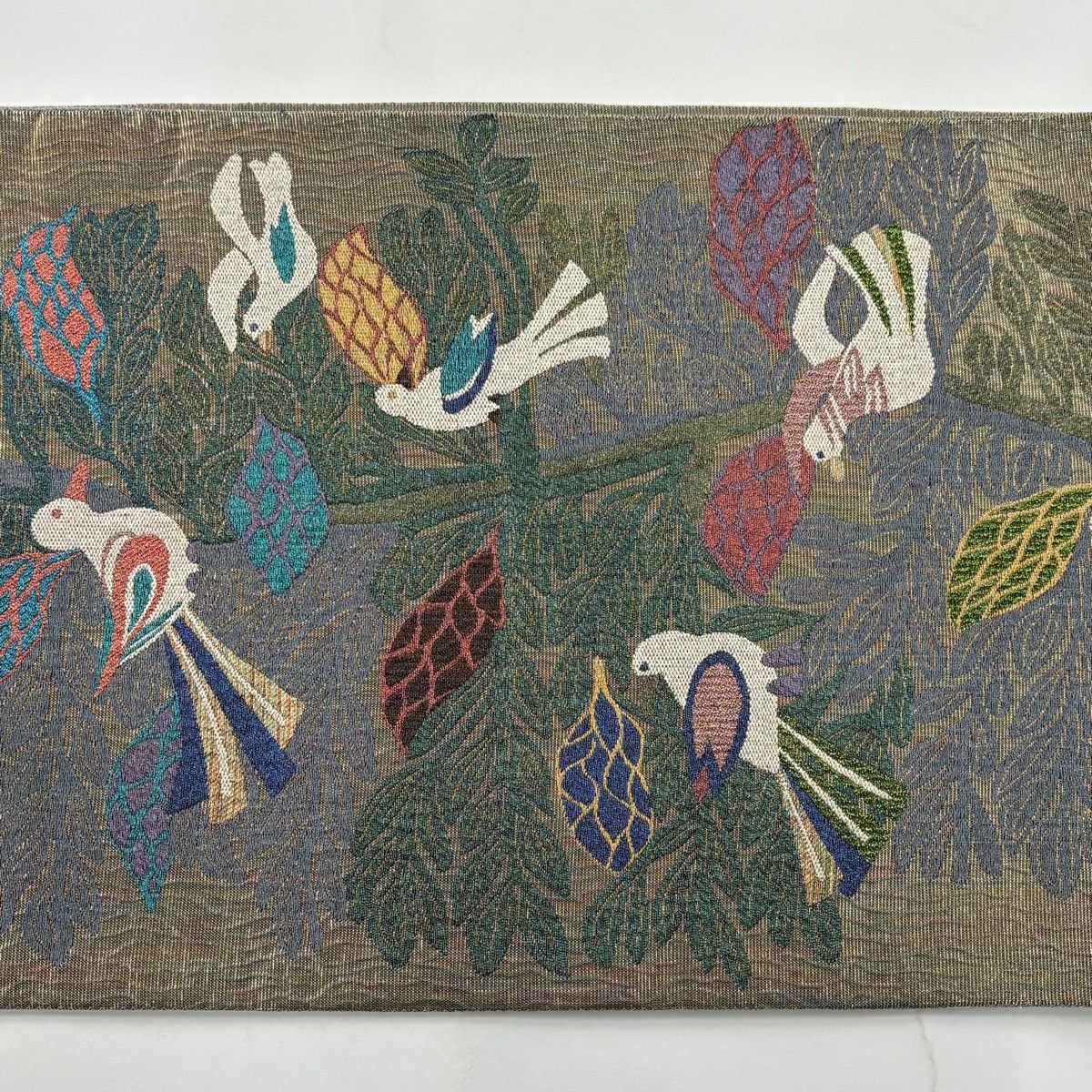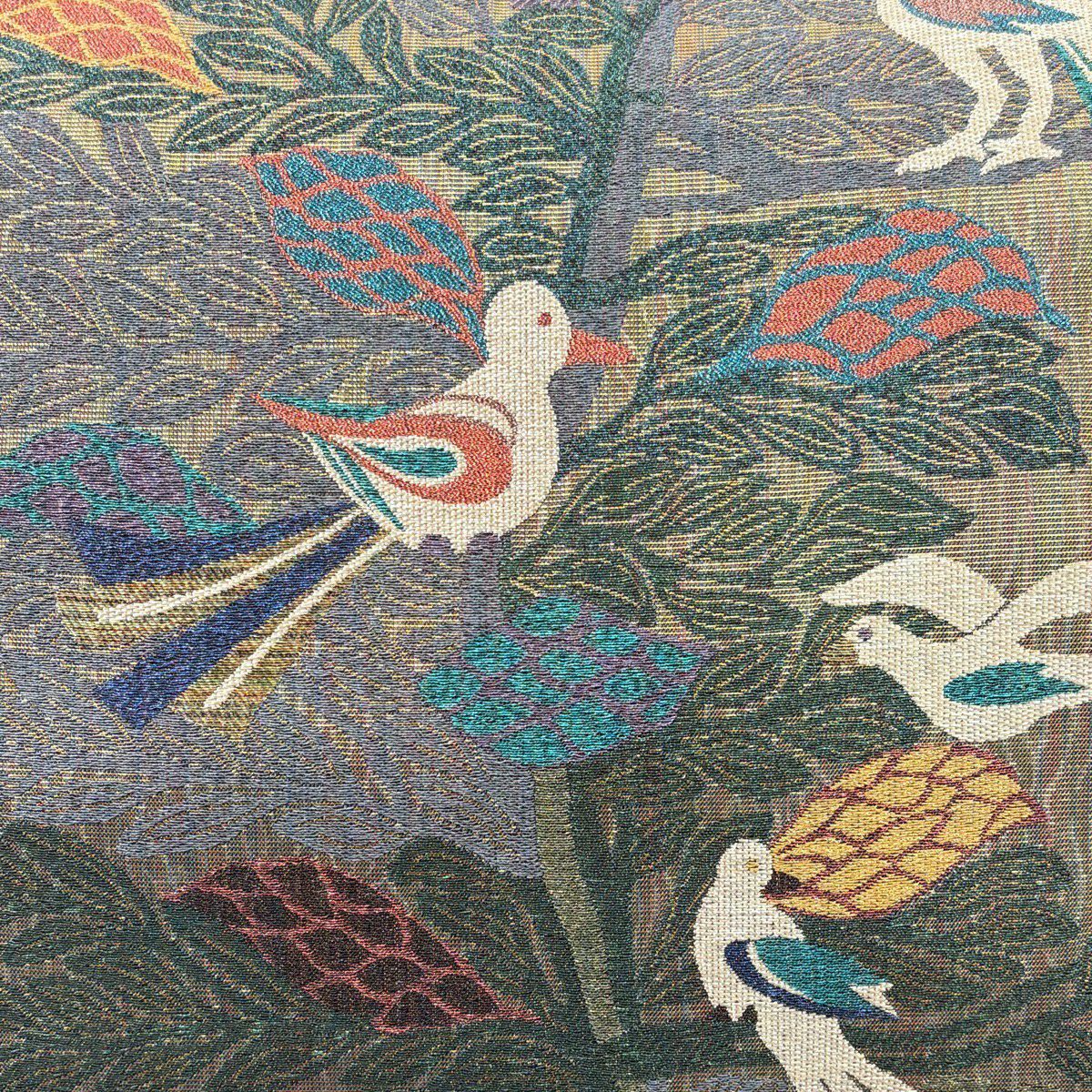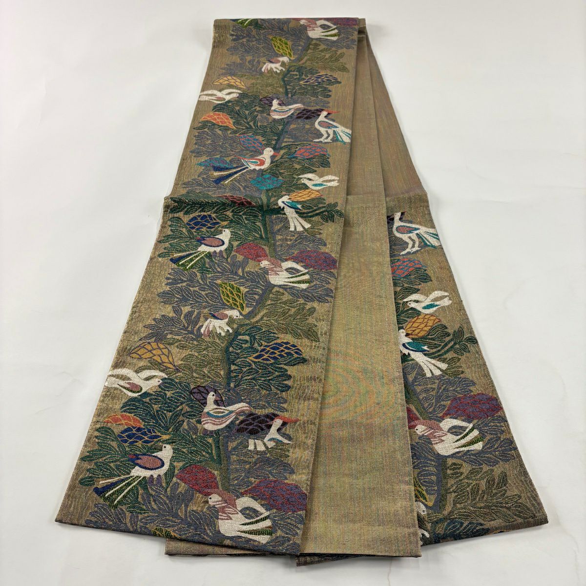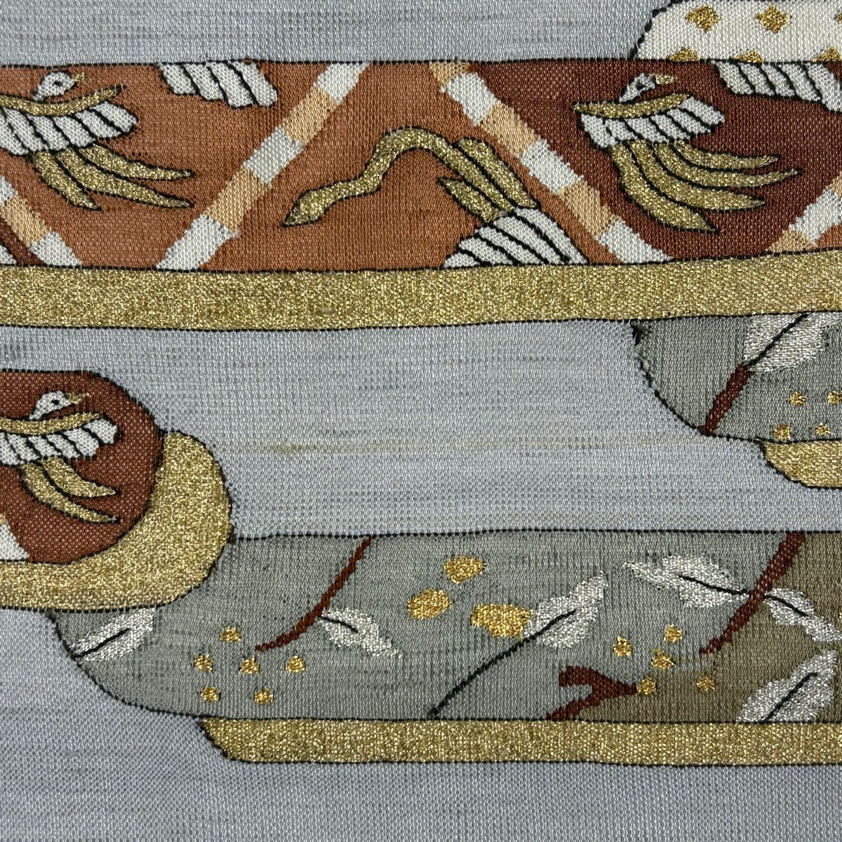 袋帯 逸品 白綾苑大庭 落款あり 花喰い鳥 箔 薄茶色 六通 正絹