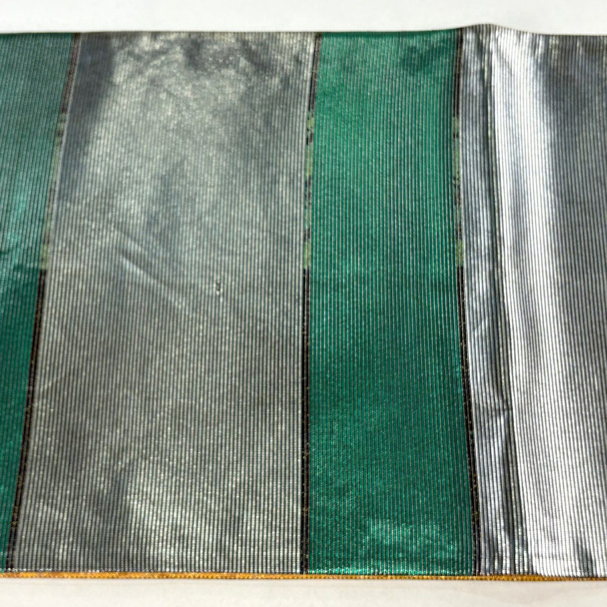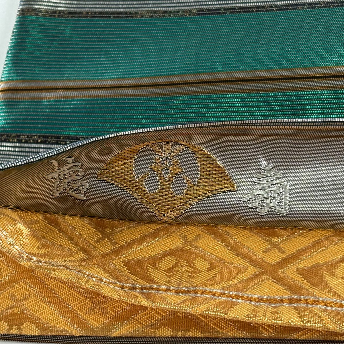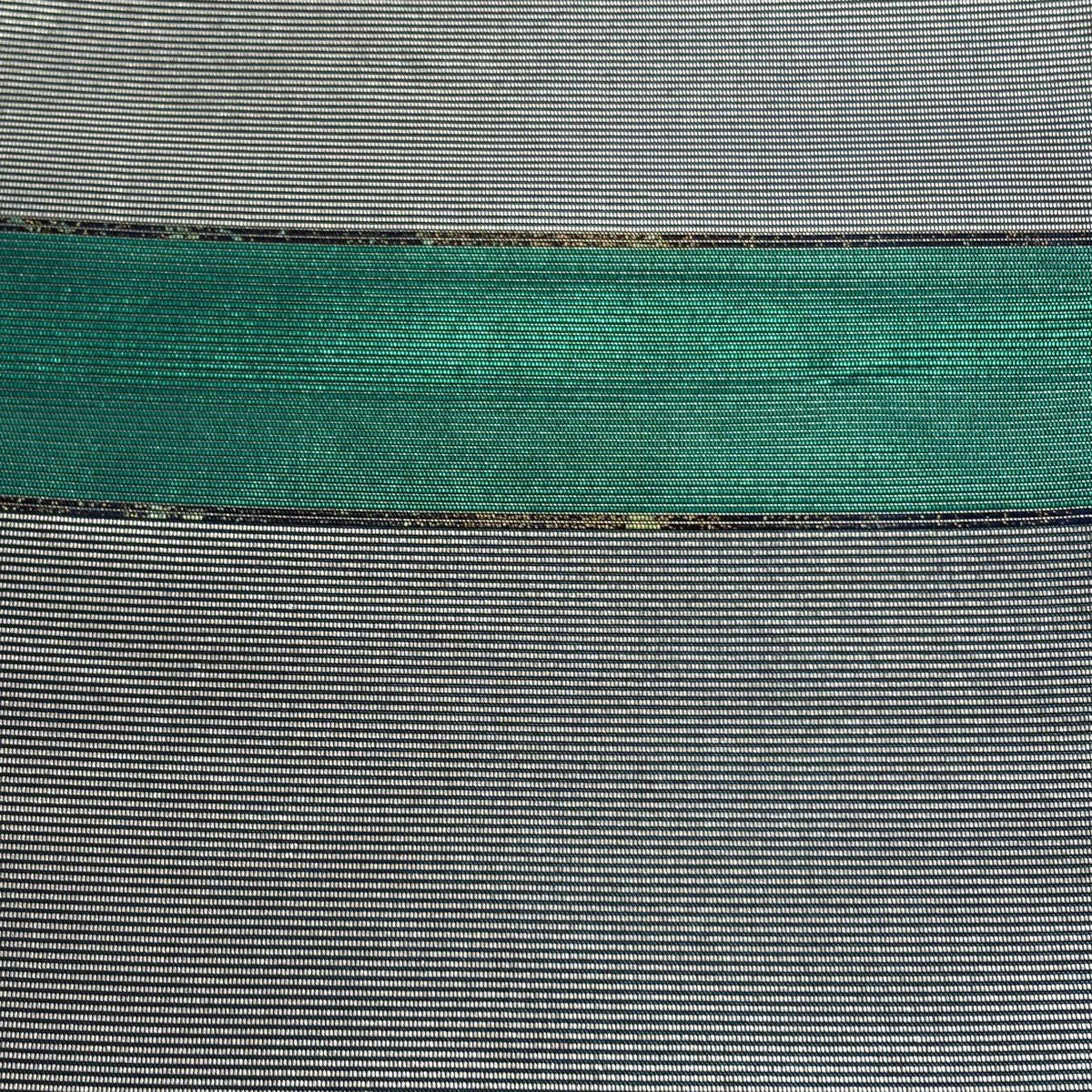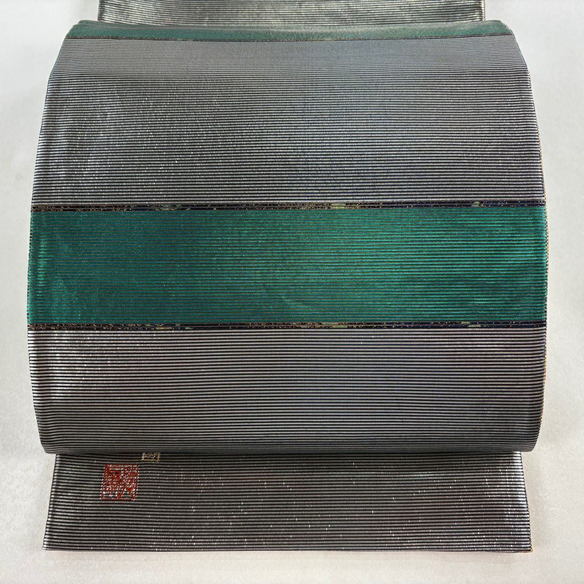 【美品】 袋帯 逸品 藤林徳扇 落款あり 段縞 箔 緑 全通 正絹