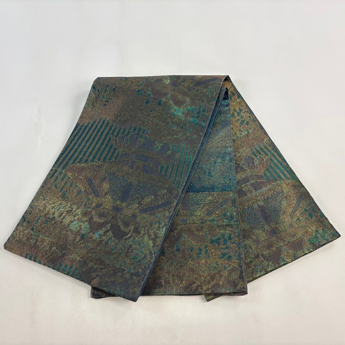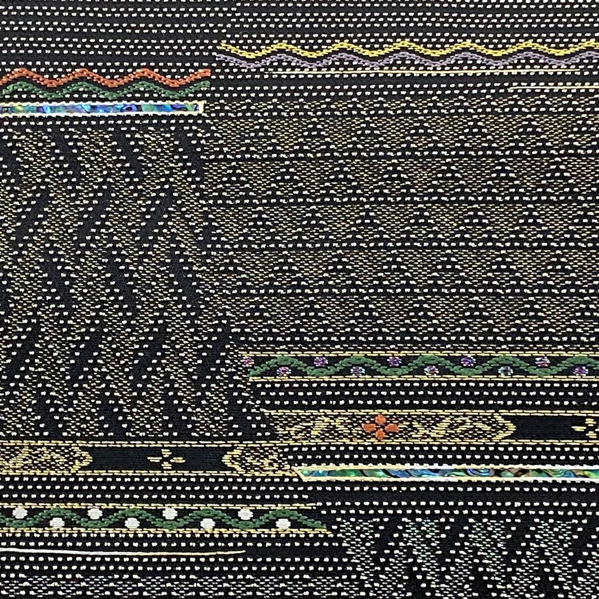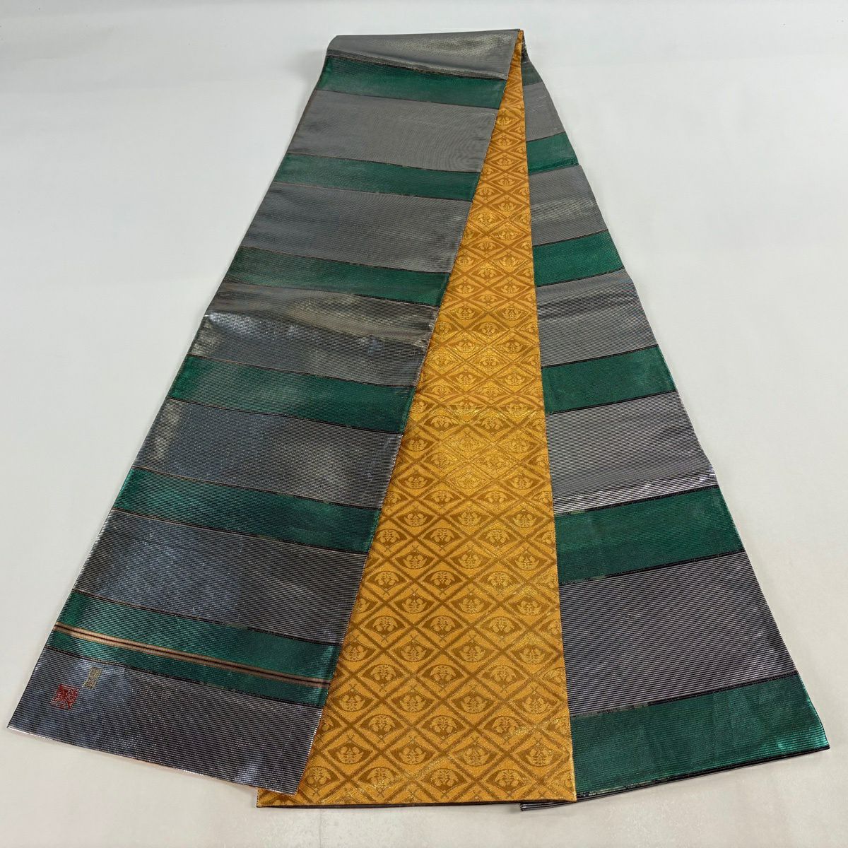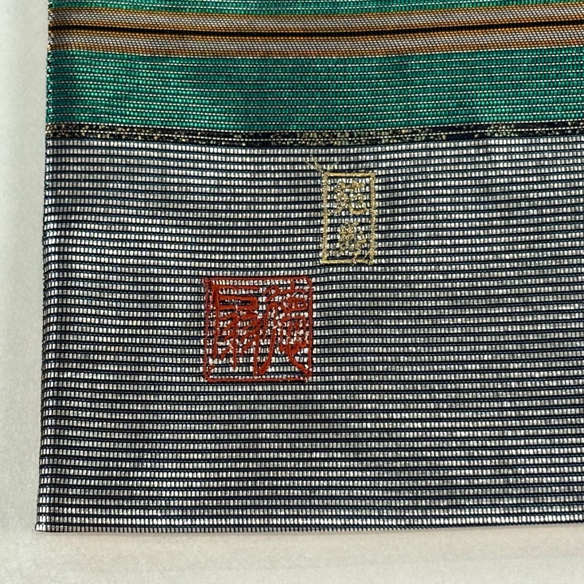【美品】 袋帯 逸品 藤林徳扇 落款あり 段縞 箔 緑 全通 正絹