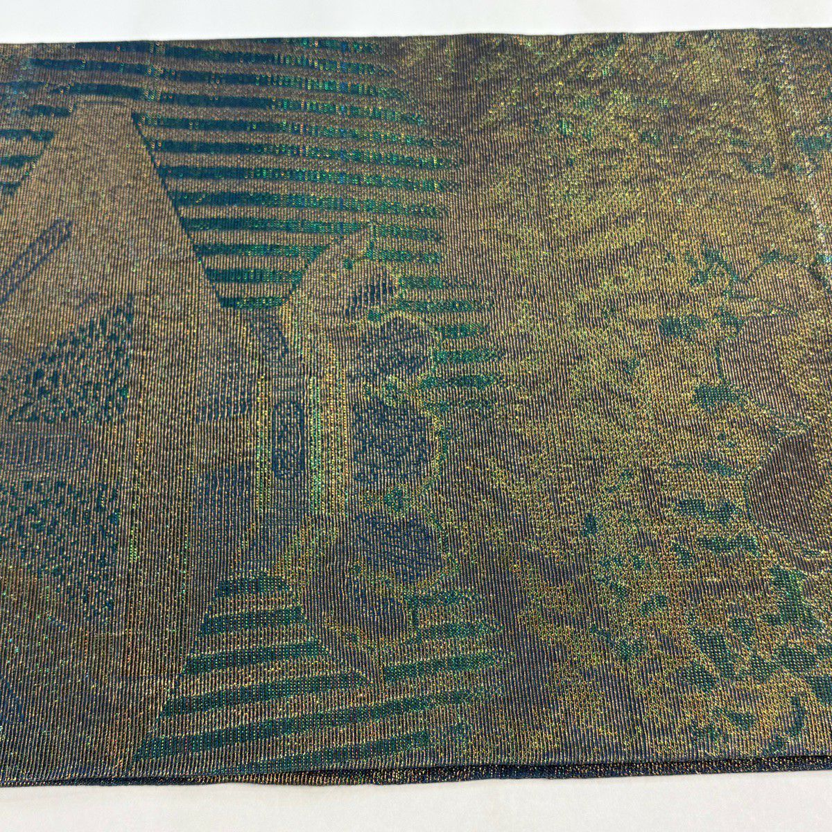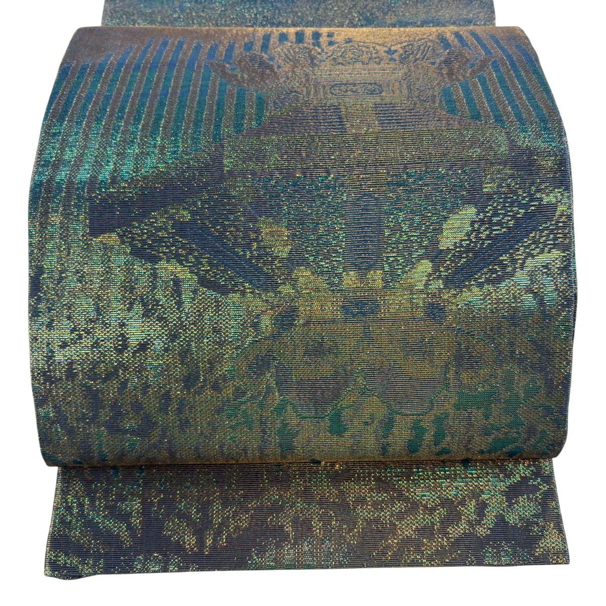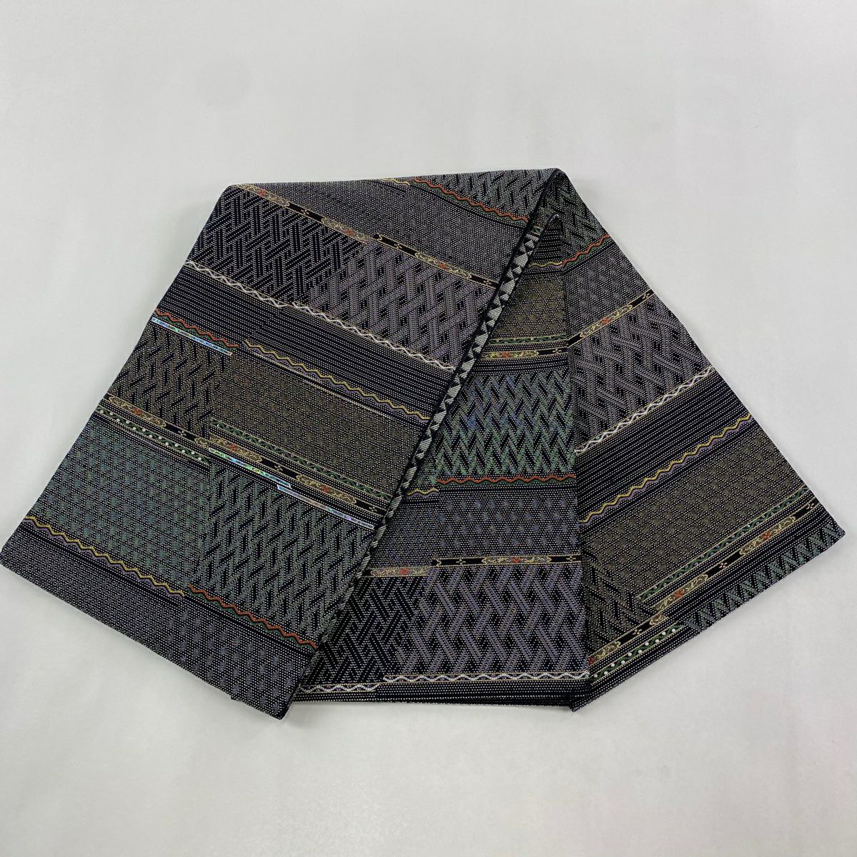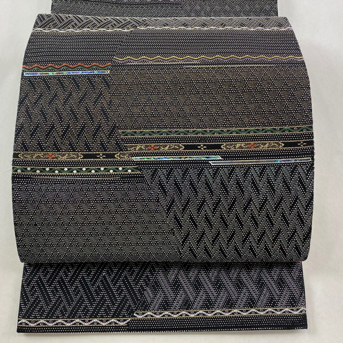 【美品】 袋帯 逸品 藤林徳扇 落款あり 段縞 箔 緑 全通 正絹