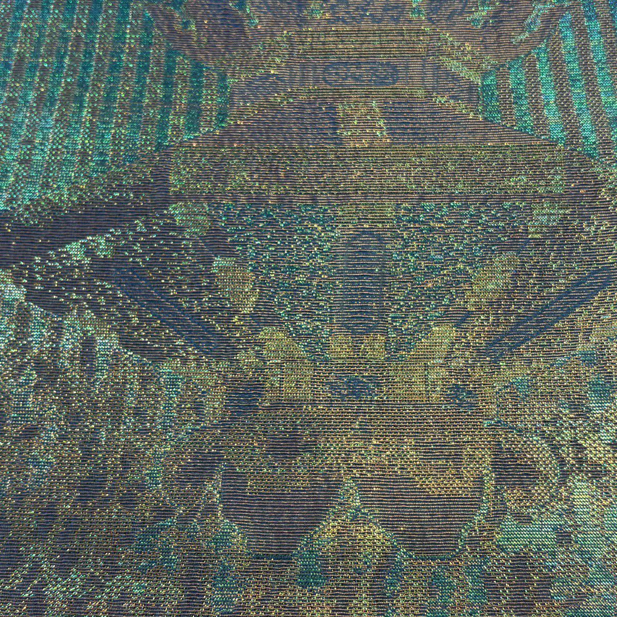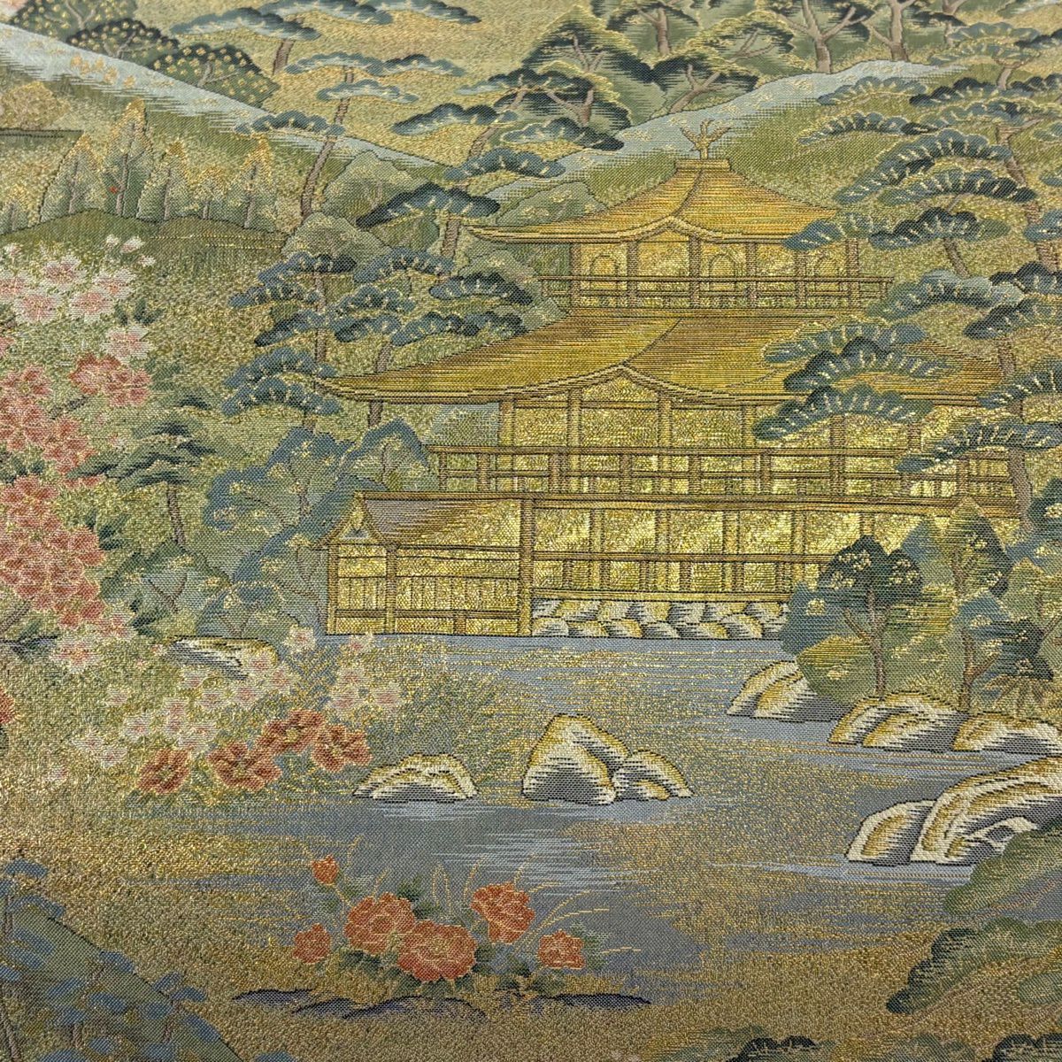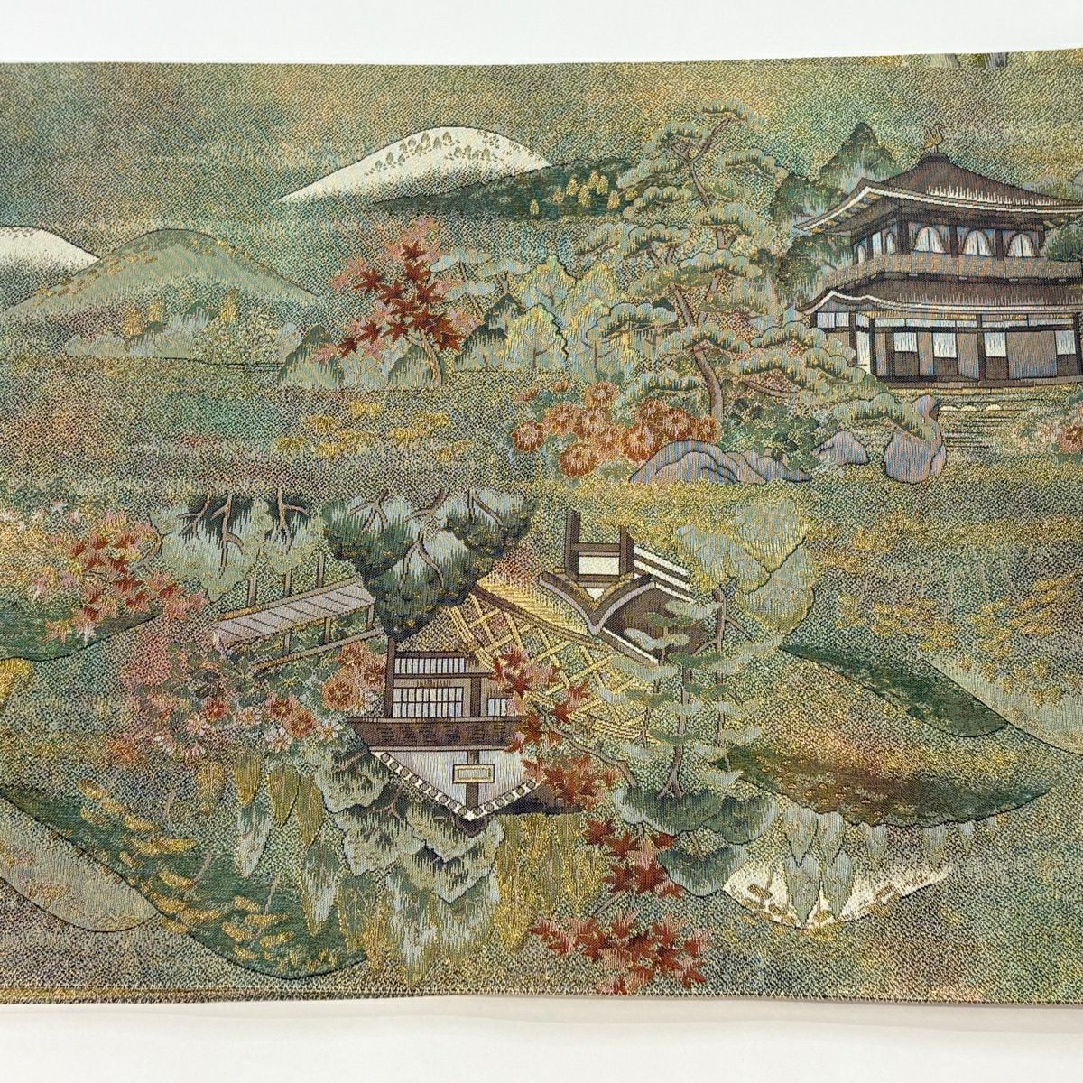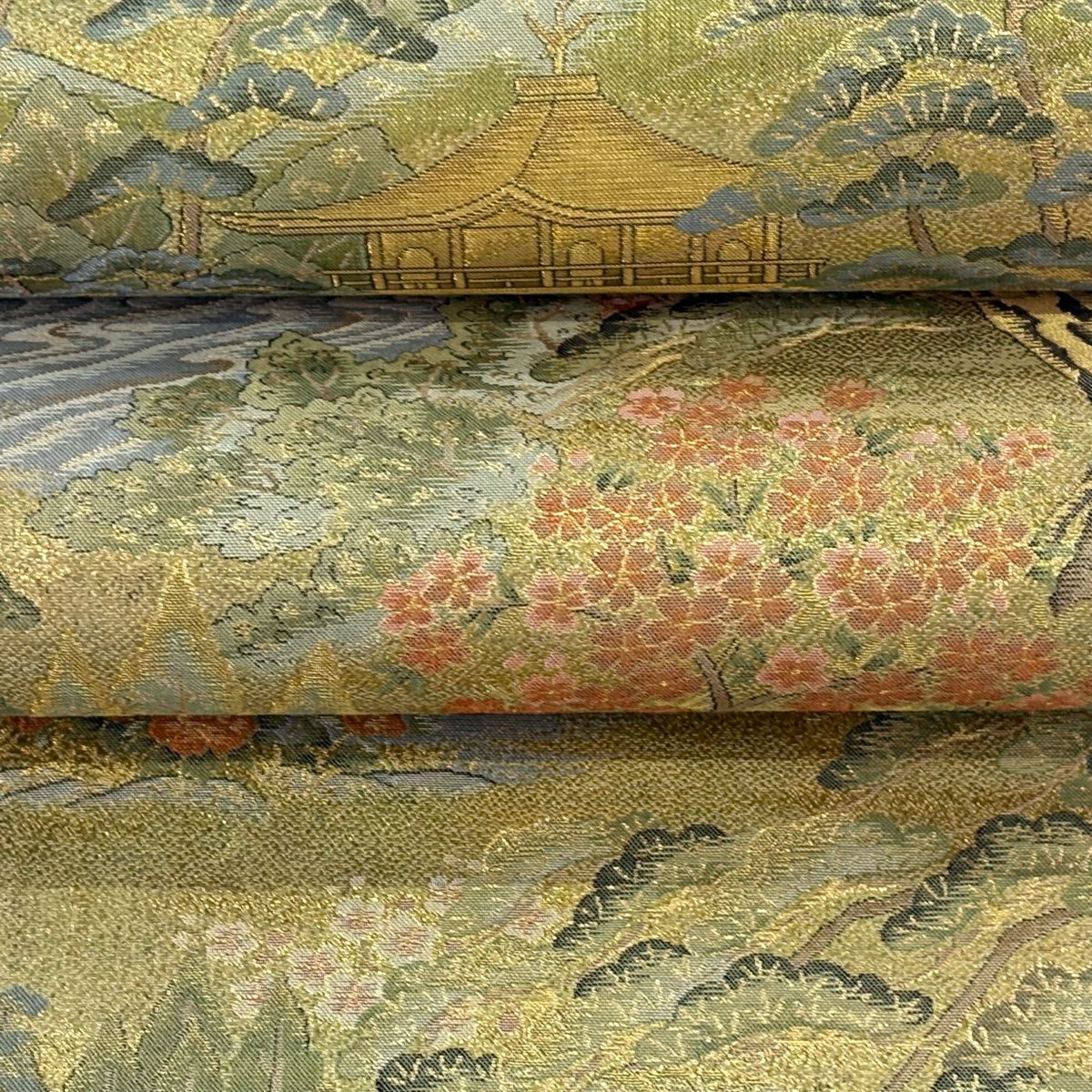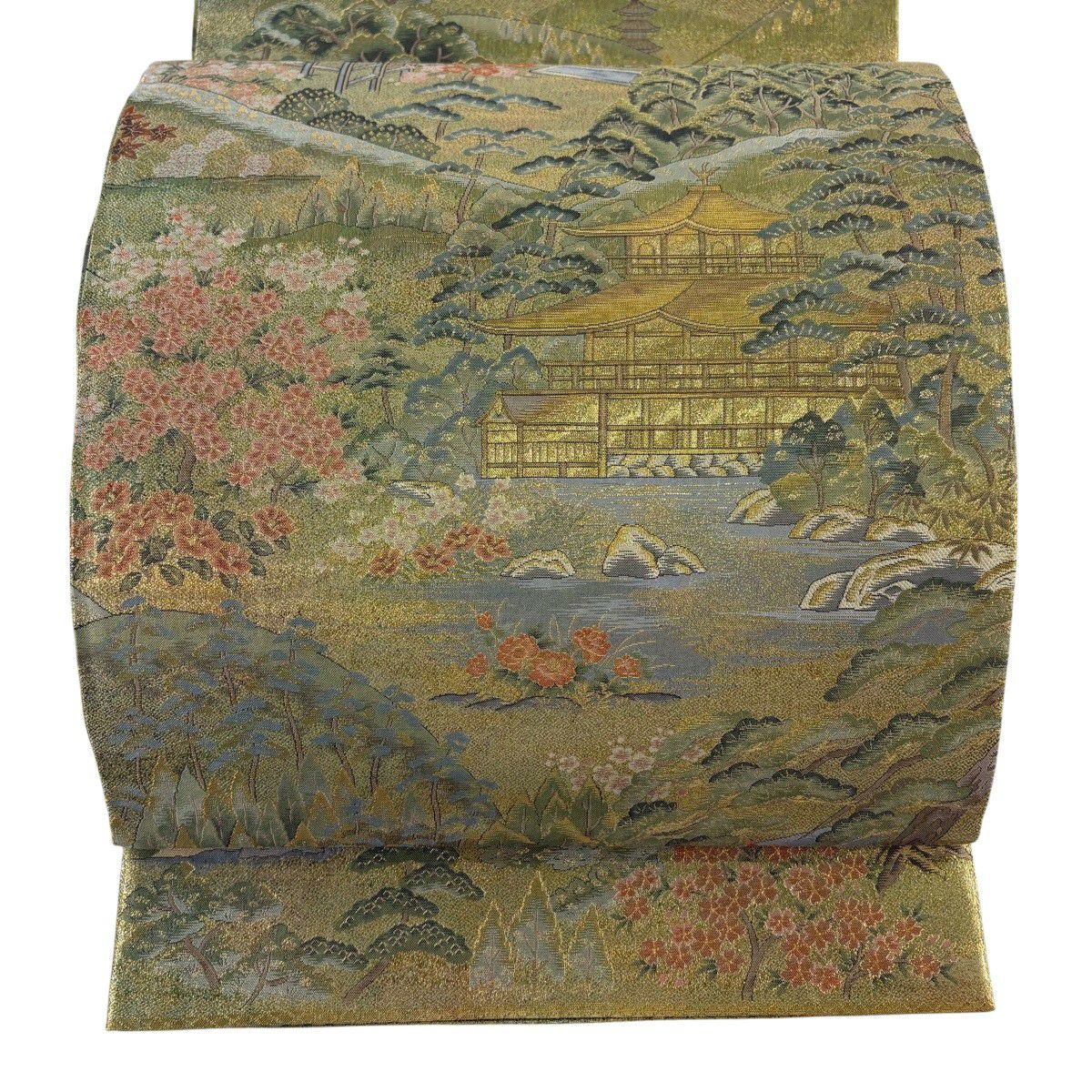 【美品】 丸帯 逸品 京名所 建物 金糸 箔 薄緑 お太鼓柄 正絹