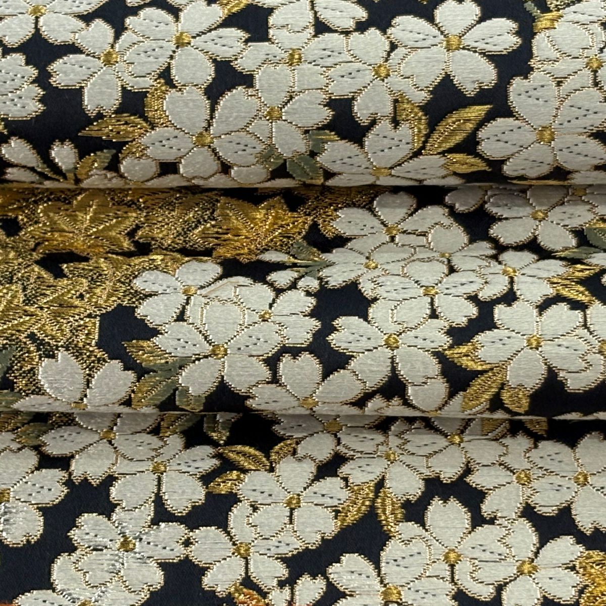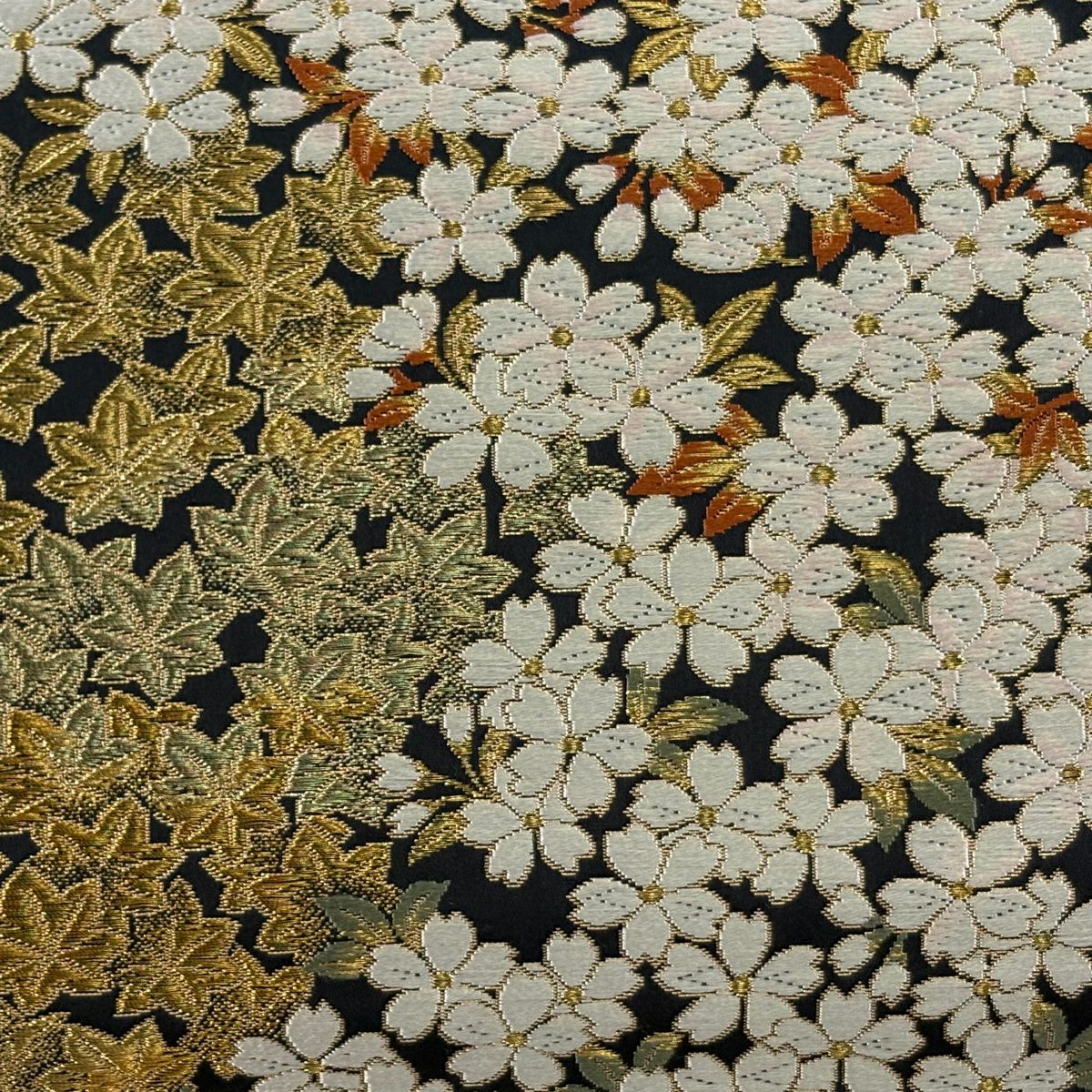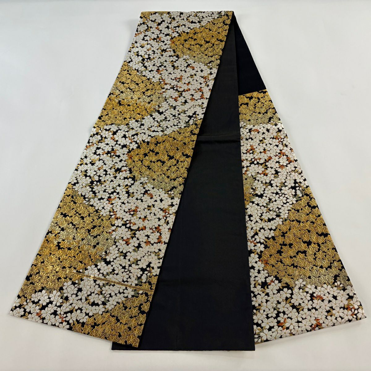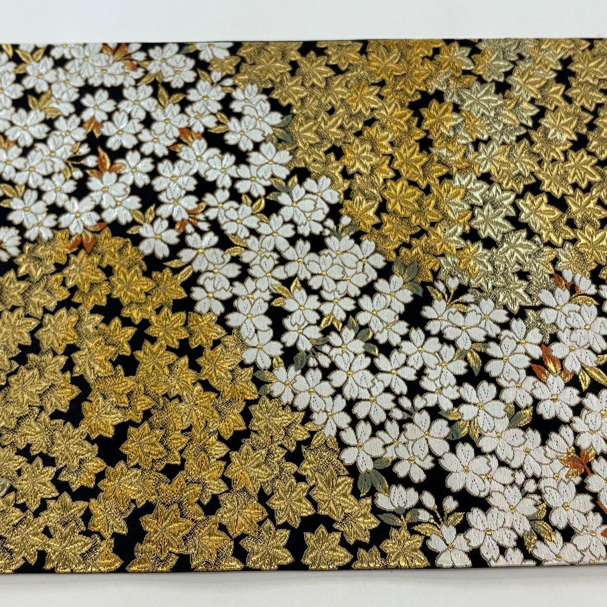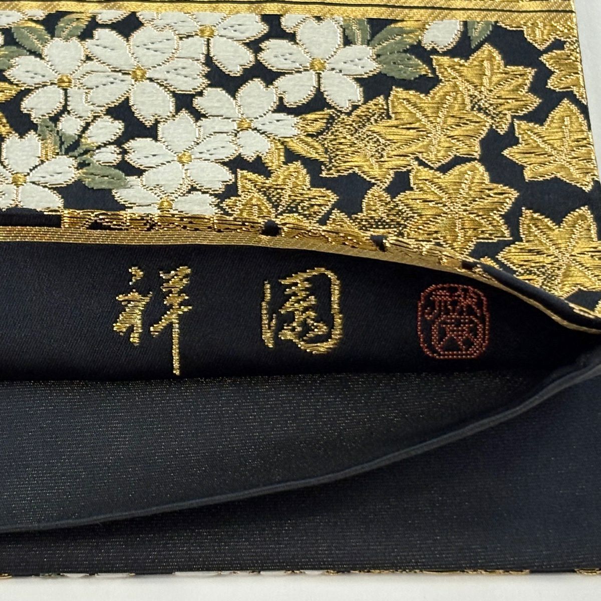 【美品】 袋帯 逸品 祥園 落款あり 桜 楓 金糸 黒 六通 正絹