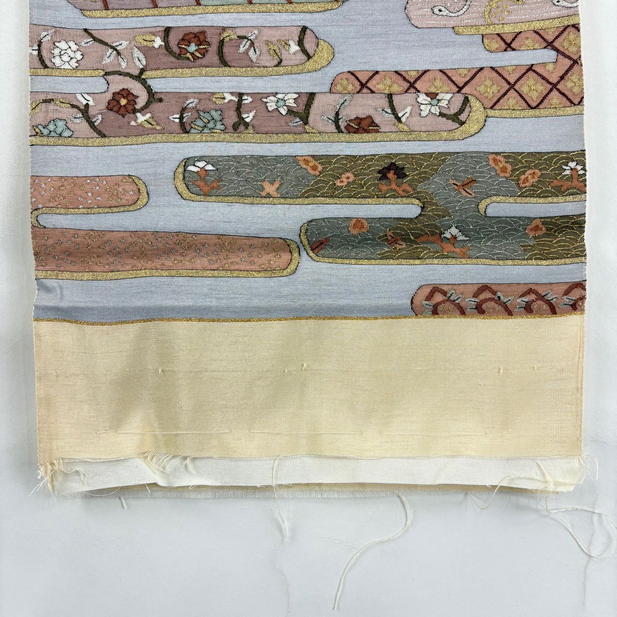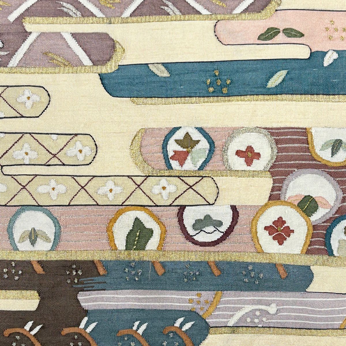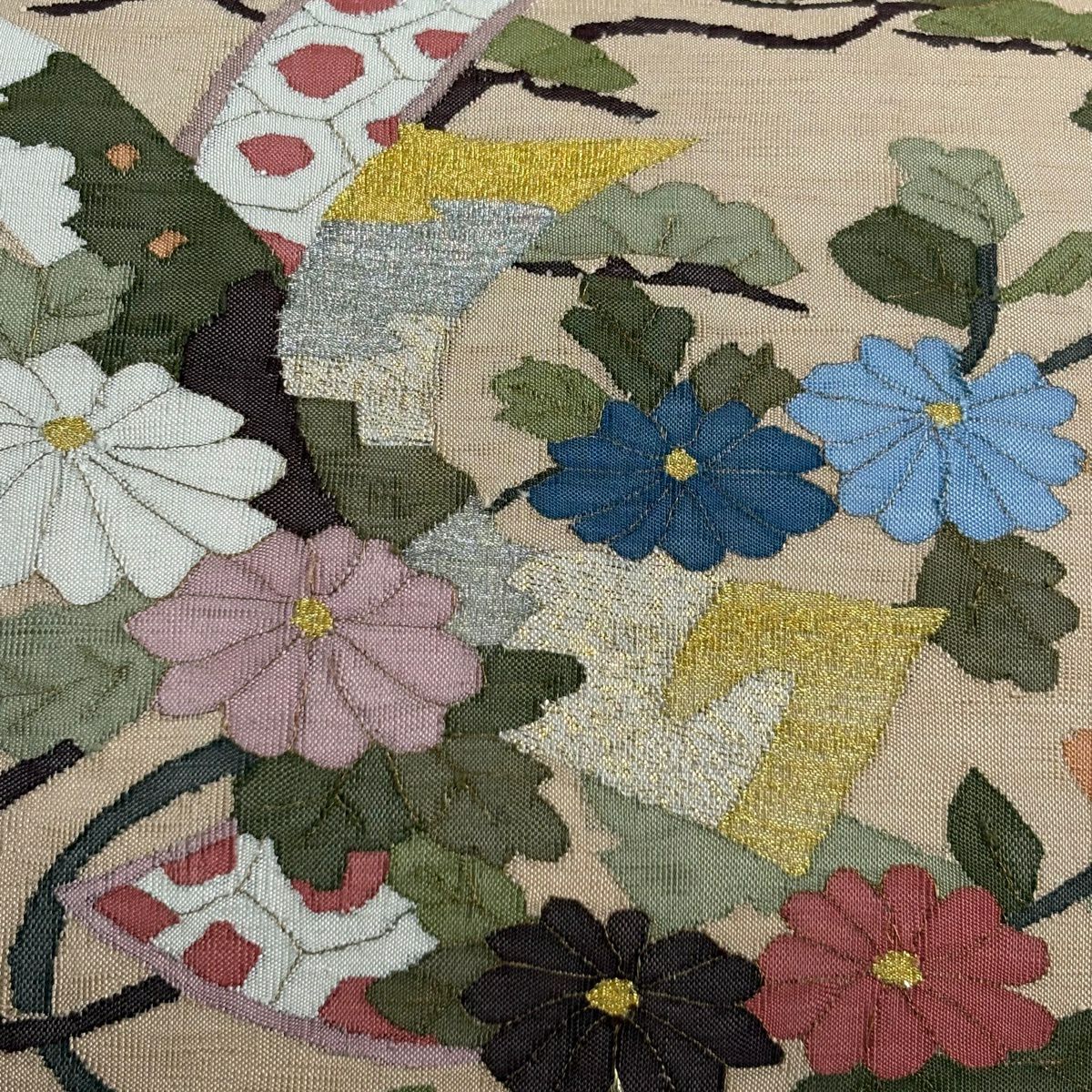 袋帯 逸品 ヱ霞 草花 金銀糸 綴れ ベージュ お太鼓柄 正絹