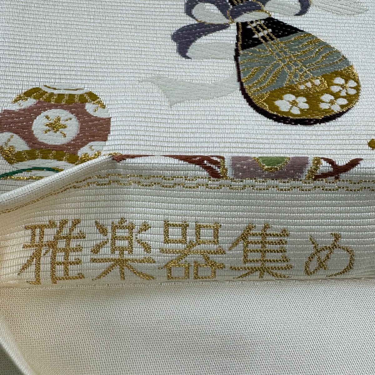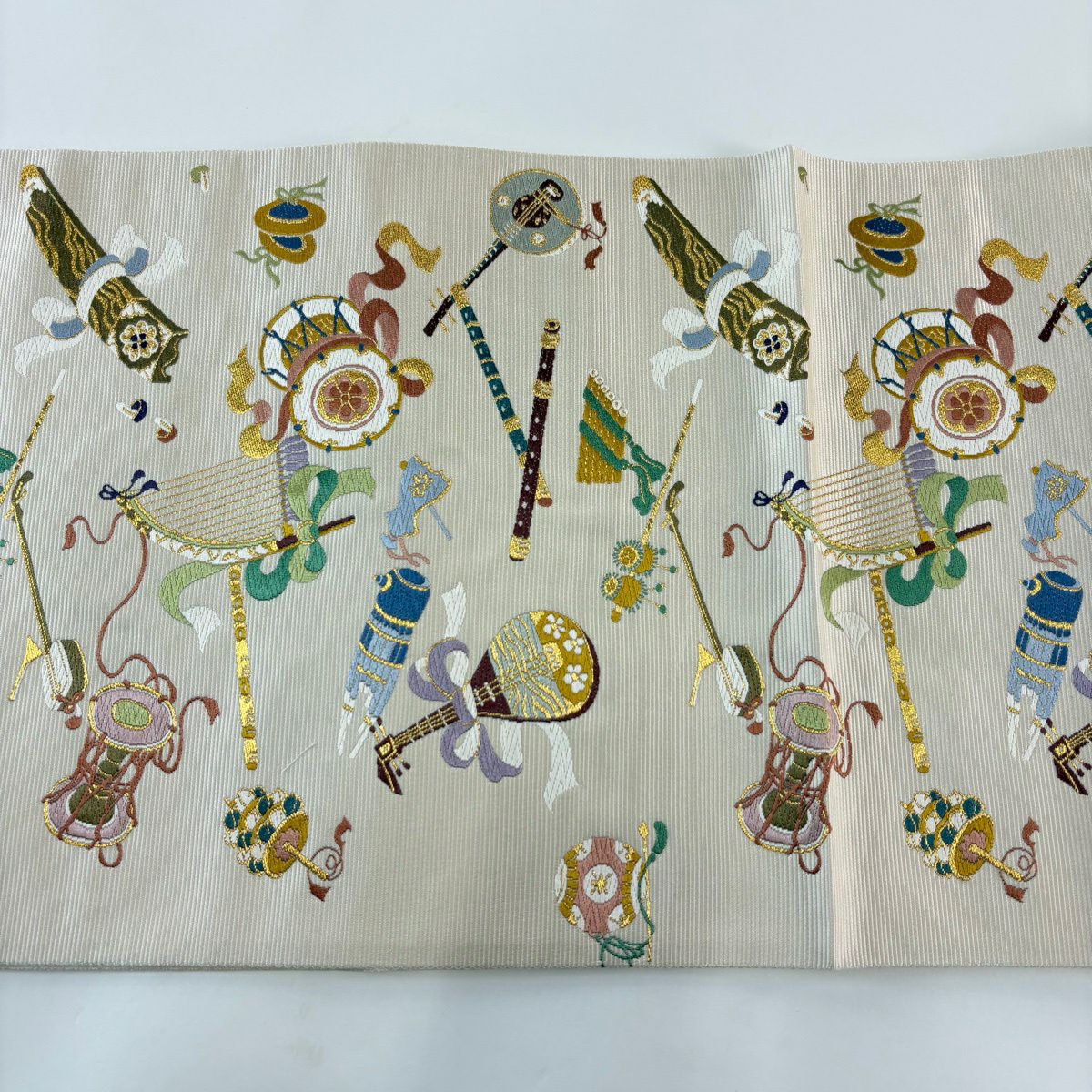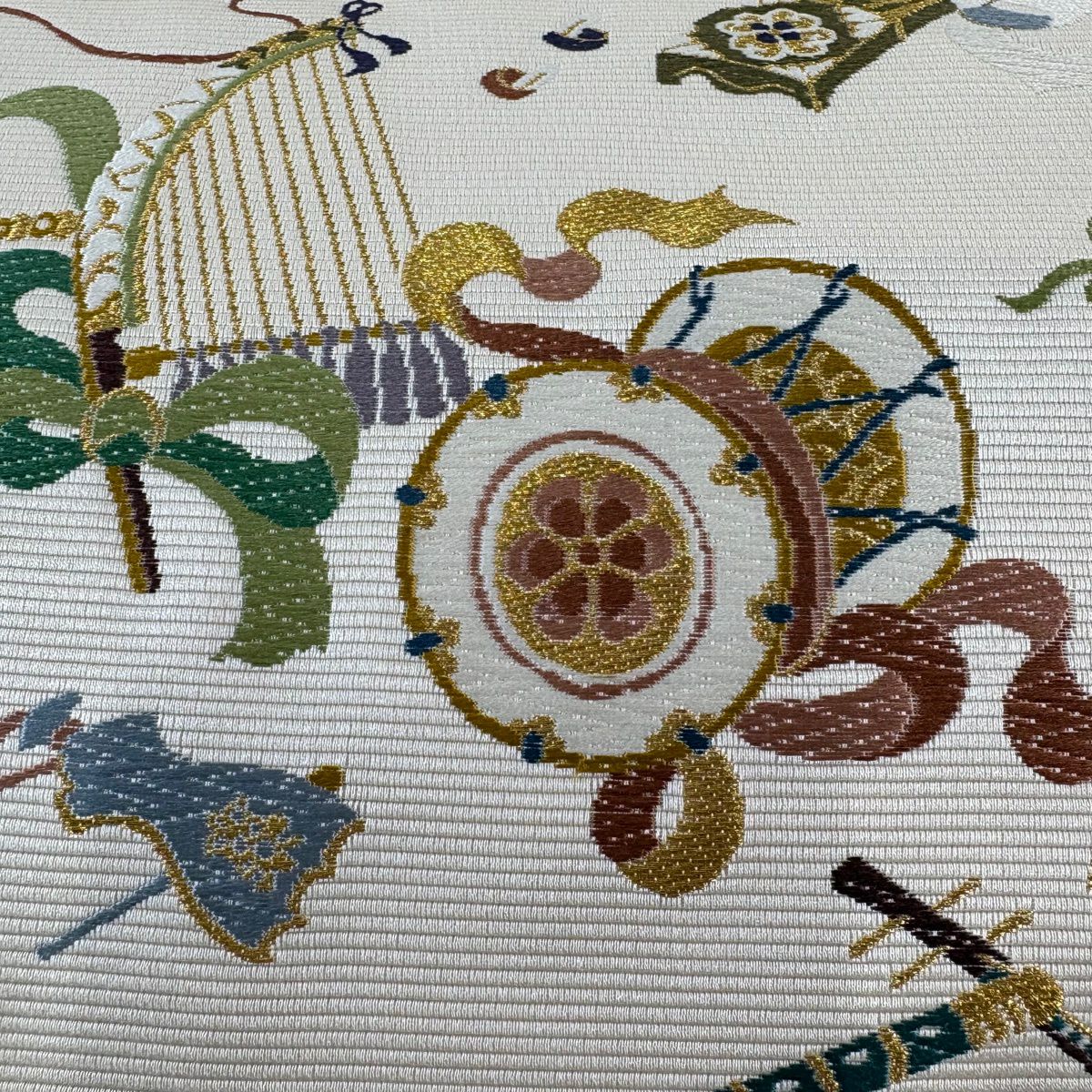 【美品】 袋帯 逸品 和楽器 刺繍 金糸 ベージュ 六通 正絹
