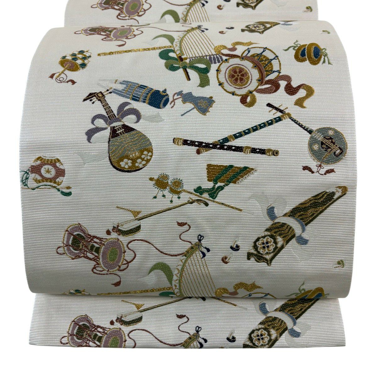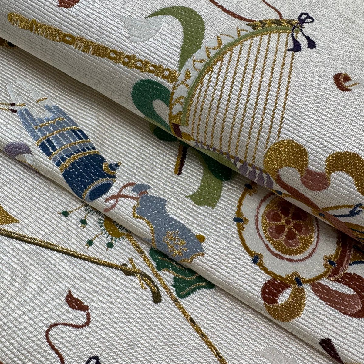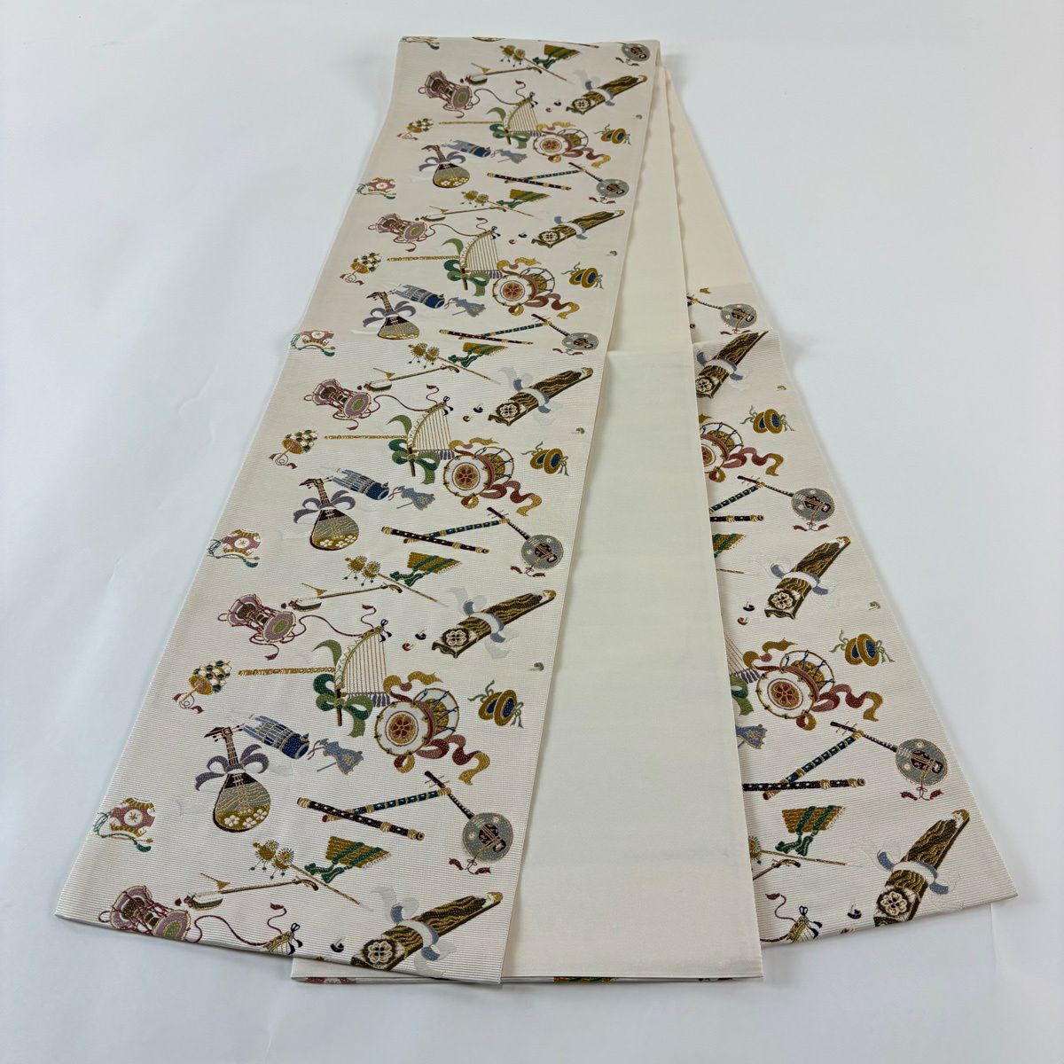 【美品】 袋帯 逸品 和楽器 刺繍 金糸 ベージュ 六通 正絹