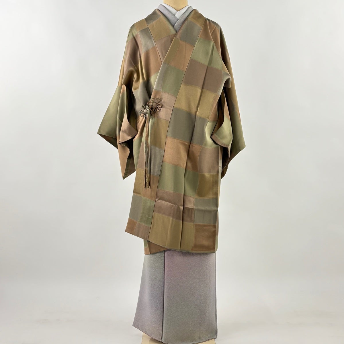 【美品】 道中着 身丈108cm 裄丈66.5cm M 和装コート 幾何学 茶緑色 正絹 逸品