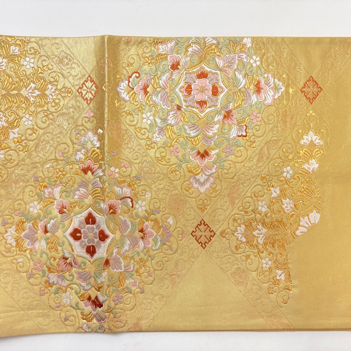 袋帯 秀品 正倉院横段瑞華文 金糸 箔 金茶 お太鼓柄 正絹