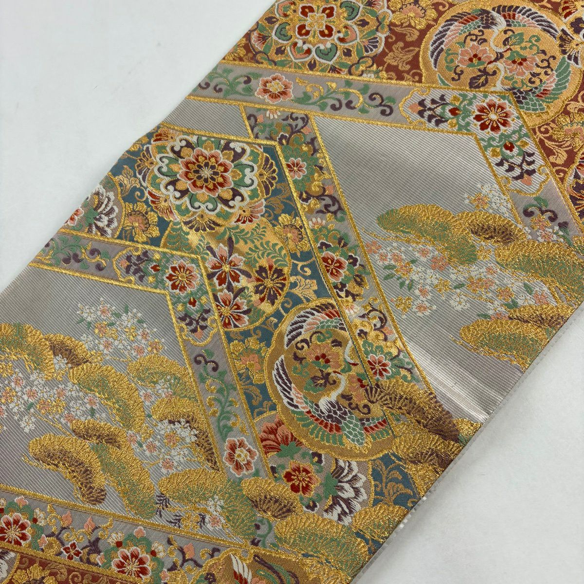 【美品】 袋帯 秀品 鶴 菊 金糸 箔 銀色 六通 正絹