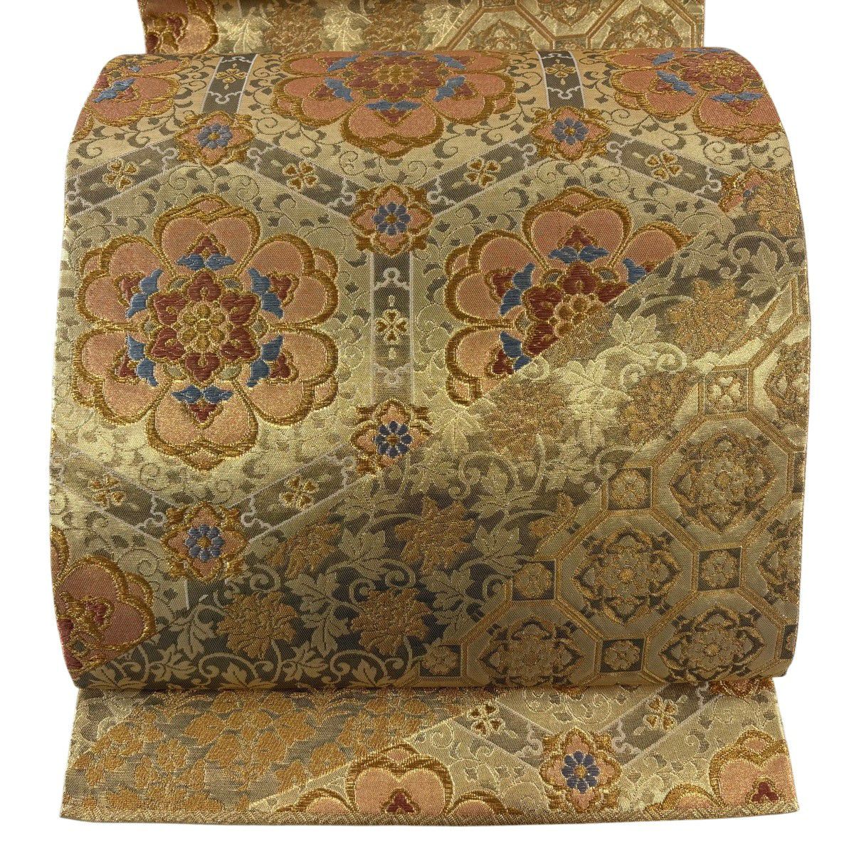 袋帯 逸品 花唐草 幾何学模様 箔 金色 お太鼓柄 正絹