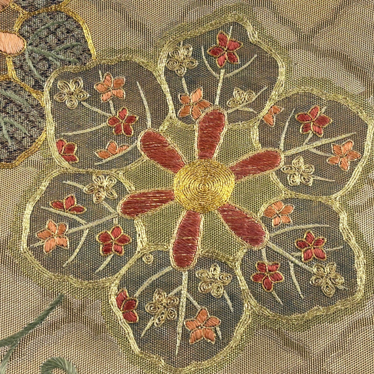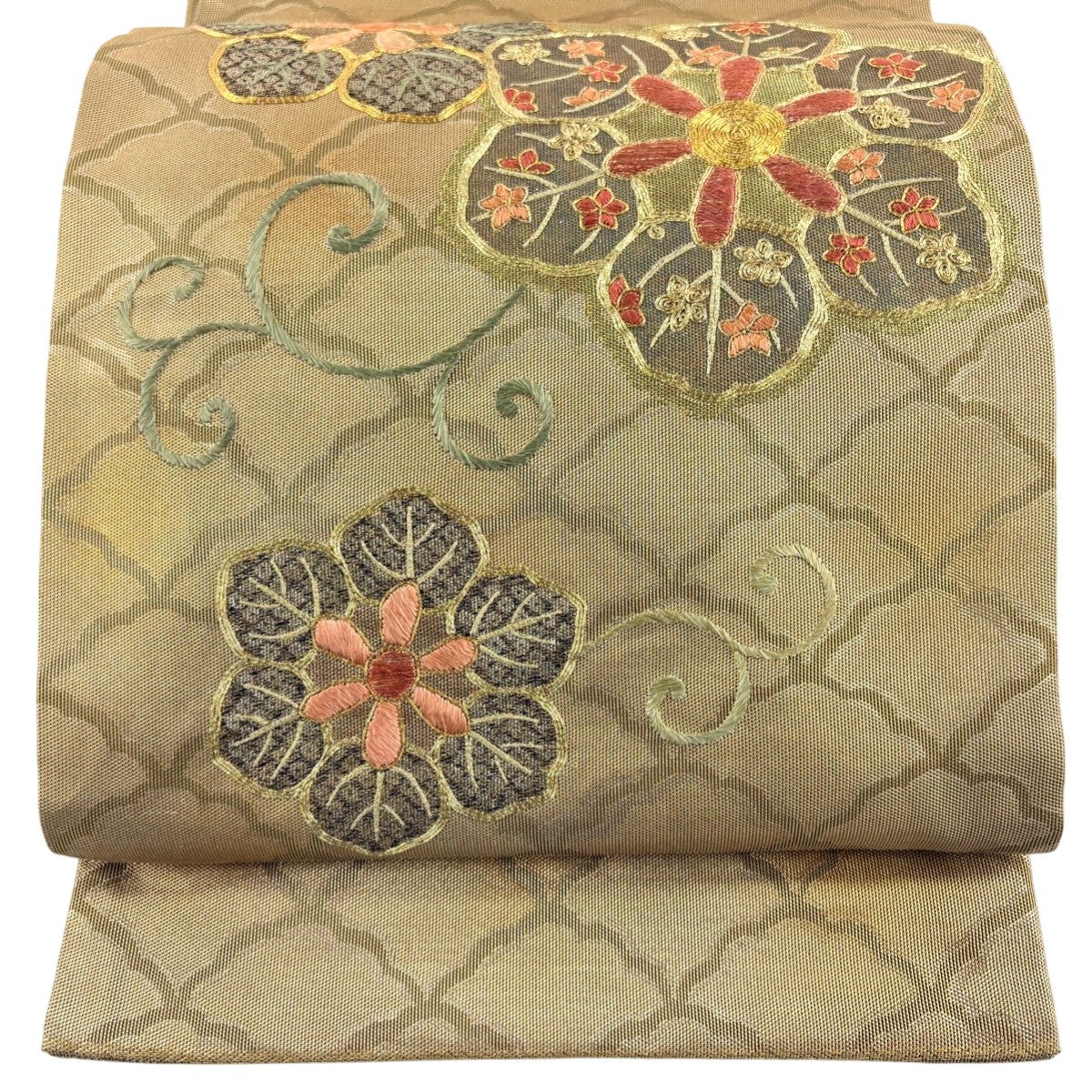 袋帯 秀品 夏帯 草花 松皮菱 金銀糸 金色 お太鼓柄 正絹