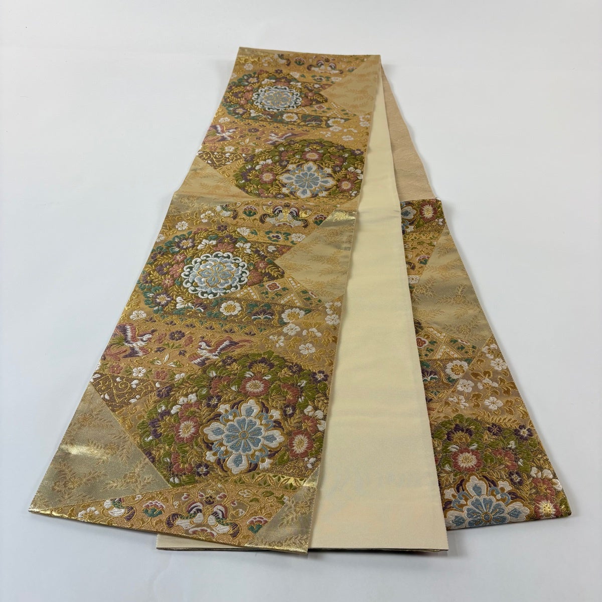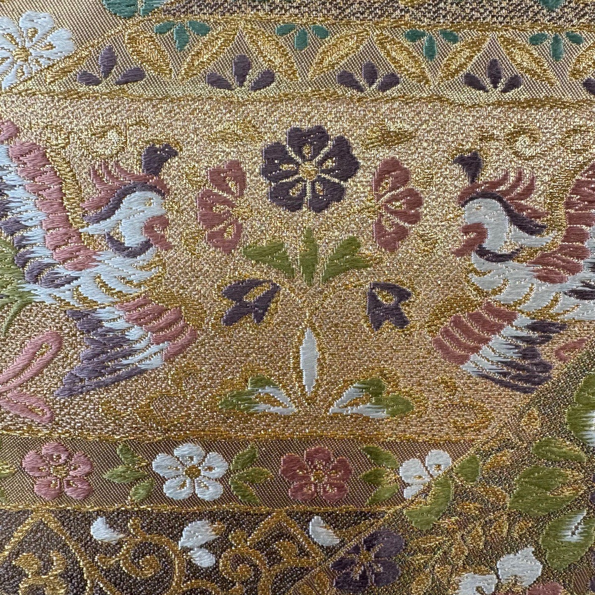 【美品】 袋帯 秀品 華文 花鳥 金糸 箔 金色 六通 正絹