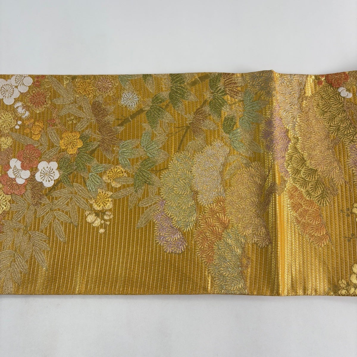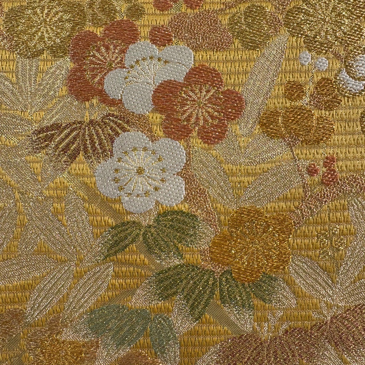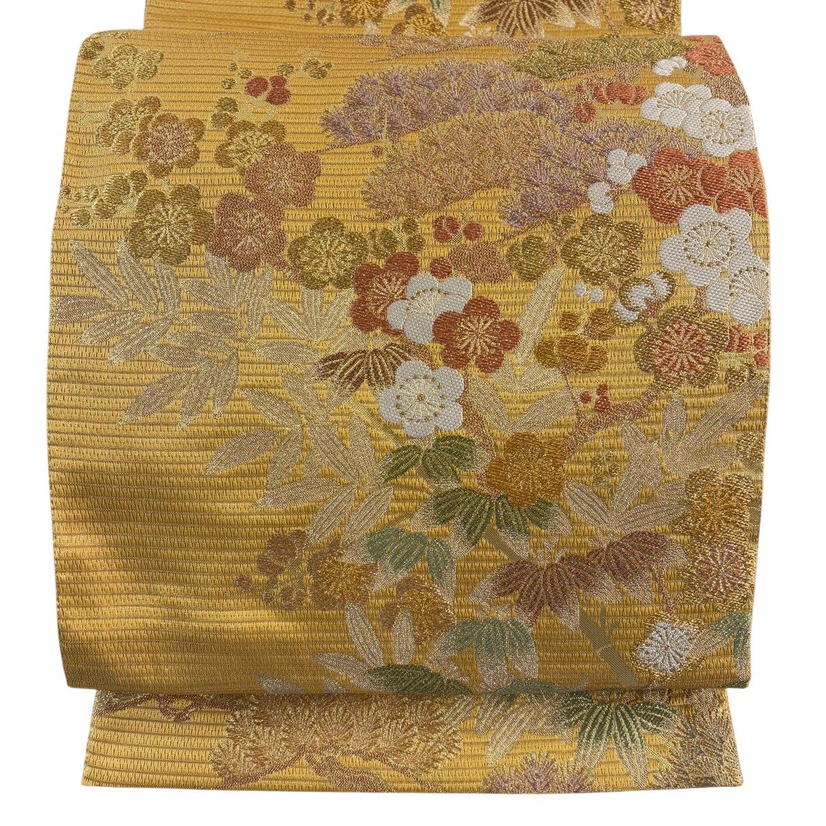 【美品】 袋帯 秀品 糸巻き 松竹梅 金銀糸 箔 金色 全通 正絹