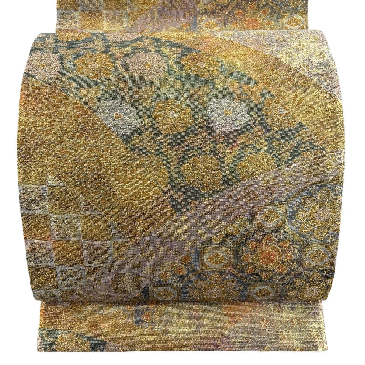 【美品】 袋帯 名品 七宝文 市松 金糸 輪奈織 金色 六通 正絹