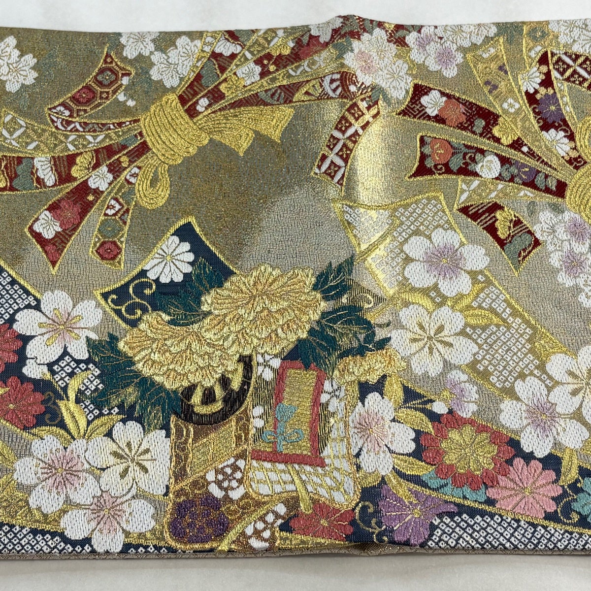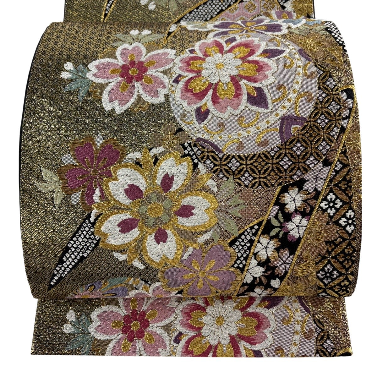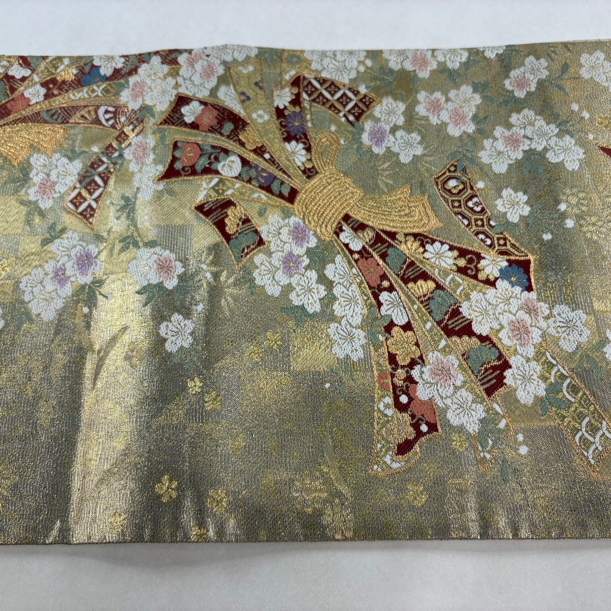 【美品】 袋帯 秀品 振袖向き 桜 花びら 箔 金色 六通 正絹