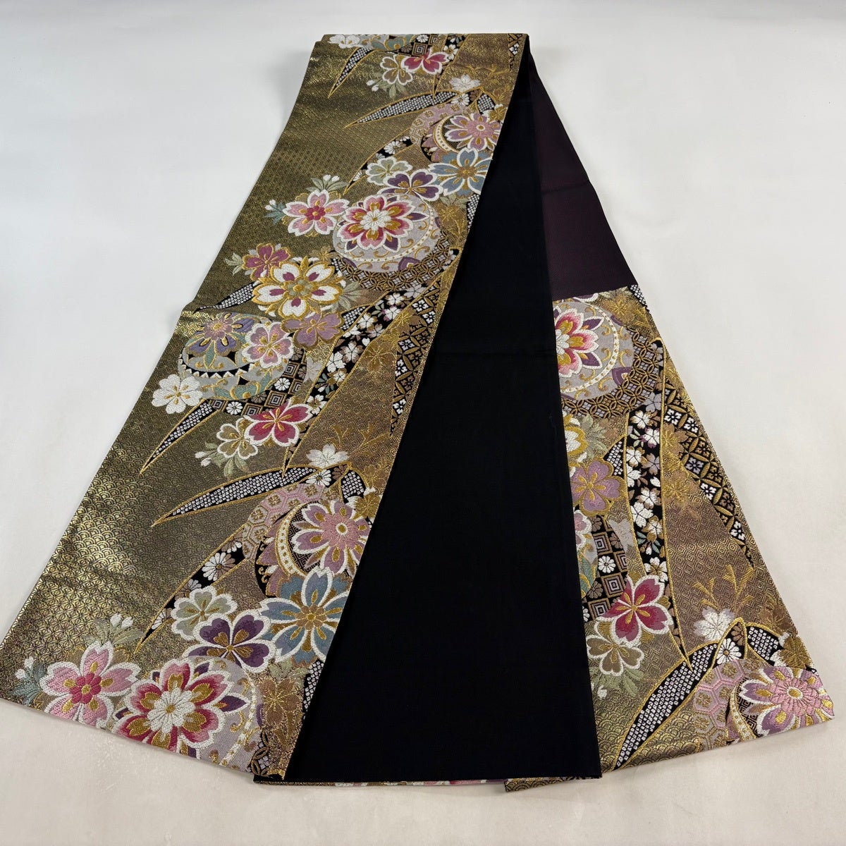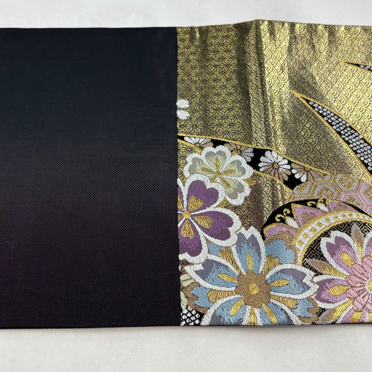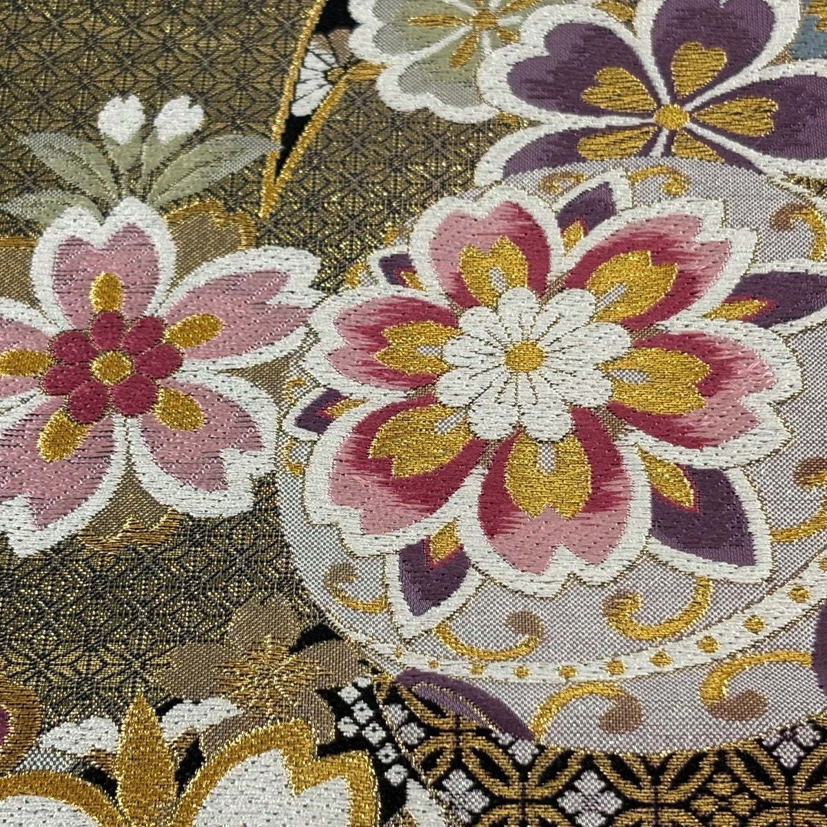 【美品】 袋帯 秀品 振袖向き 桜 花びら 箔 金色 六通 正絹