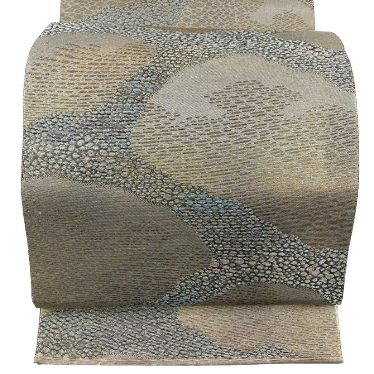 【美品】 名古屋帯 秀品 八寸名古屋帯 松葉仕立て 山 霞 金銀糸 銀色 正絹