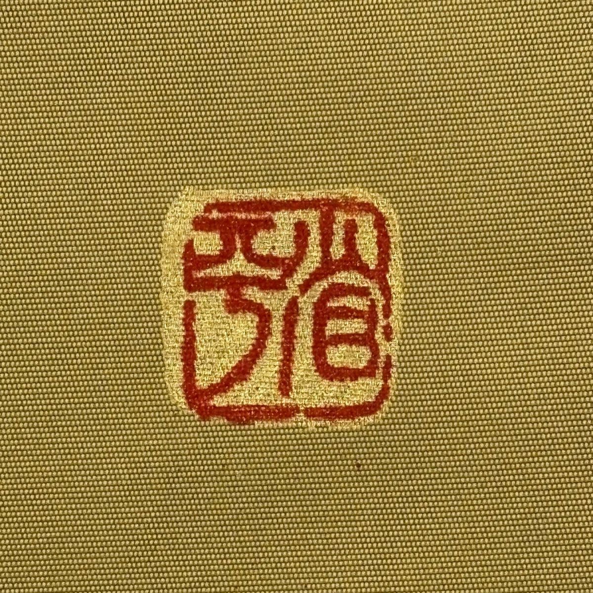 袋帯 名品 じゅらく 落款あり 清水六兵衛 草花 鏡裏文 金糸 刺繍 金茶 六通 正絹