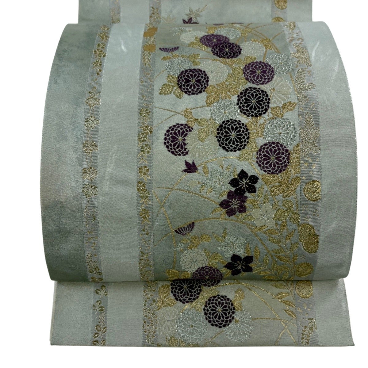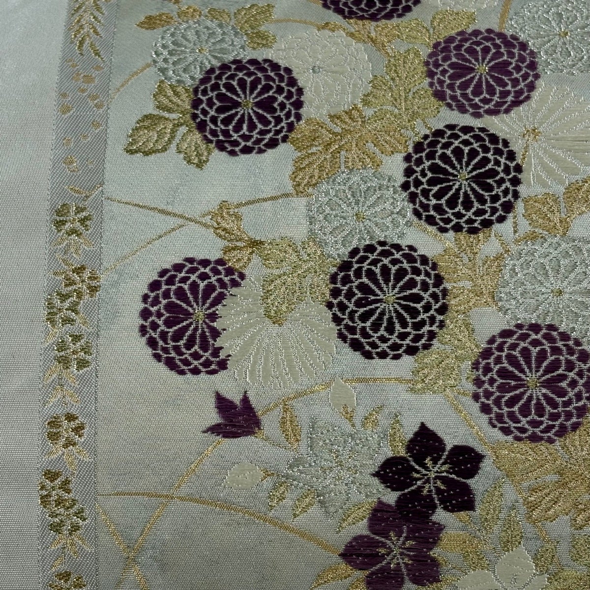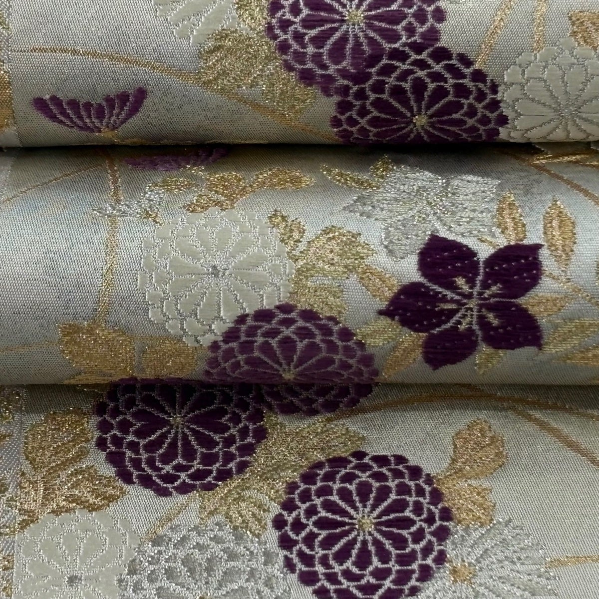 袋帯 逸品 落款あり 帝王紫 秋草蒔絵献上文 菊 唐織 金銀糸 銀色 お太鼓柄 正絹
