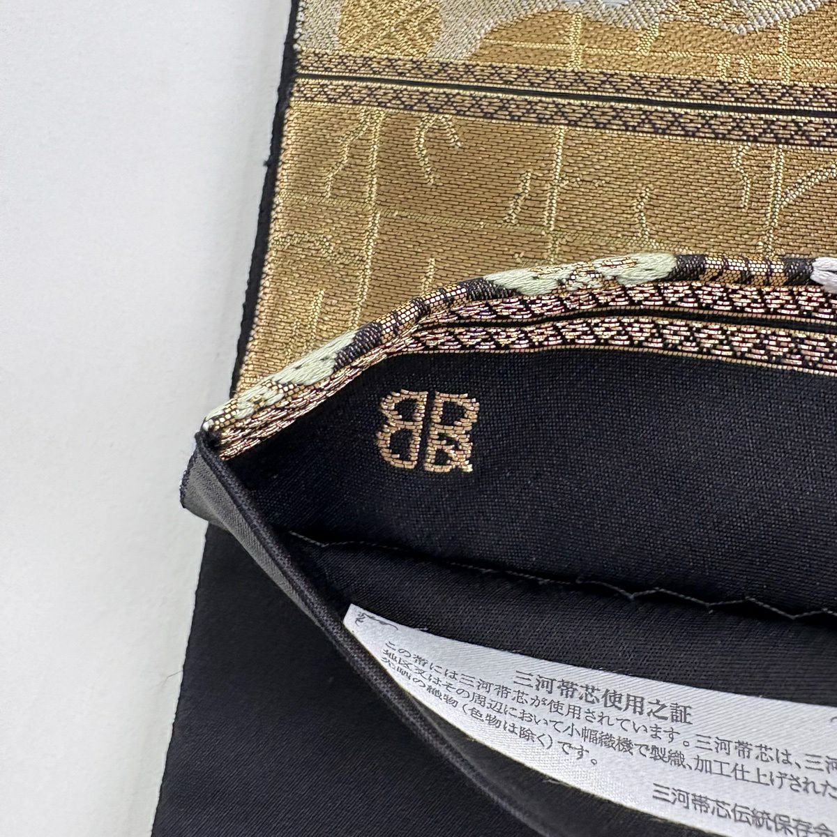 【在庫一掃】 袋帯 逸品 河合美術織物 落款あり 波 波頭 唐織 箔 金色 六通 正絹
