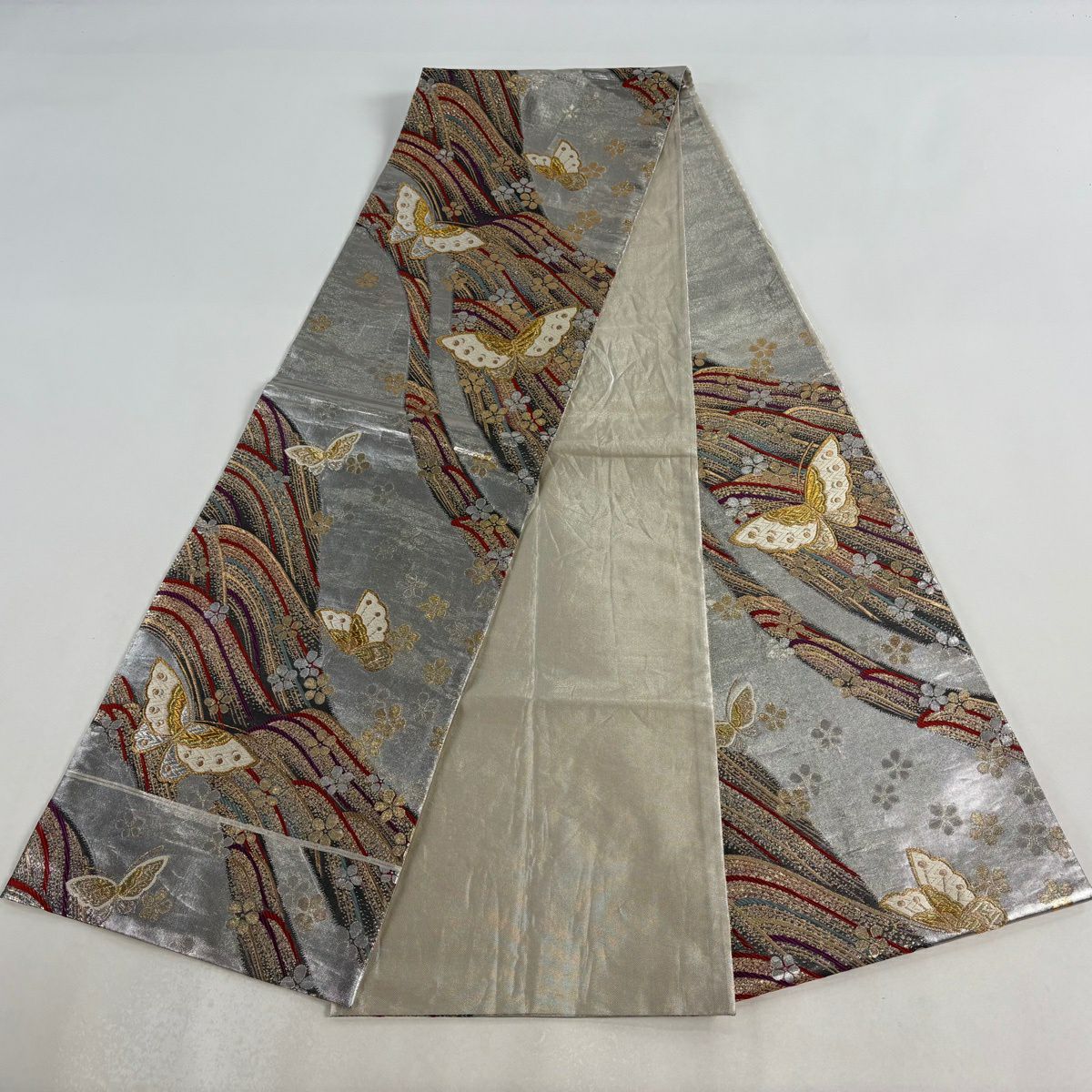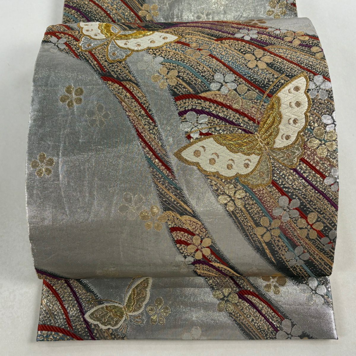 袋帯 秀品 落款あり 草花 蝶 螺鈿箔 銀色 お太鼓柄 正絹