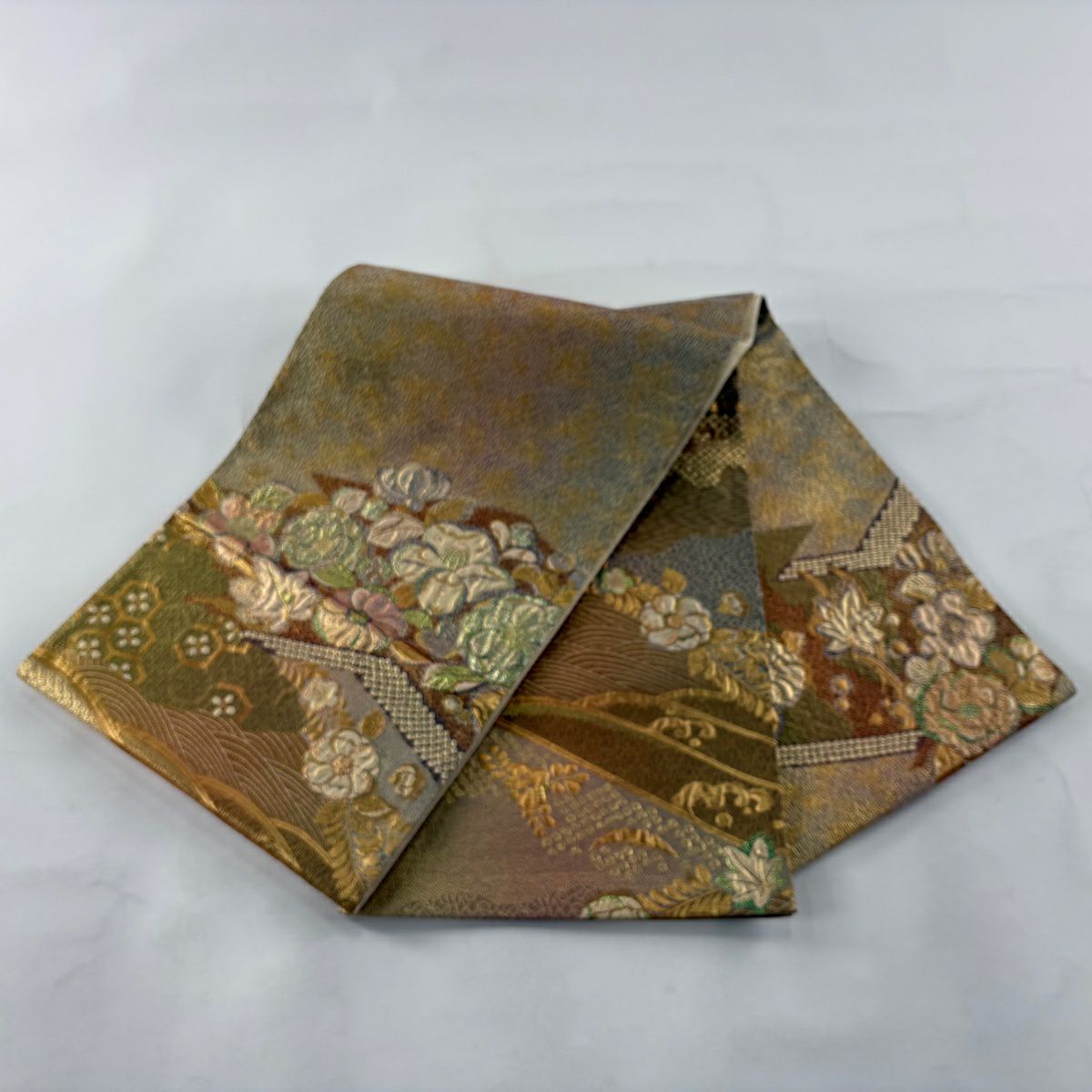 袋帯 秀品 草花 幾何学 箔 金糸 金色 六通 正絹