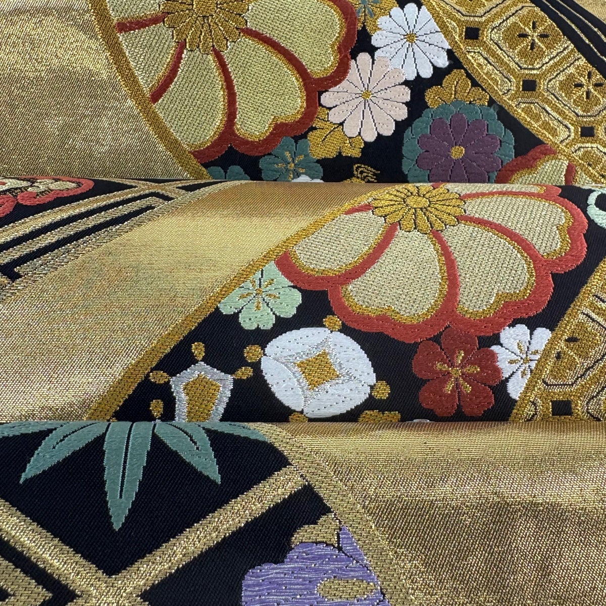 袋帯 逸品 花 松竹梅 刺繍 金銀糸 金茶 六通 正絹