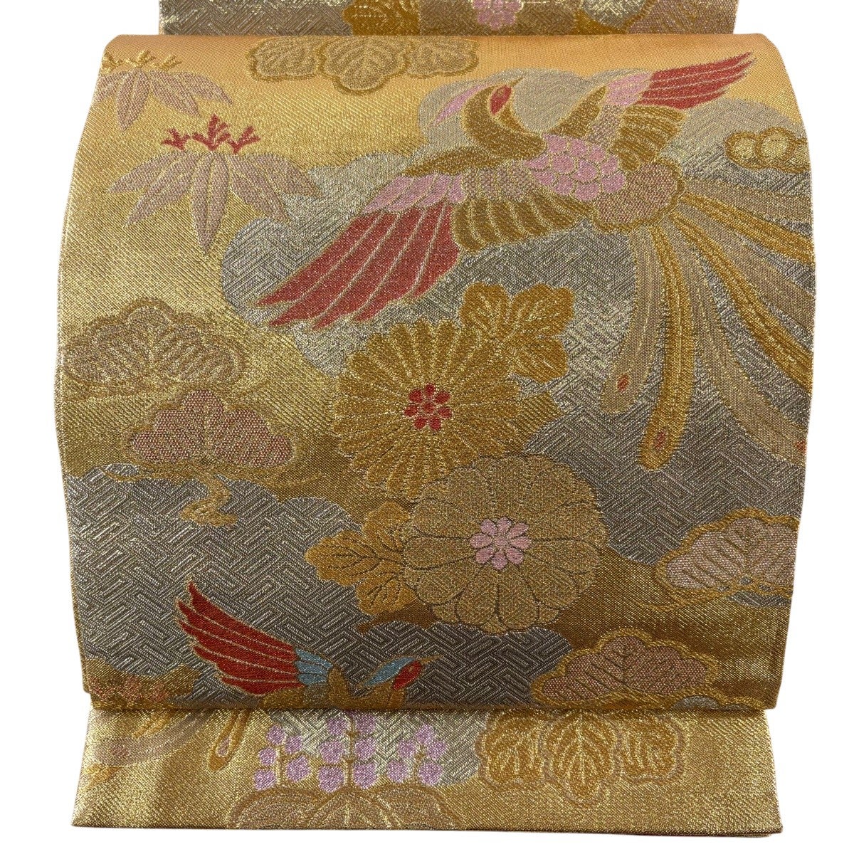 【美品】 袋帯 秀品 松竹梅 鳳凰 金糸 箔 金色 六通 正絹