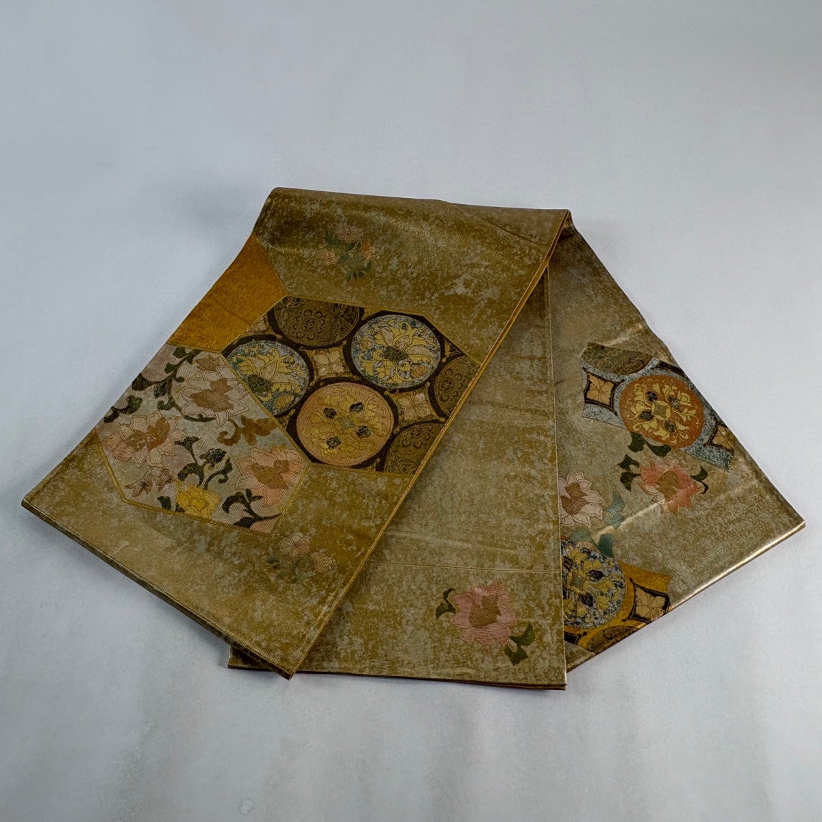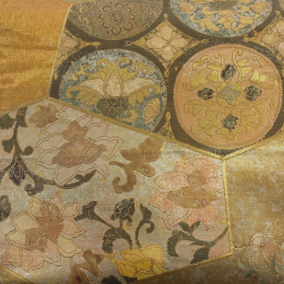袋帯 秀品 鏡 草花 箔 螺鈿箔 金色 お太鼓柄 正絹