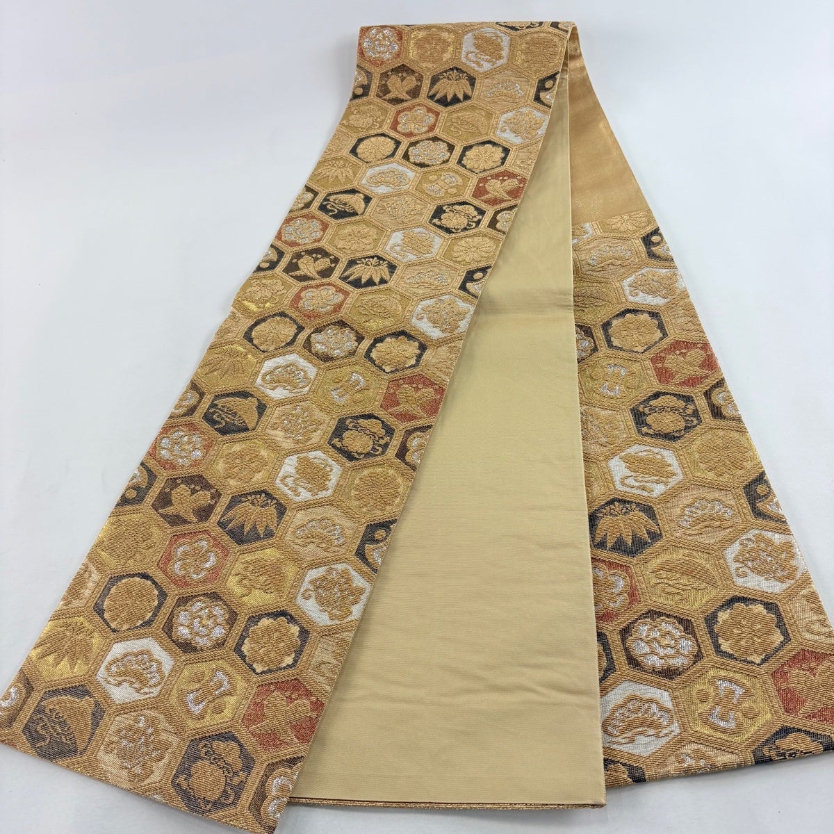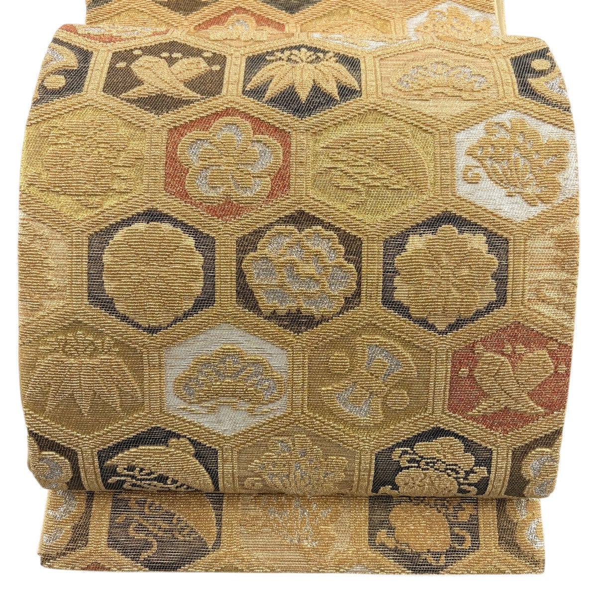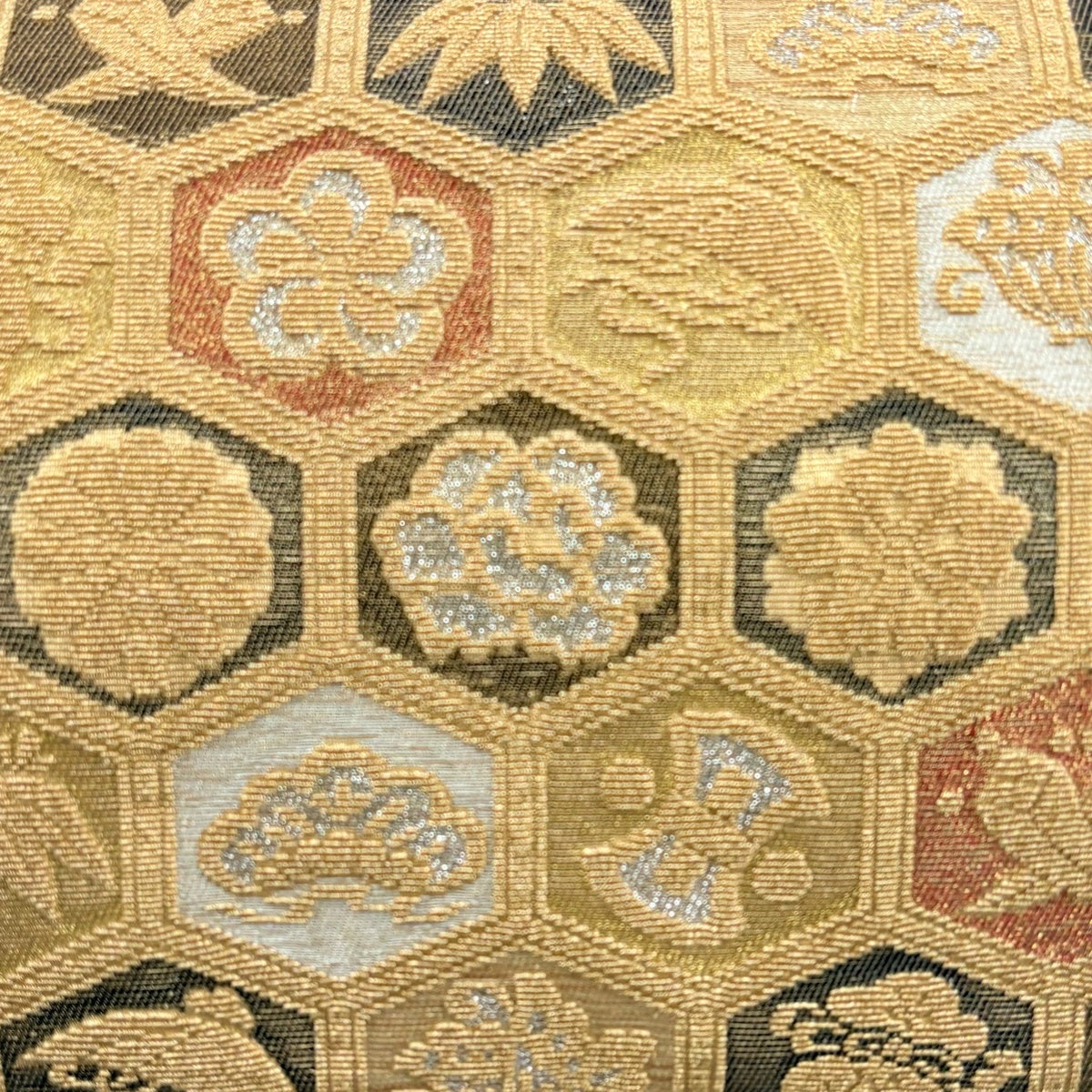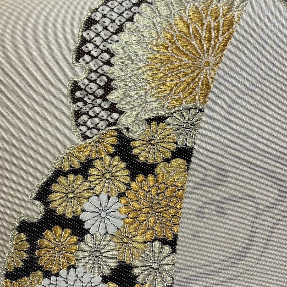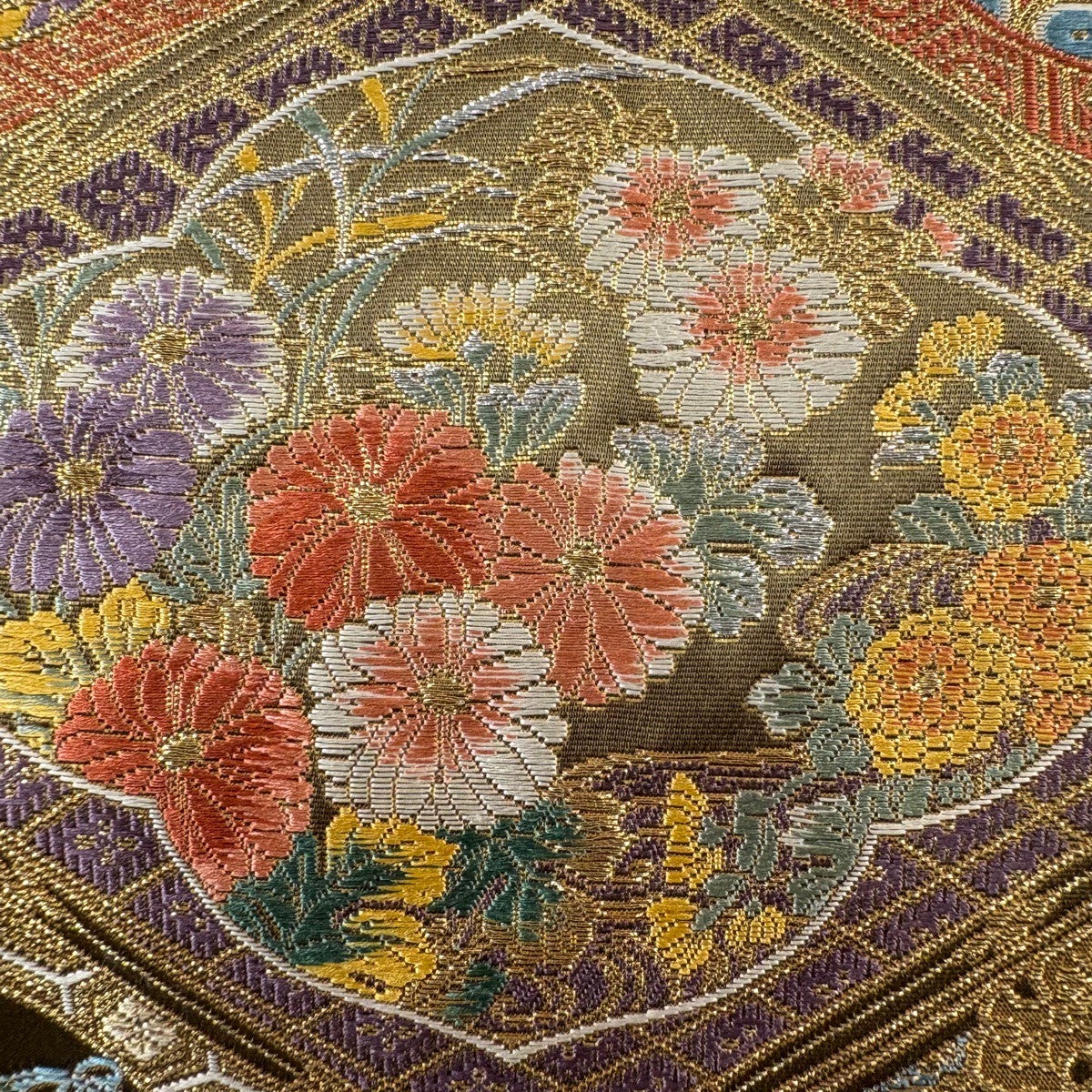 50%OFF 袋帯 秀品 花びら 幾何学 金糸 金茶 全通 正絹 K50