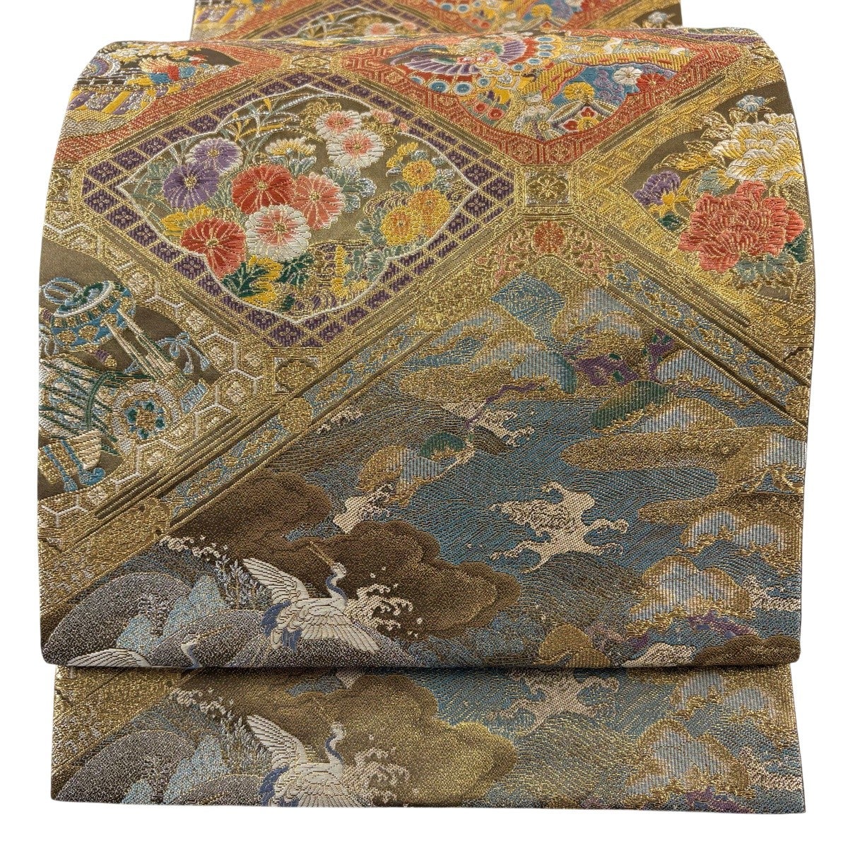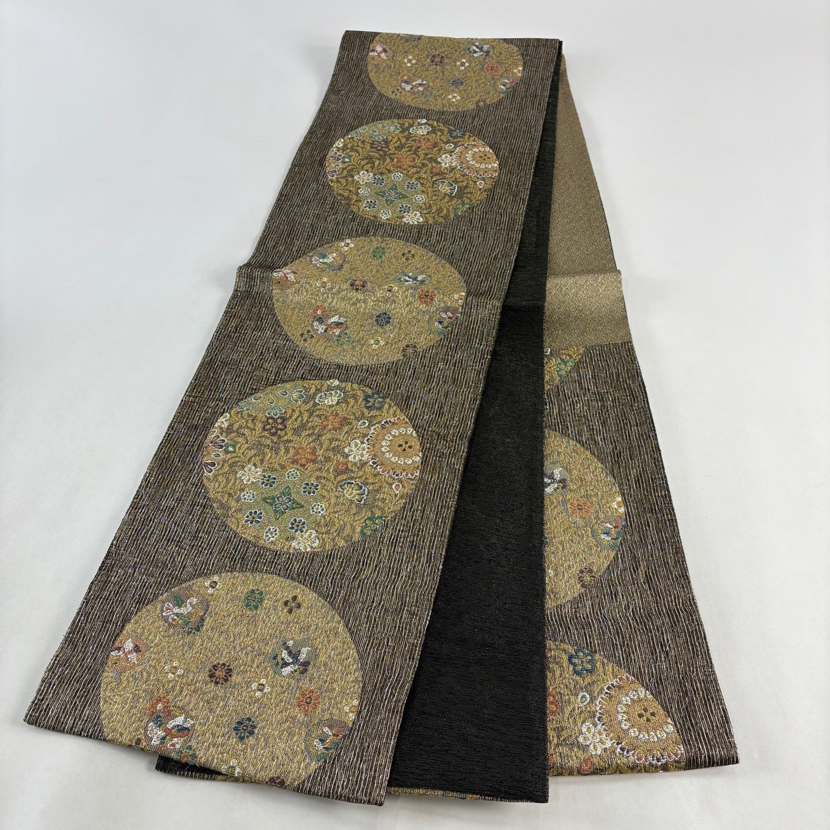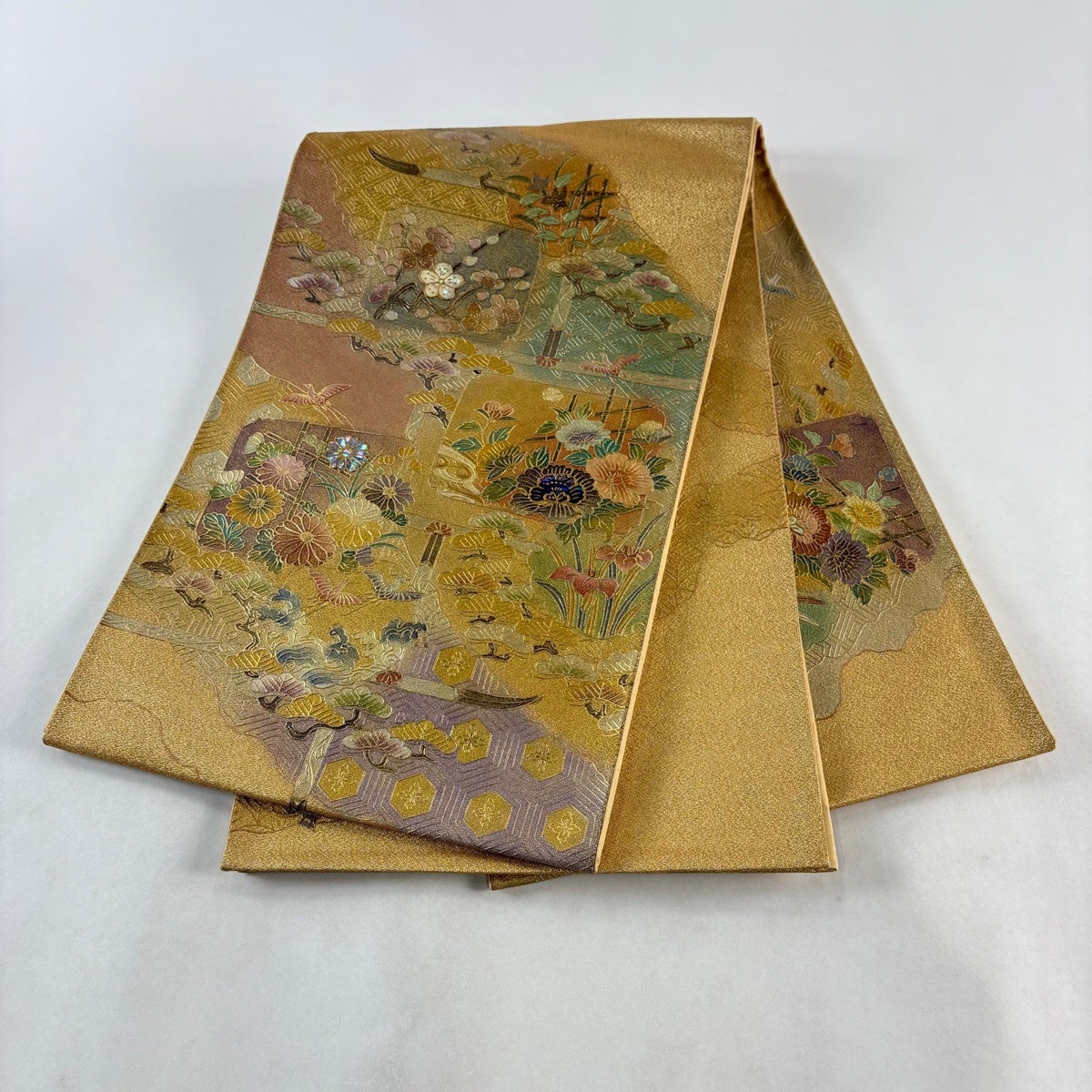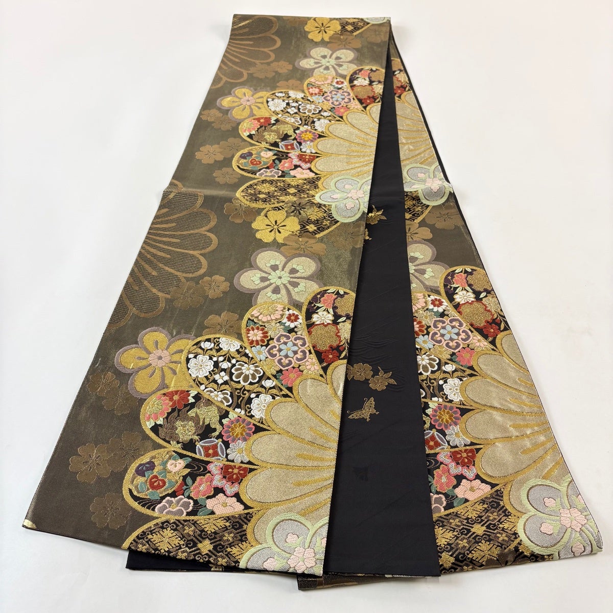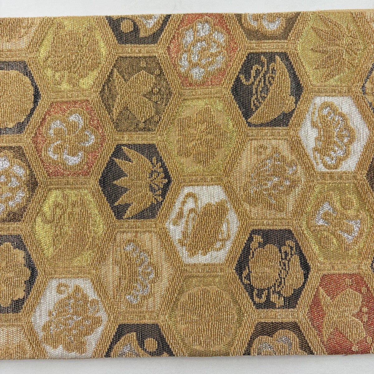 50%OFF 袋帯 秀品 花びら 幾何学 金糸 金茶 全通 正絹 K50
