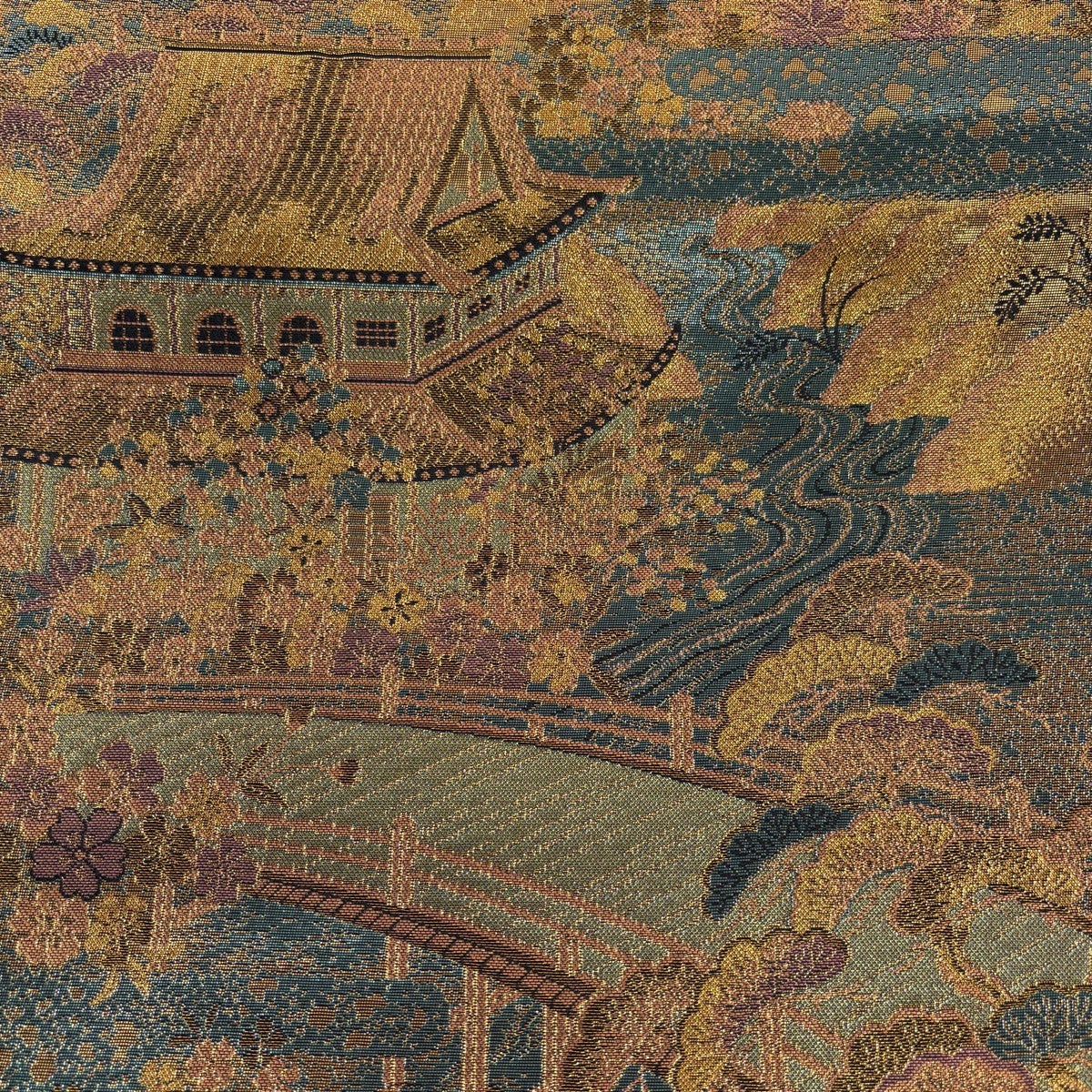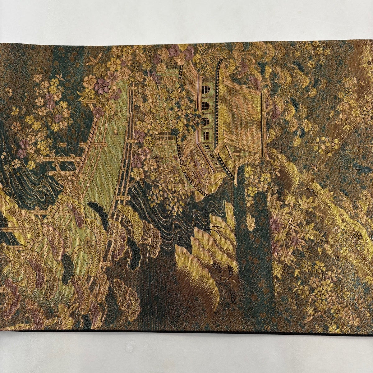 袋帯 秀品 証紙あり 振袖向き 桜 麻の葉 唐織 箔 金茶 六通 正絹