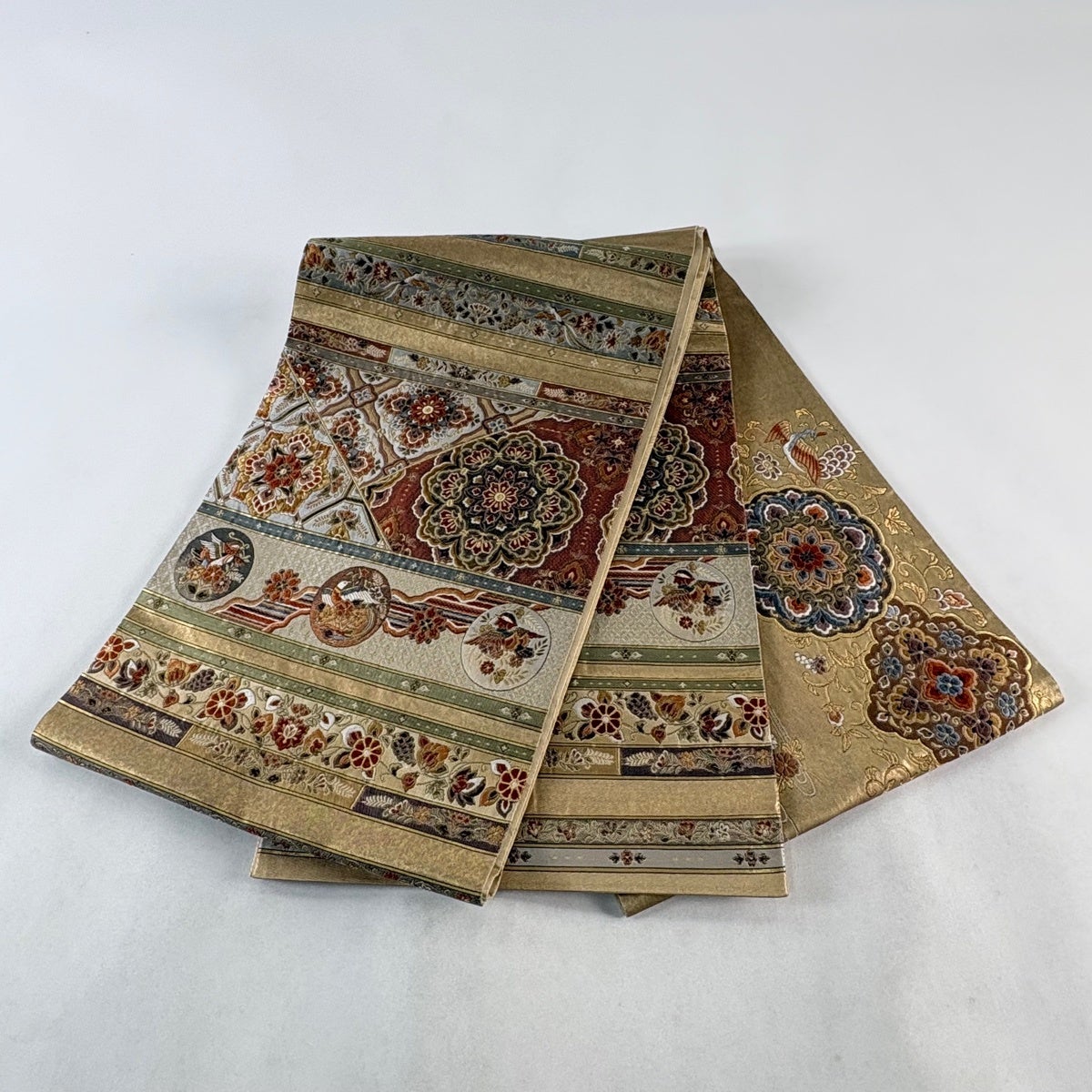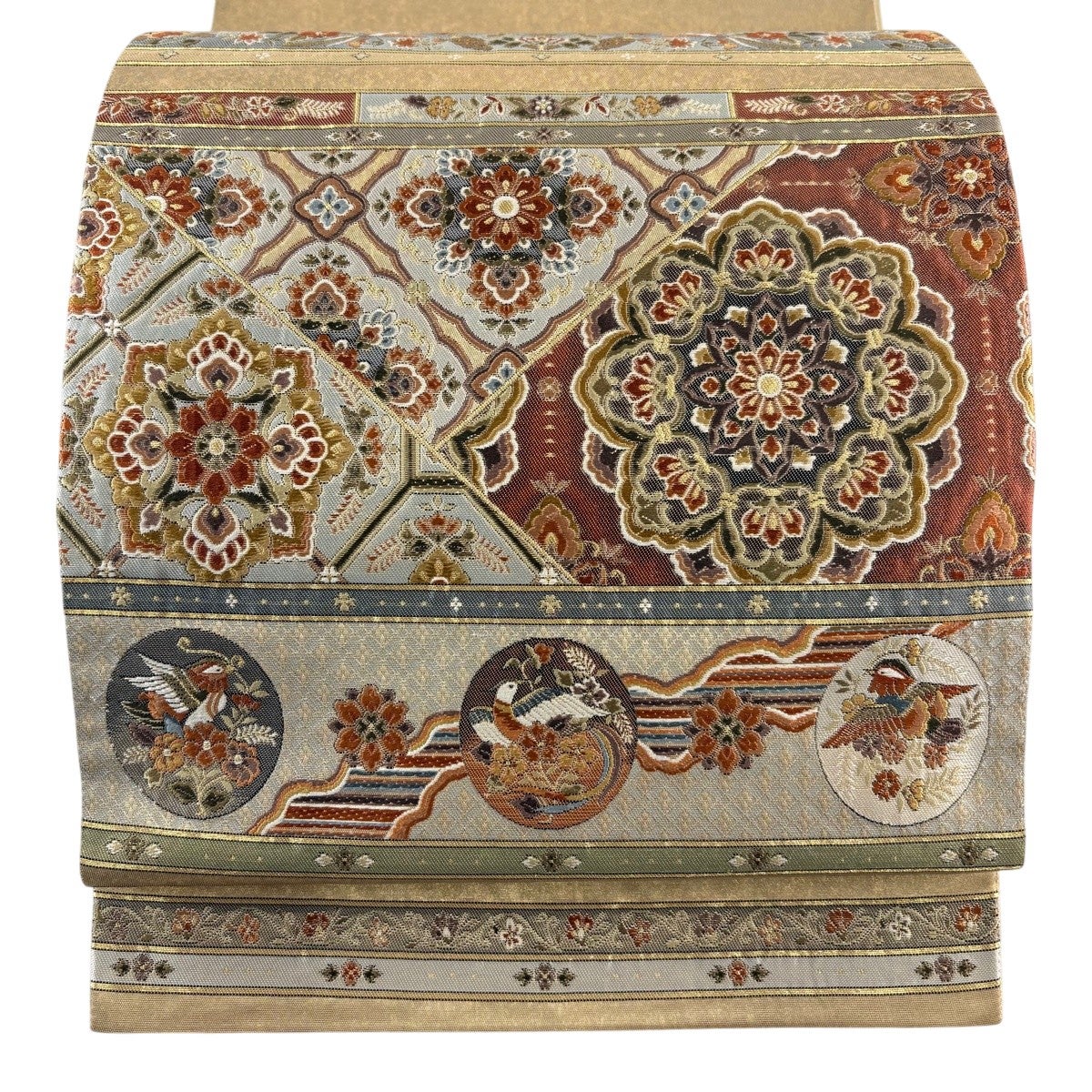 50%OFF 袋帯 秀品 華文 花鳥 金糸 箔 金茶 六通 正絹 K50