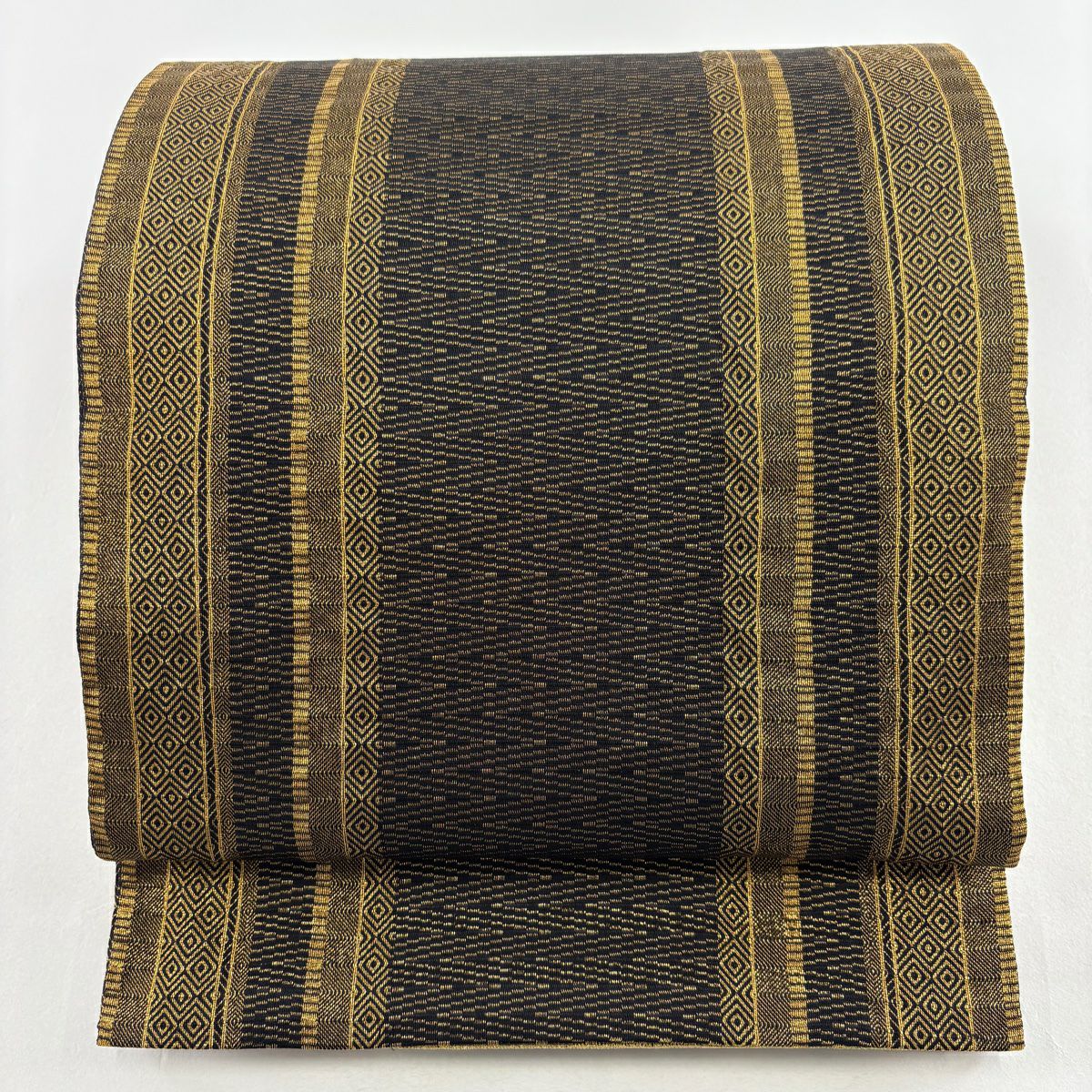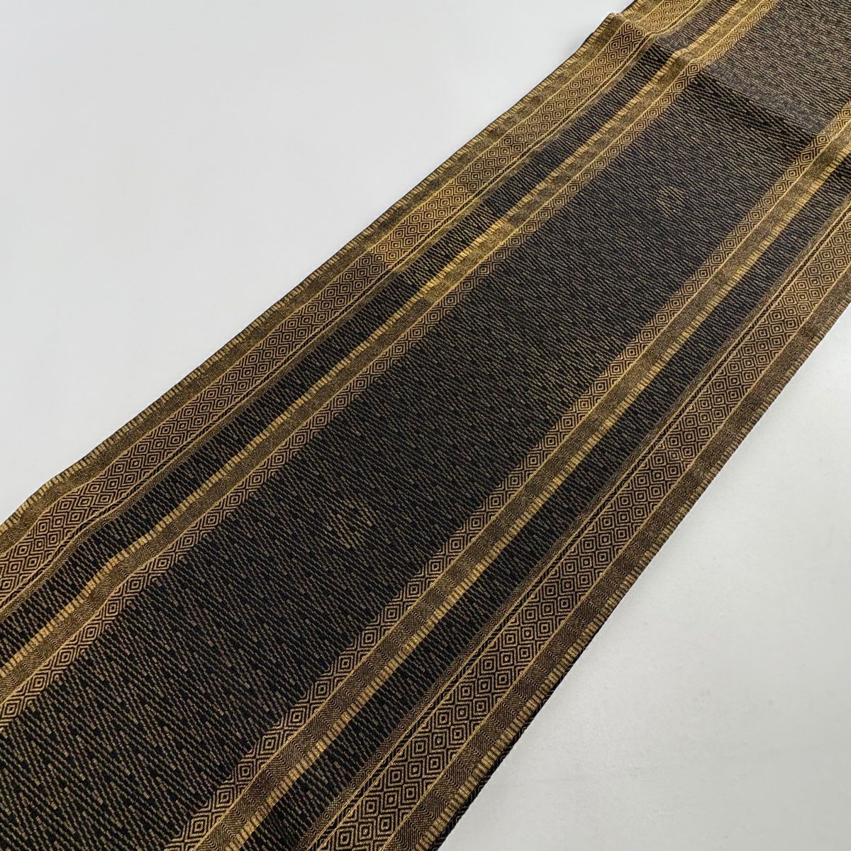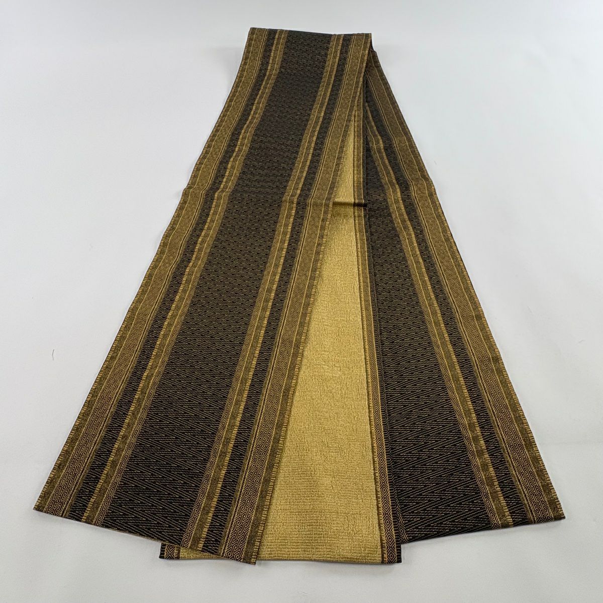 【在庫一掃】 袋帯 名品 菱 幾何学 金糸 金茶 全通 正絹