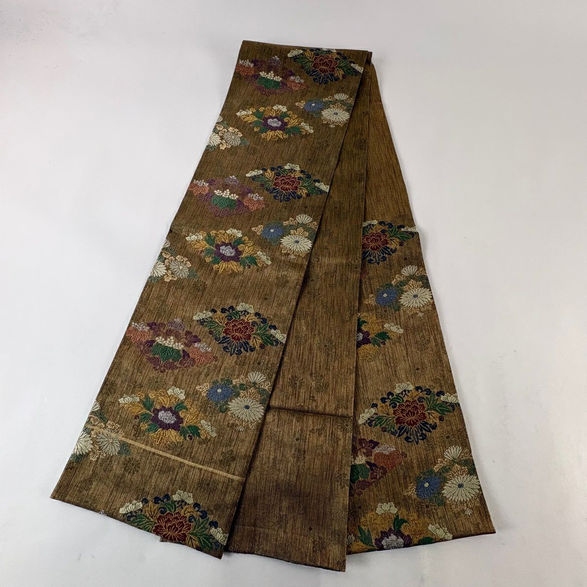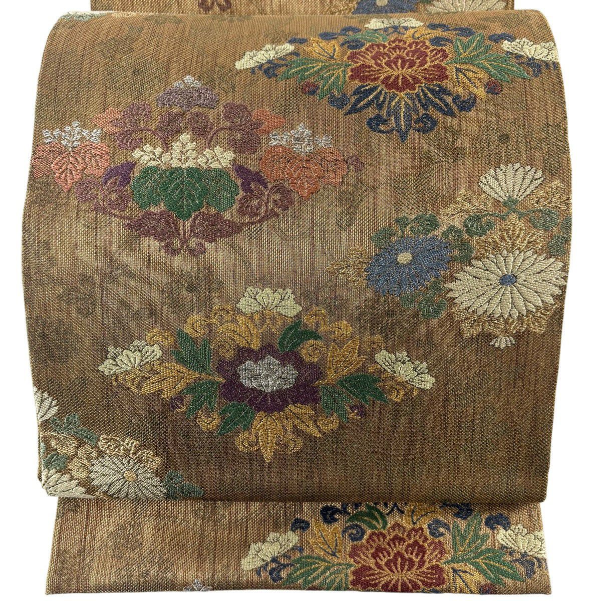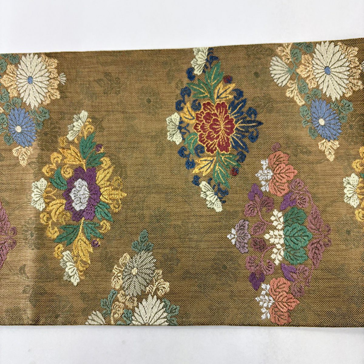 袋帯 秀品 牡丹菊唐花文 花菱 金糸 箔 金茶 六通 正絹