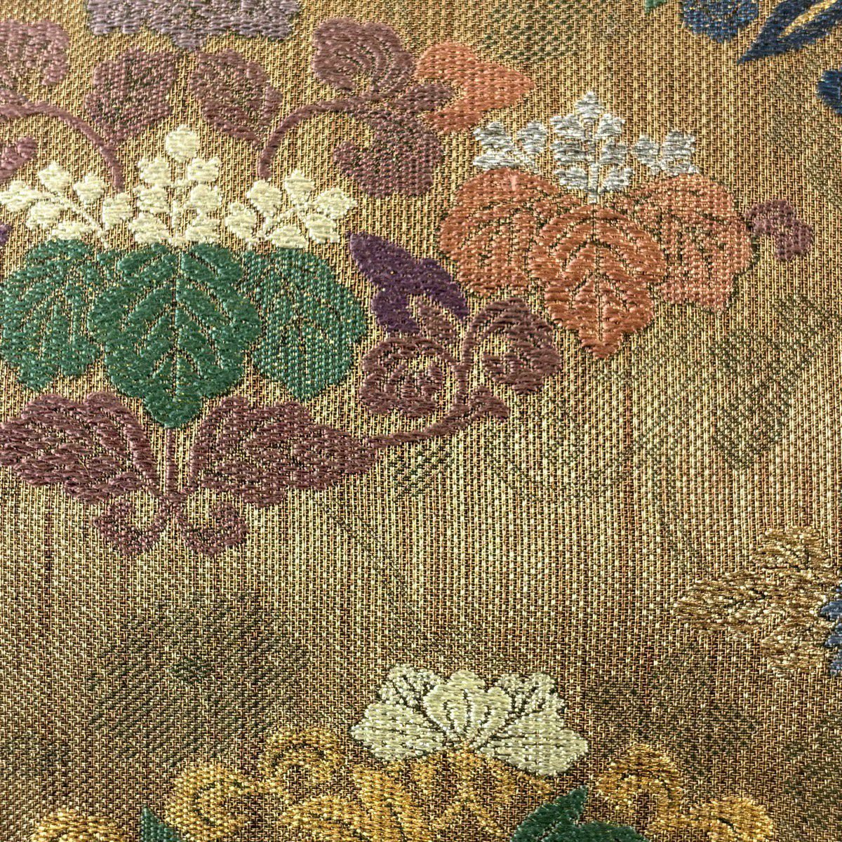 【美品】 袋帯 秀品 草花 幾何学 金糸 箔 金茶 六通 正絹