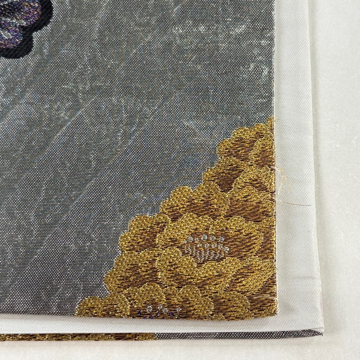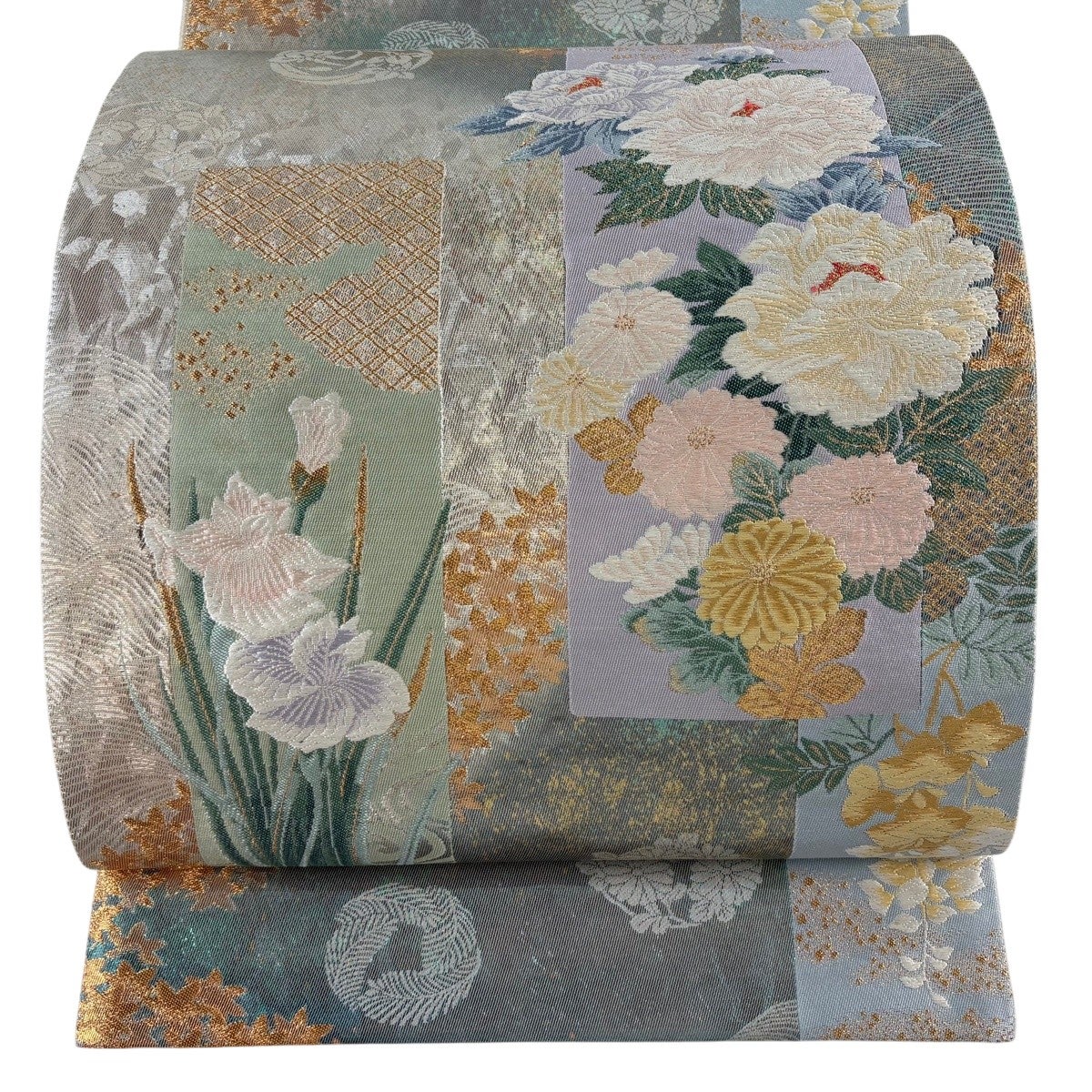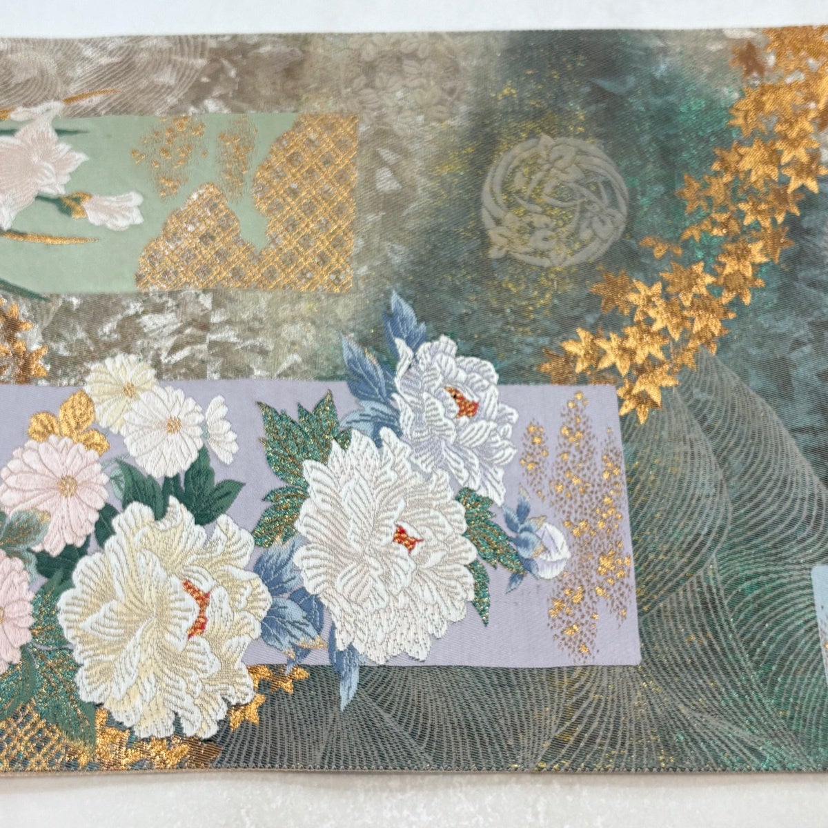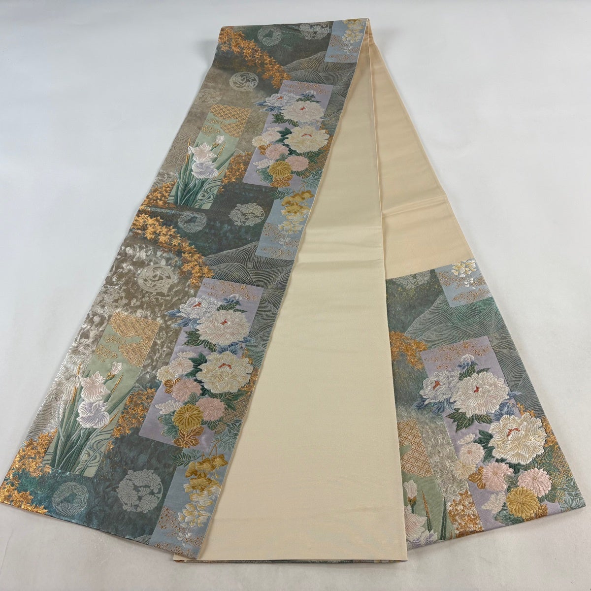 袋帯 秀品 水月花 枝梅 牡丹 金糸 箔 銀色 六通 正絹