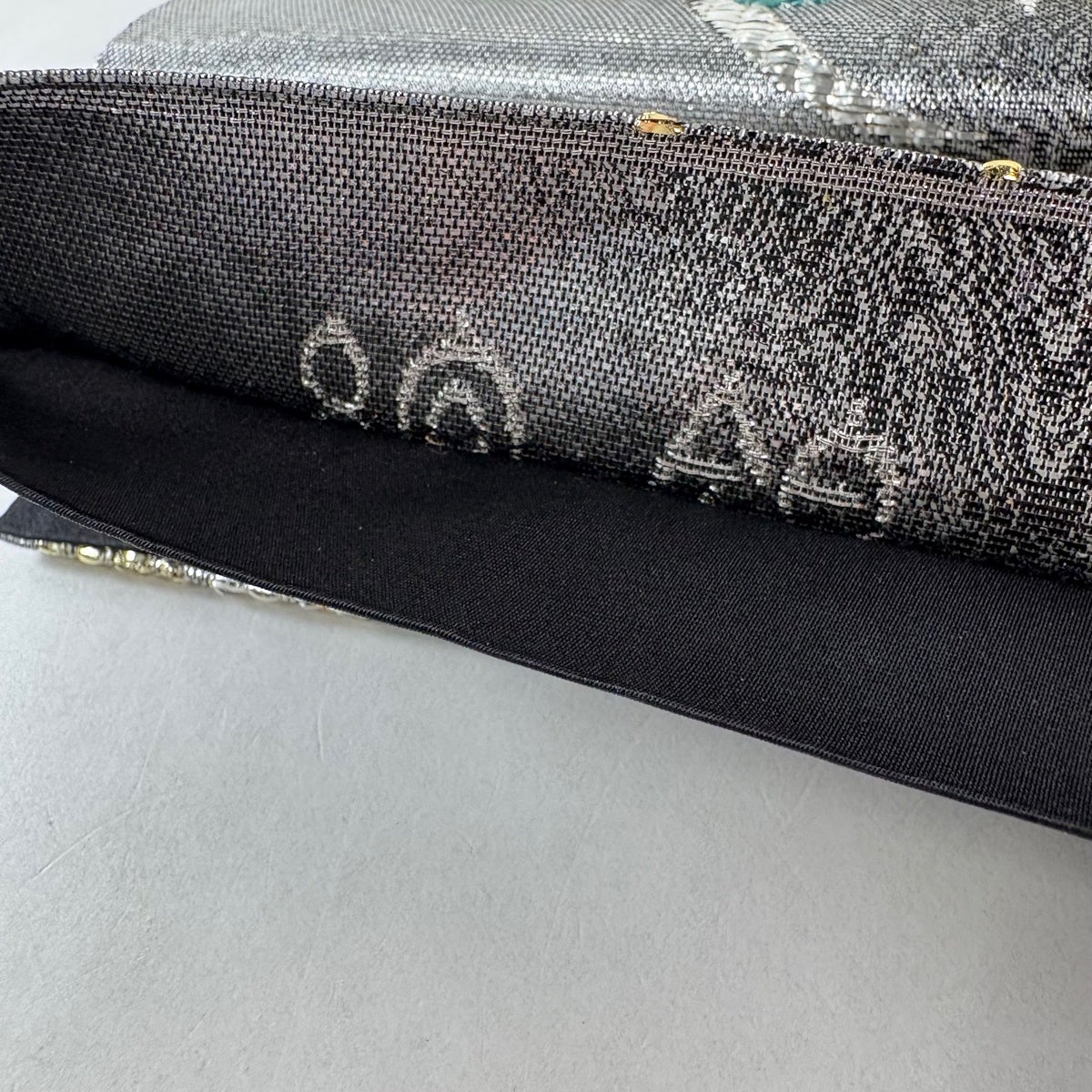 【美品】 袋帯 秀品 幾何学 金銀糸 箔 銀色 六通 正絹