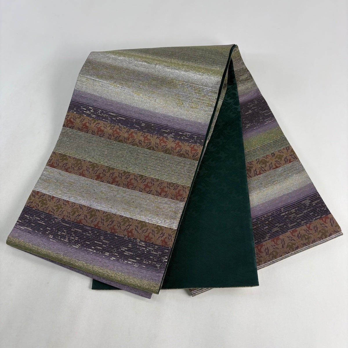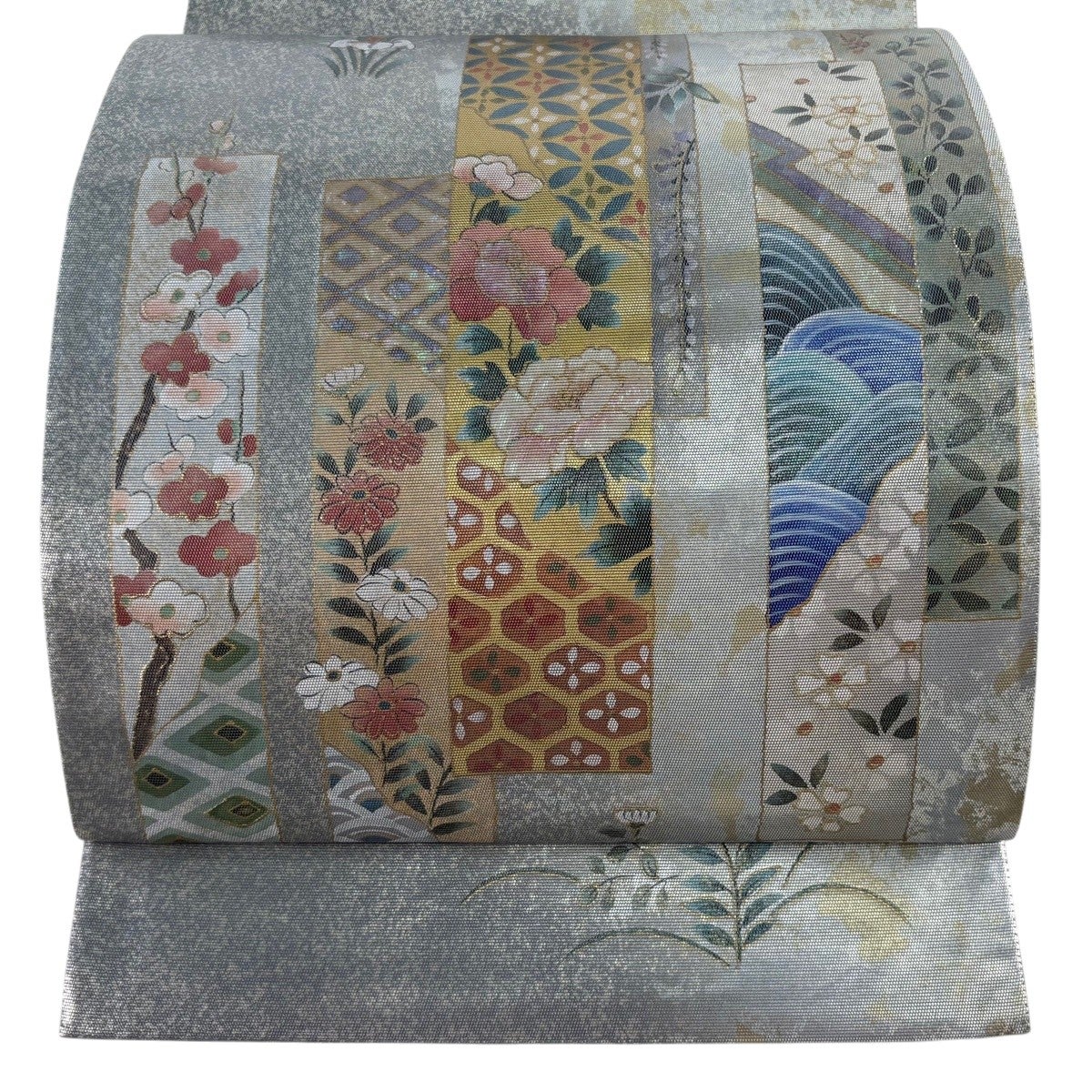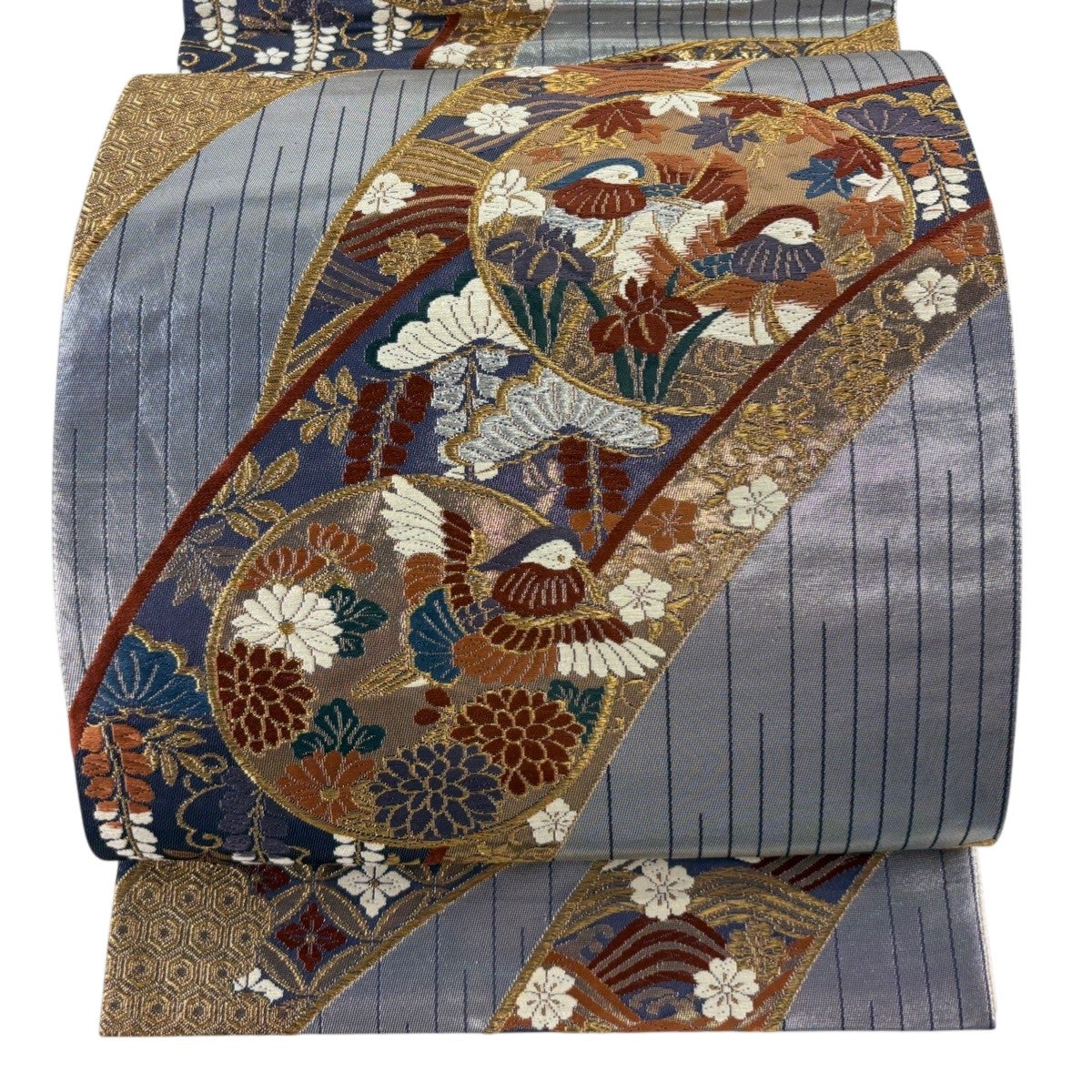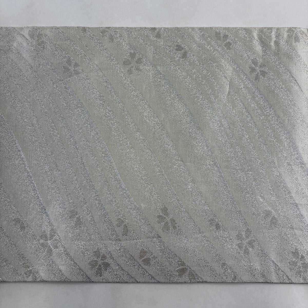 30%OFF 袋帯 秀品 桜 斜縞 金銀糸 銀色 六通 正絹 K30