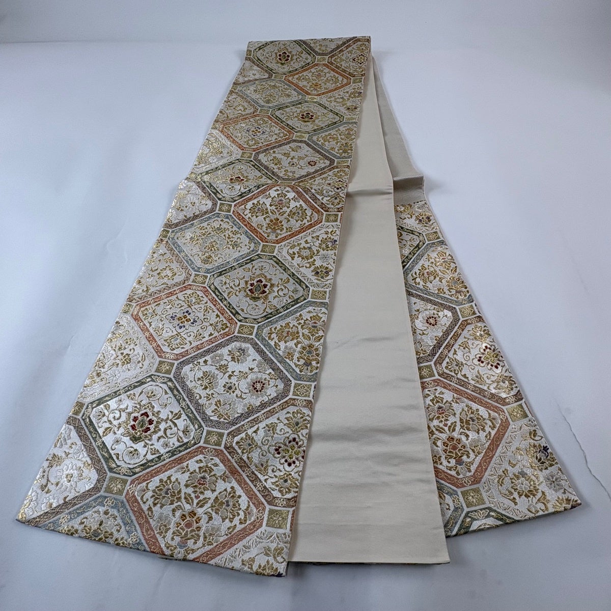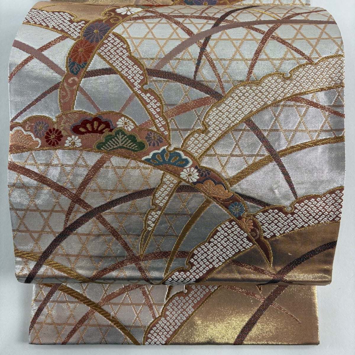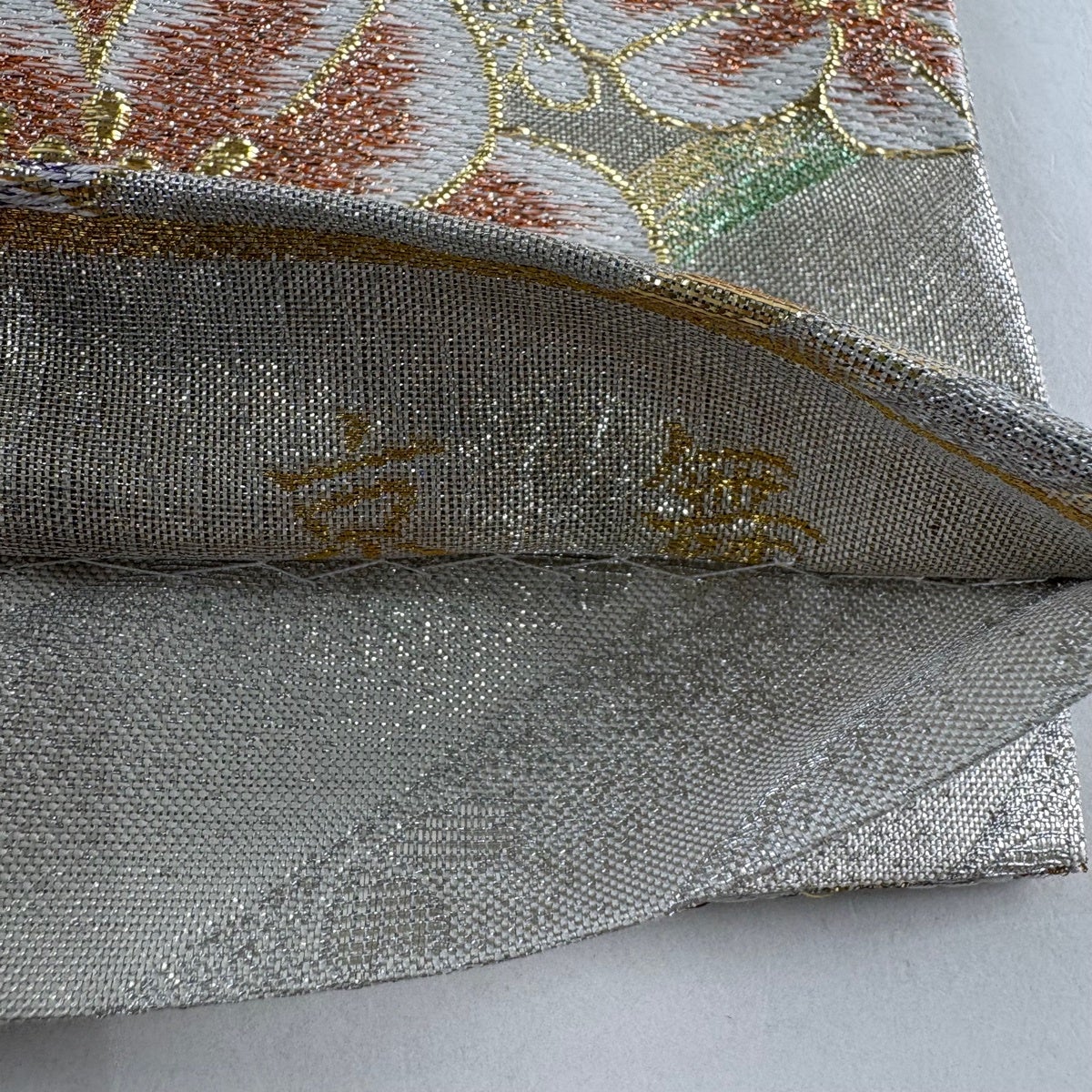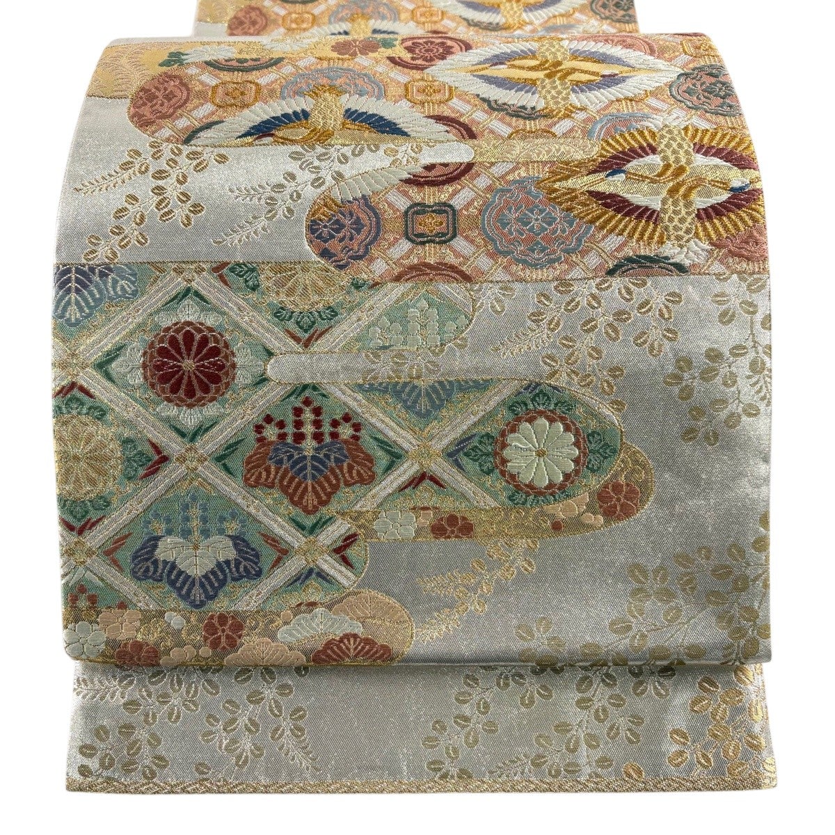50%OFF 袋帯 秀品 花 菱 銀糸 箔 銀色 六通 正絹 K50