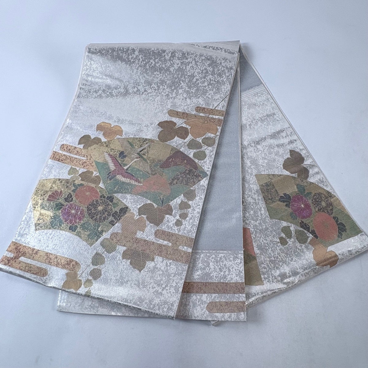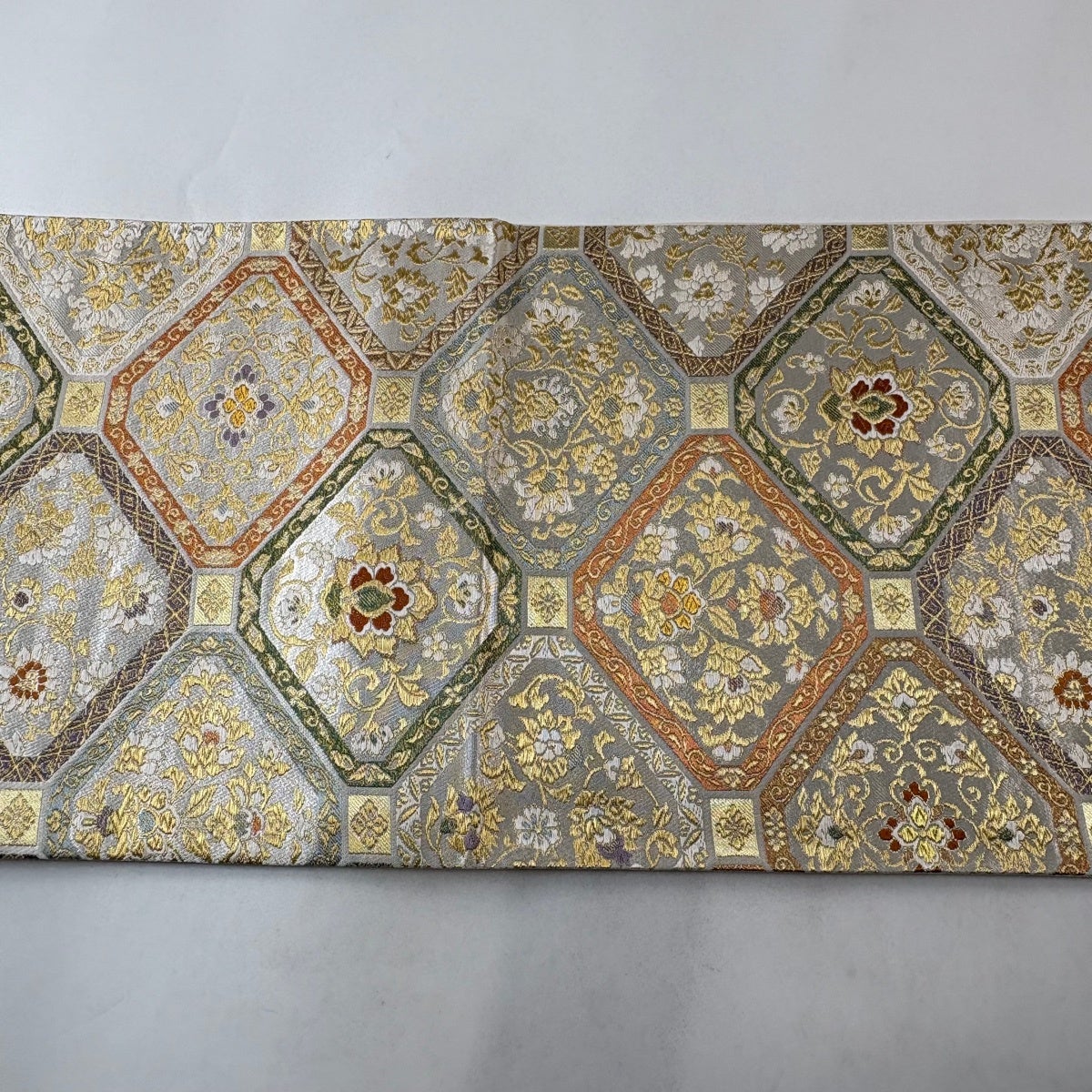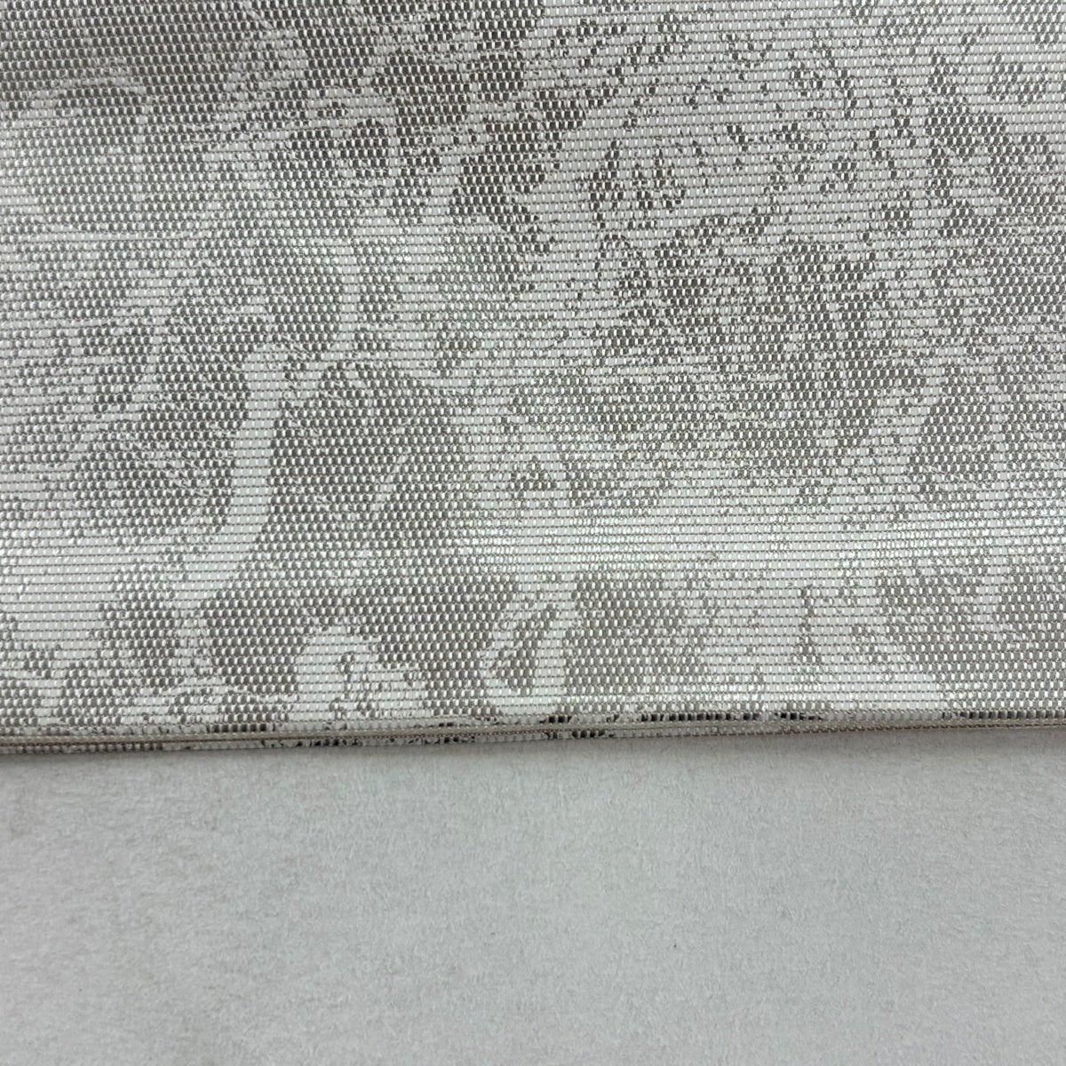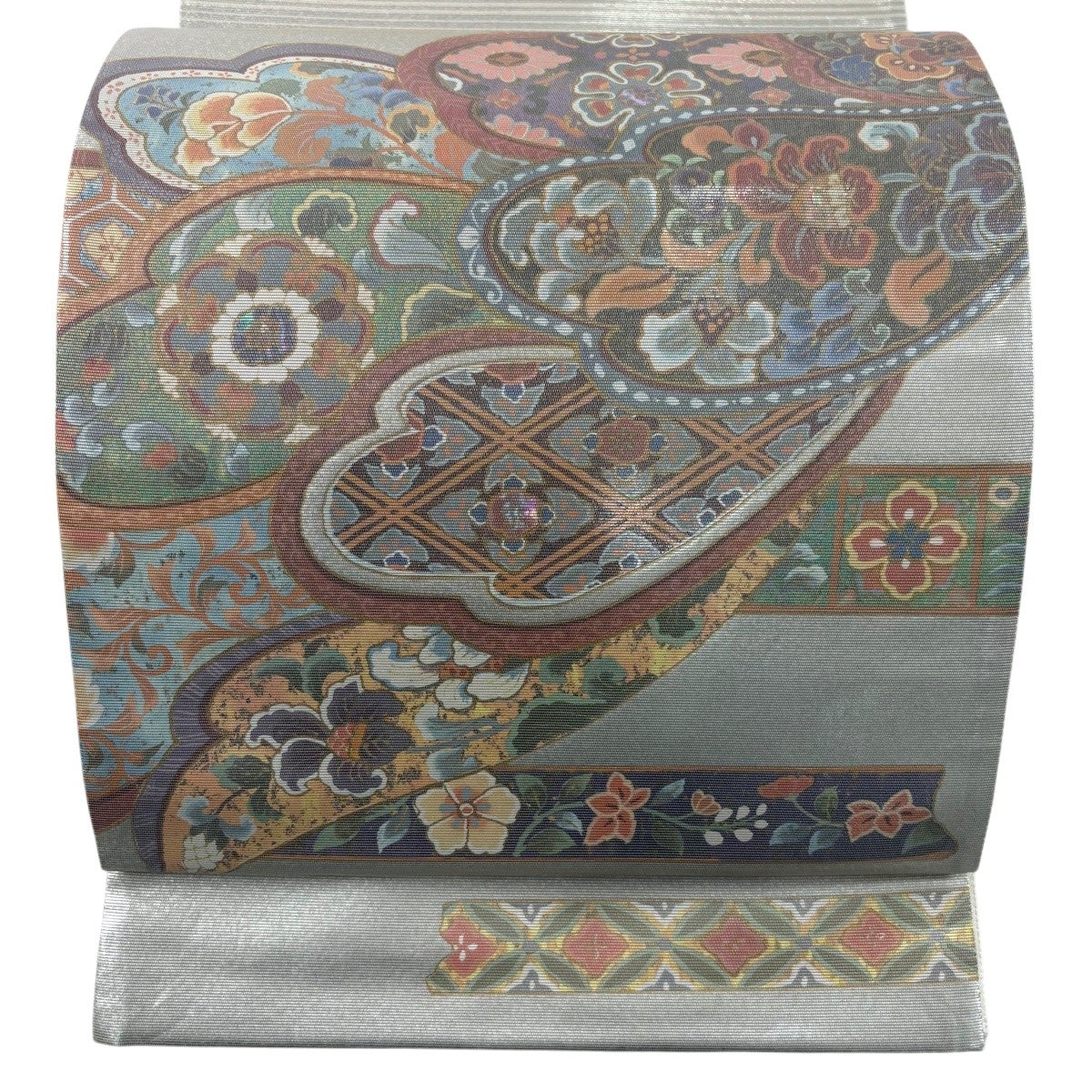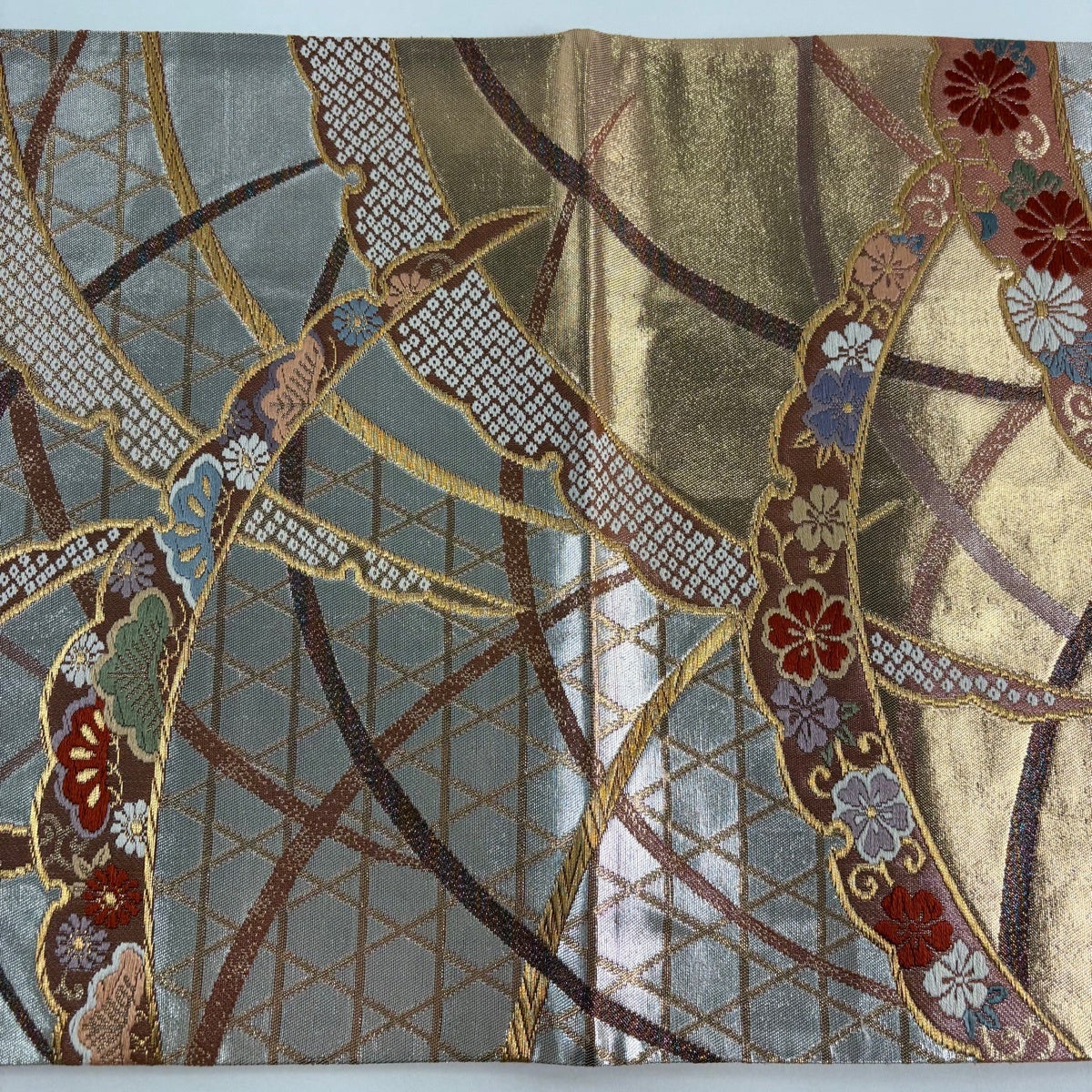 50%OFF 袋帯 秀品 花 菱 銀糸 箔 銀色 六通 正絹 K50