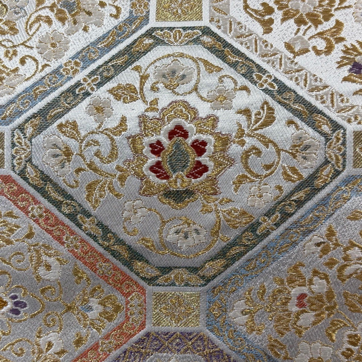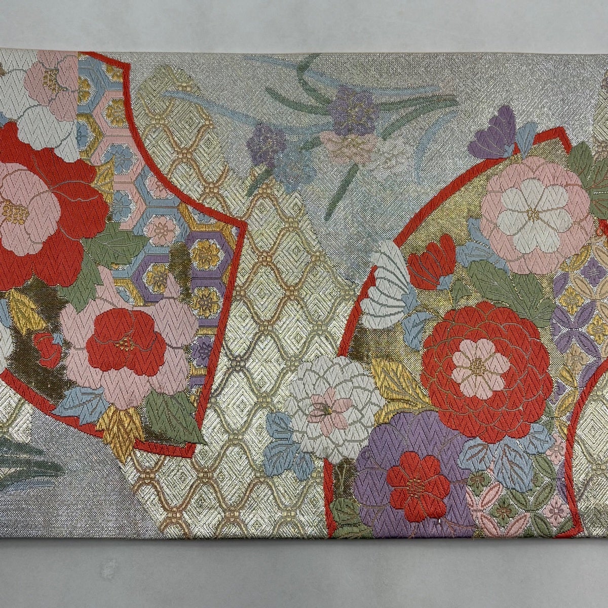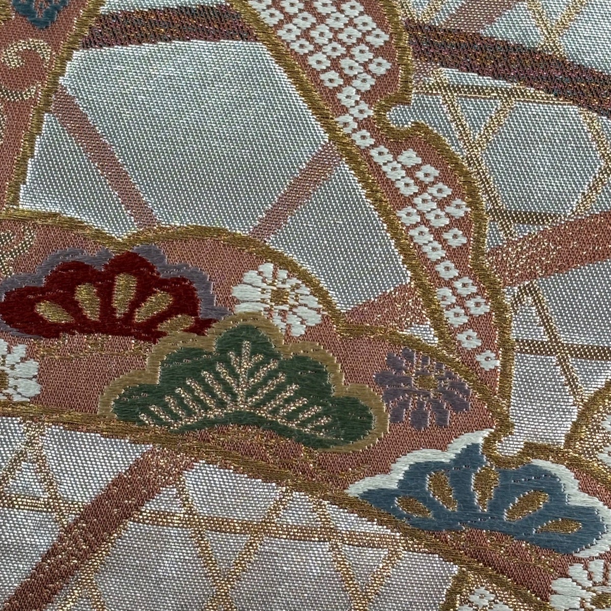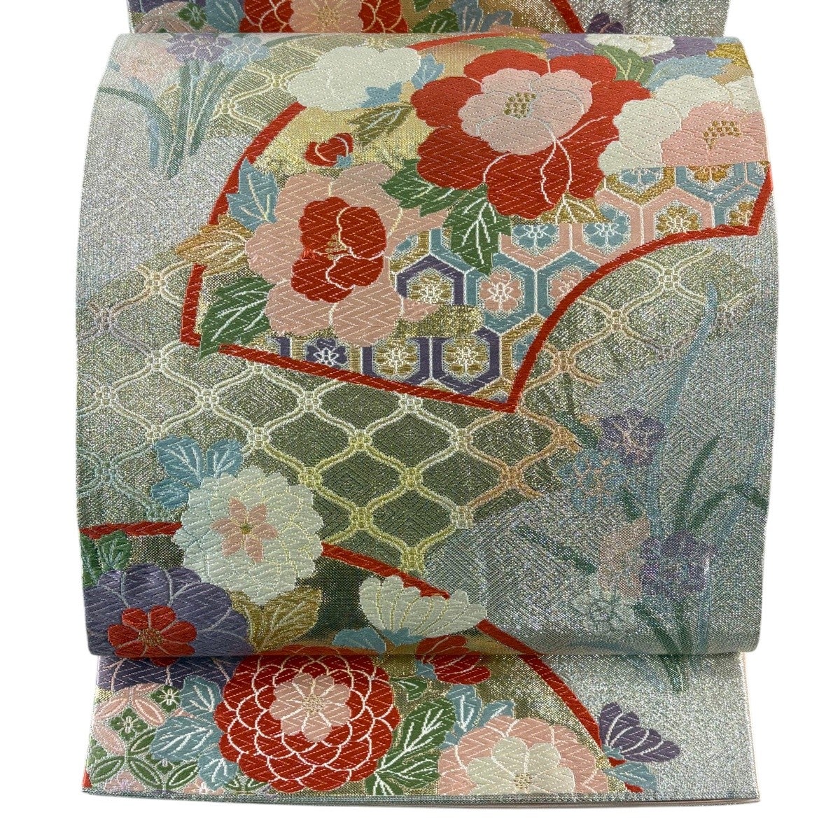 50%OFF 袋帯 秀品 花 菱 銀糸 箔 銀色 六通 正絹 K50