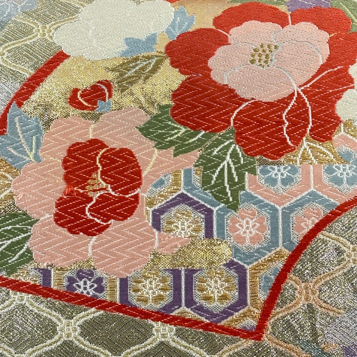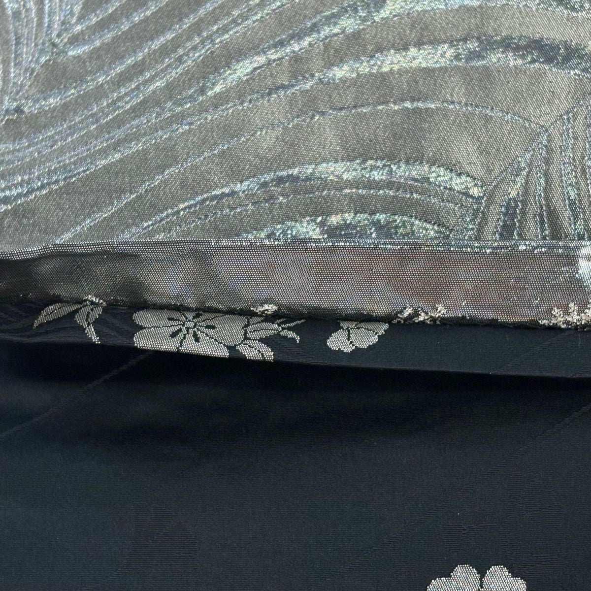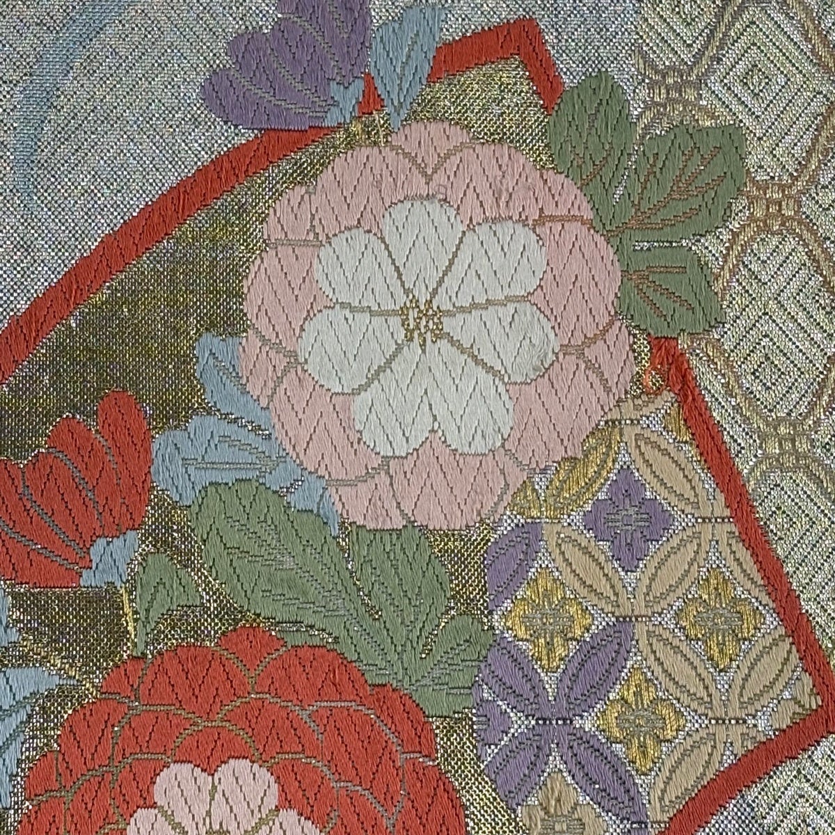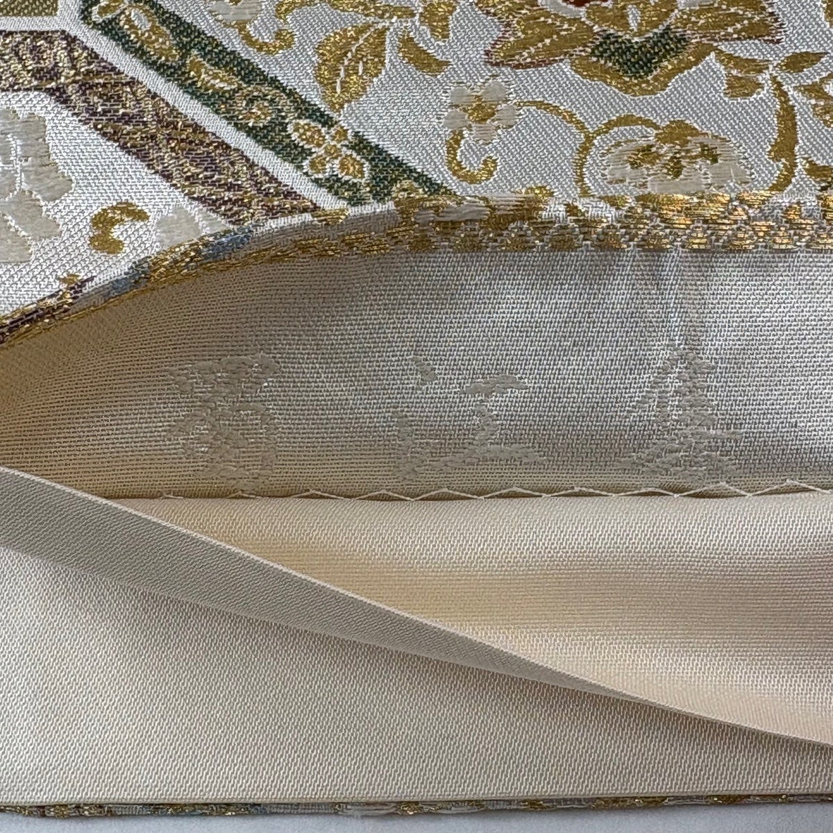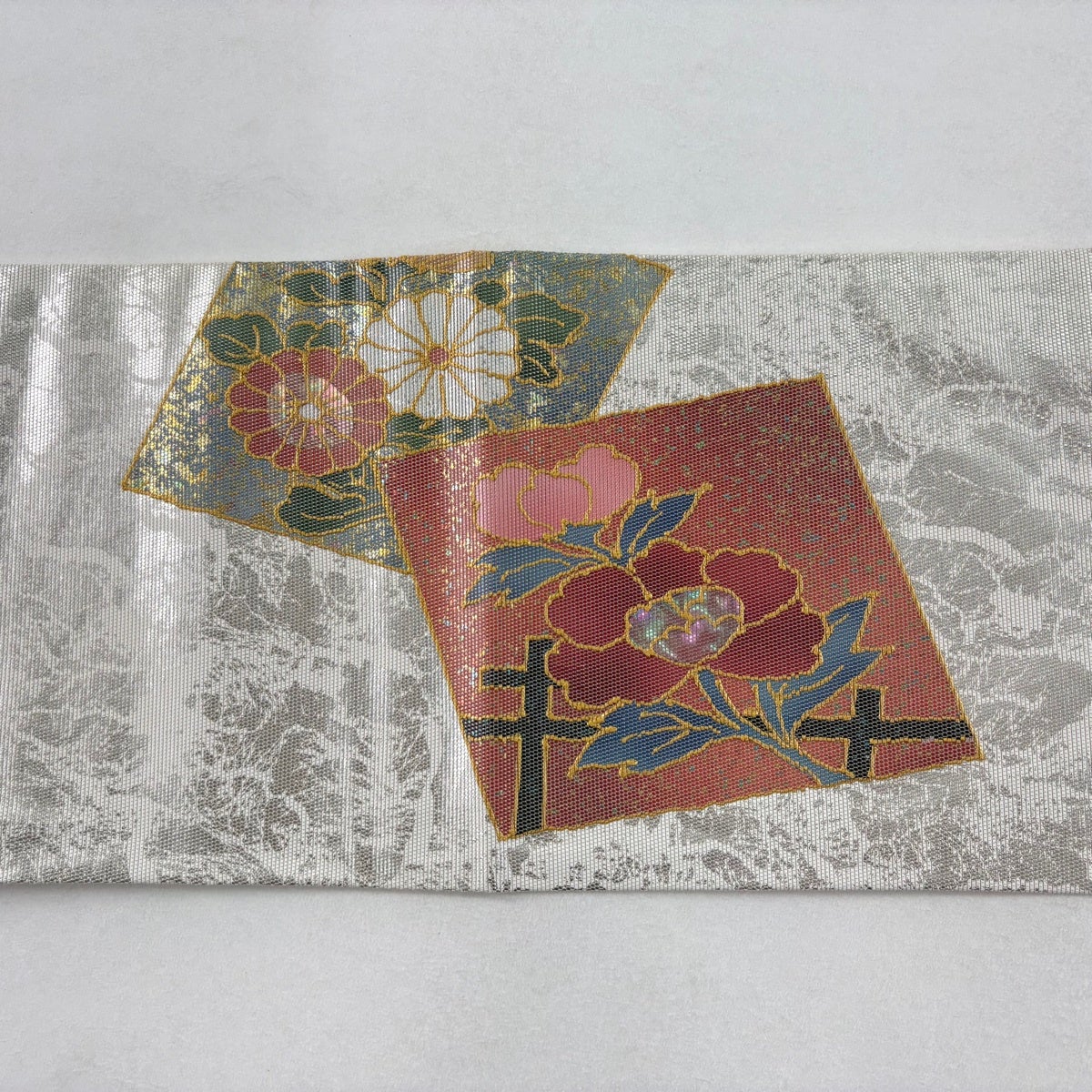 50%OFF 袋帯 秀品 花 菱 銀糸 箔 銀色 六通 正絹 K50