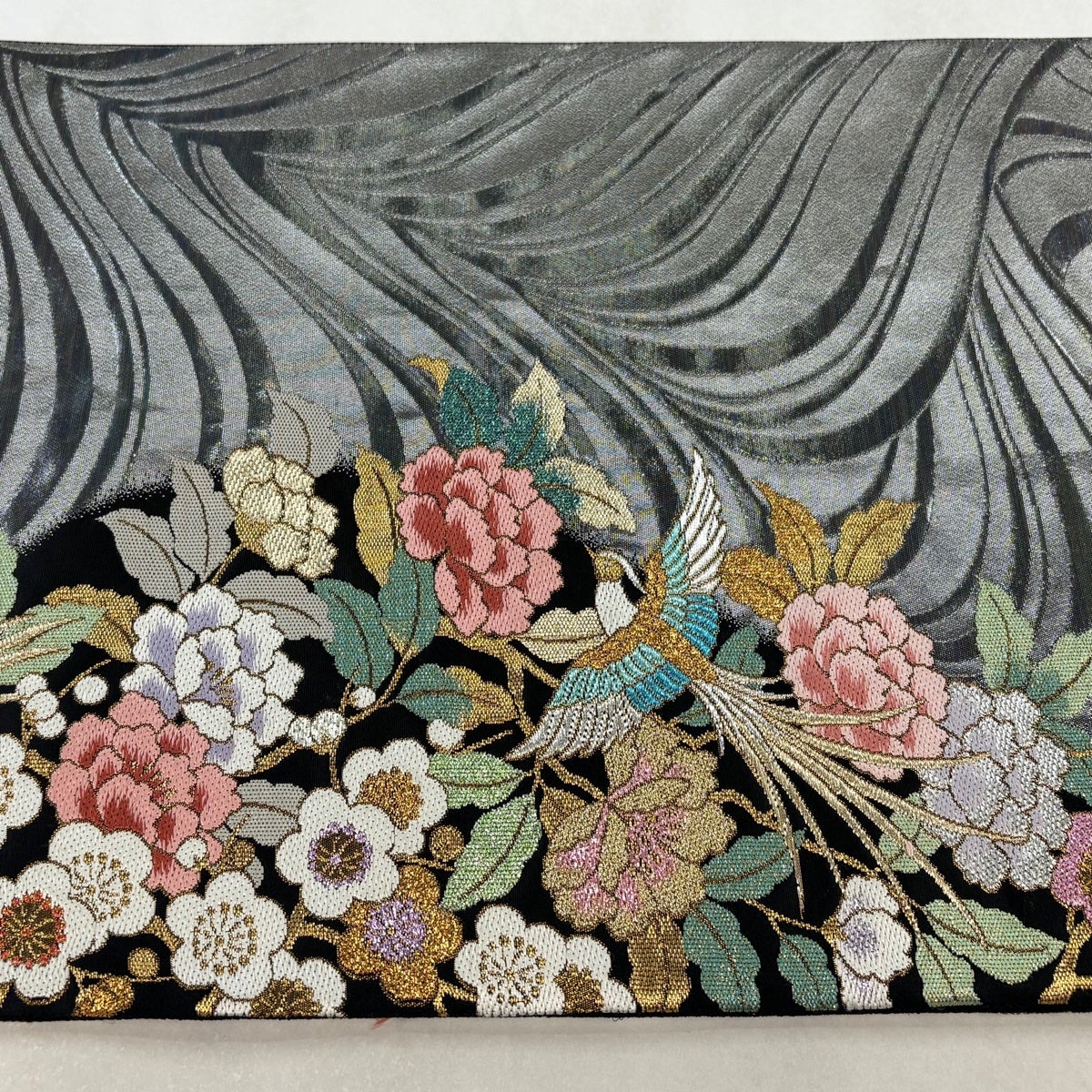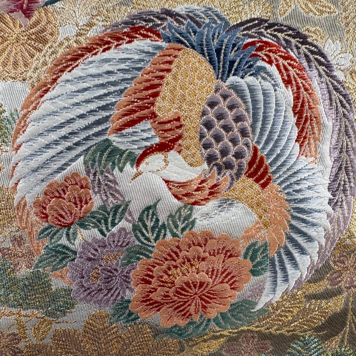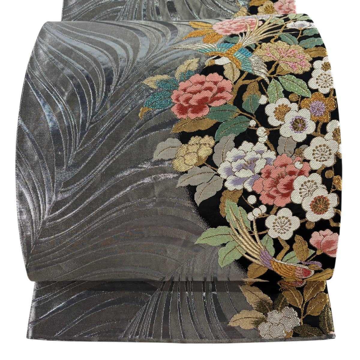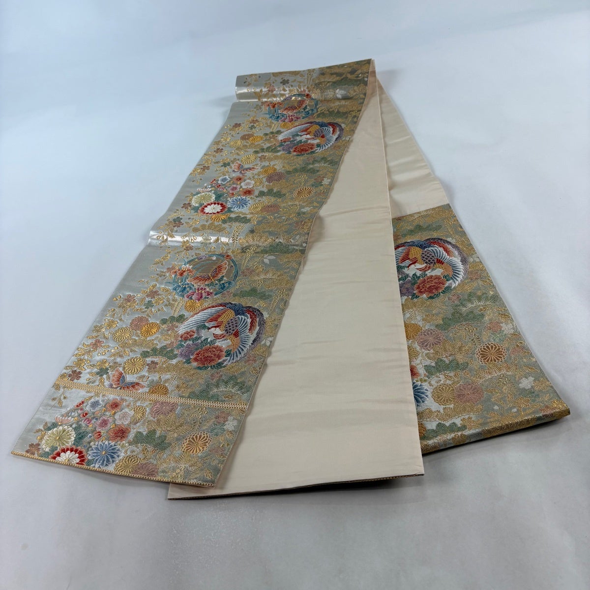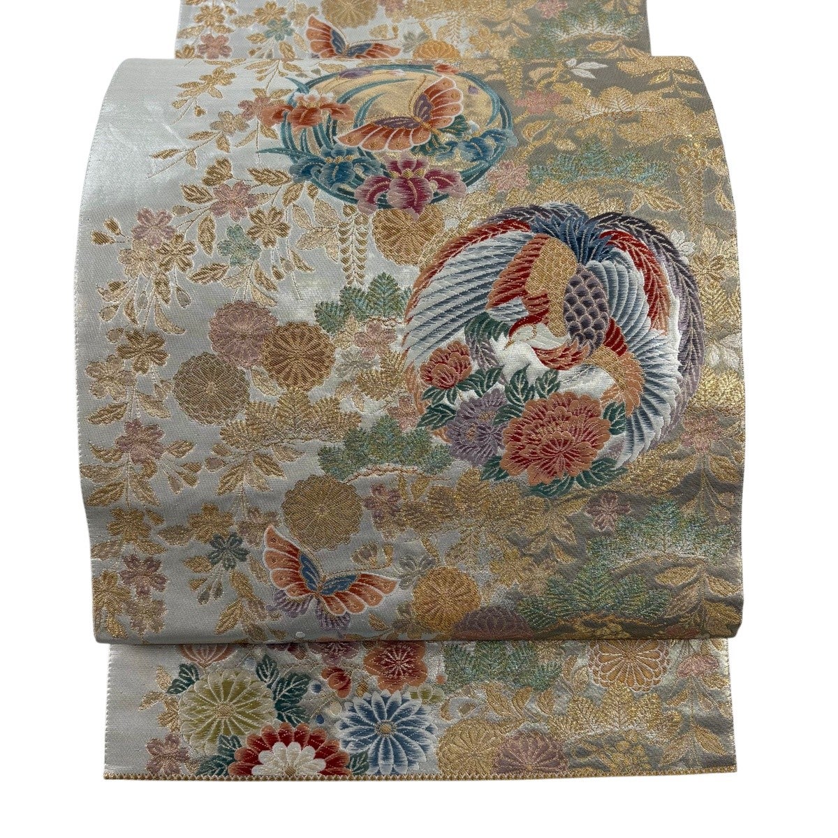 袋帯 秀品 関西仕立て 鳳凰 花丸文 本金箔 唐織 銀色 六通 正絹
