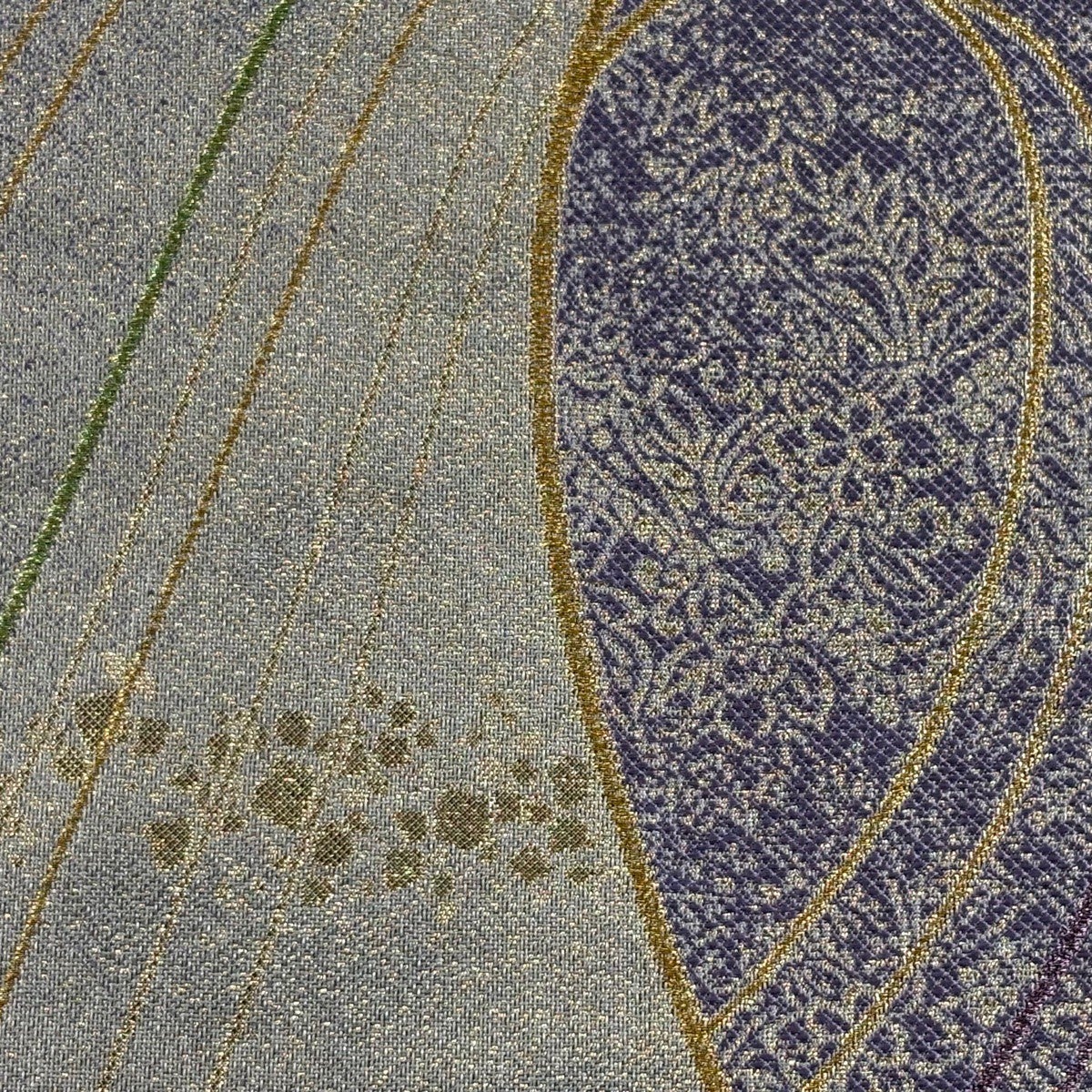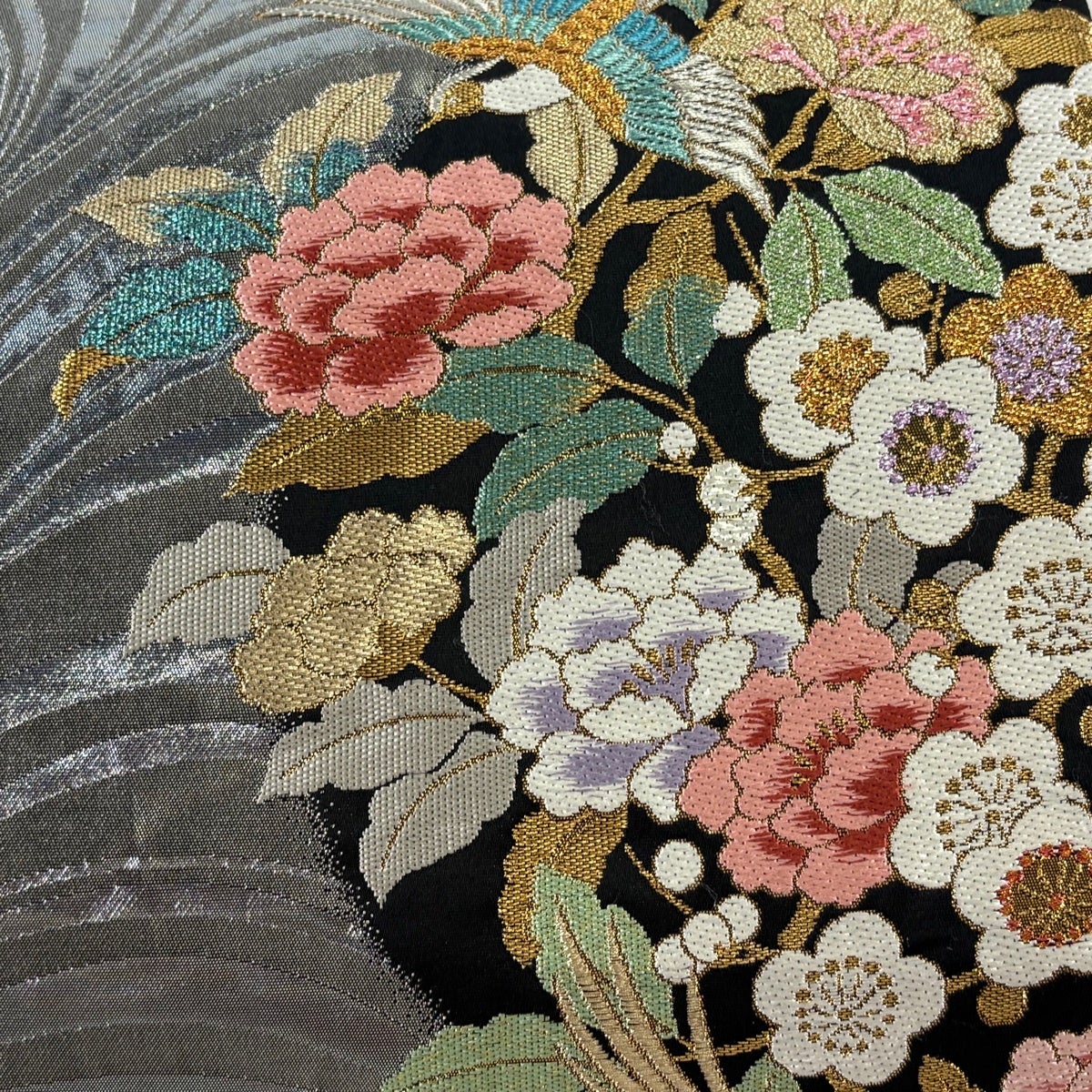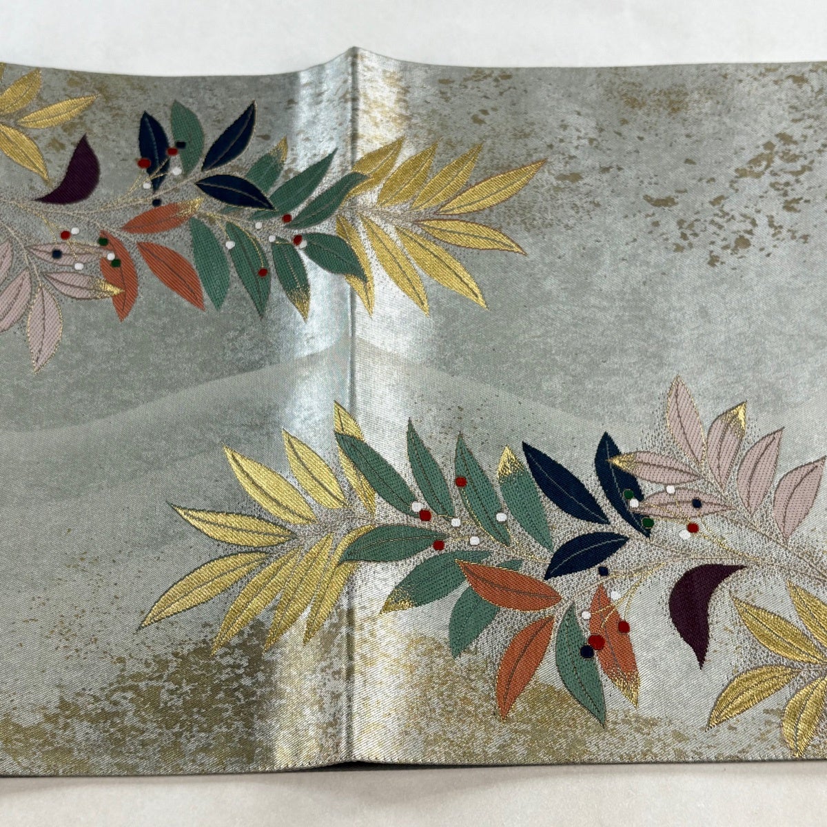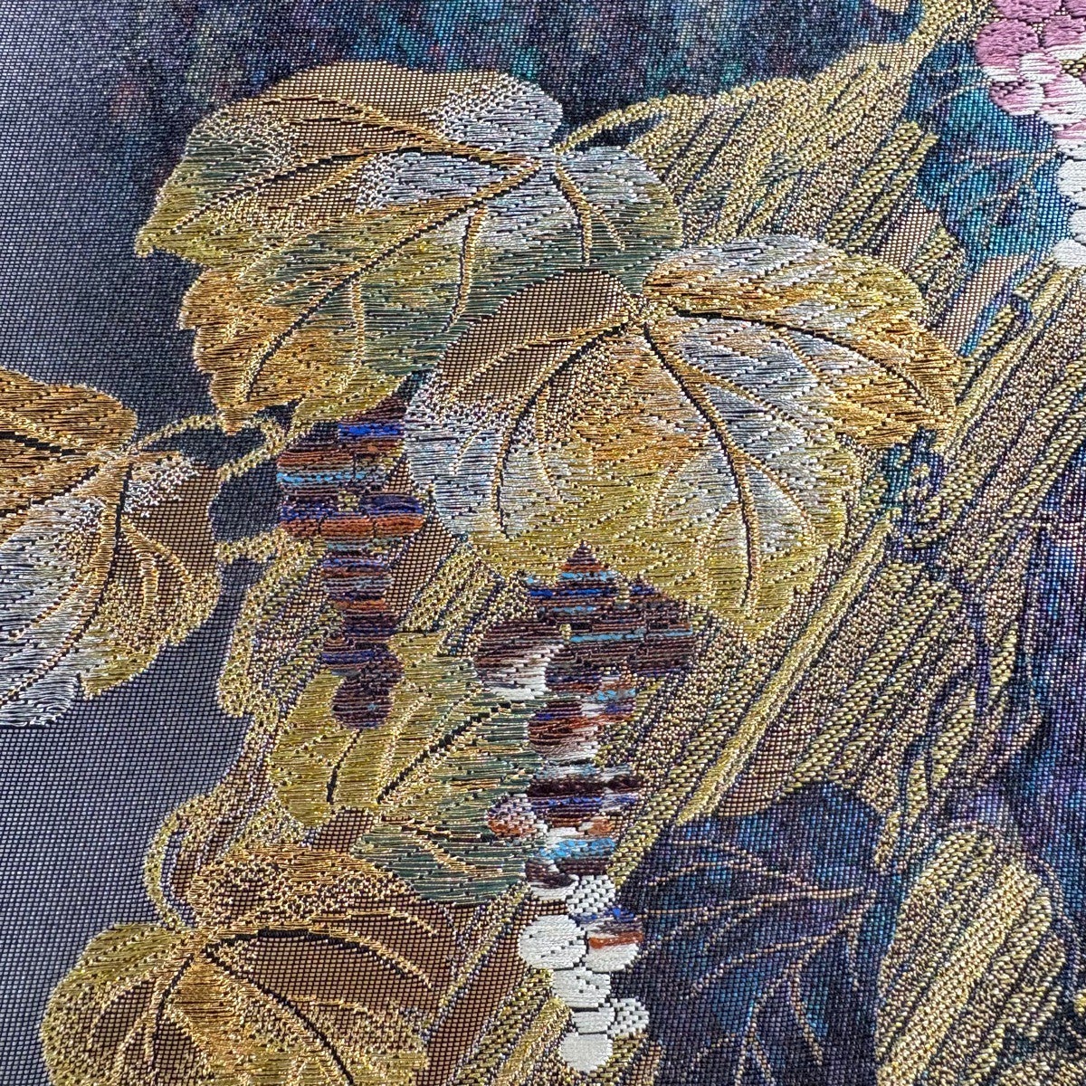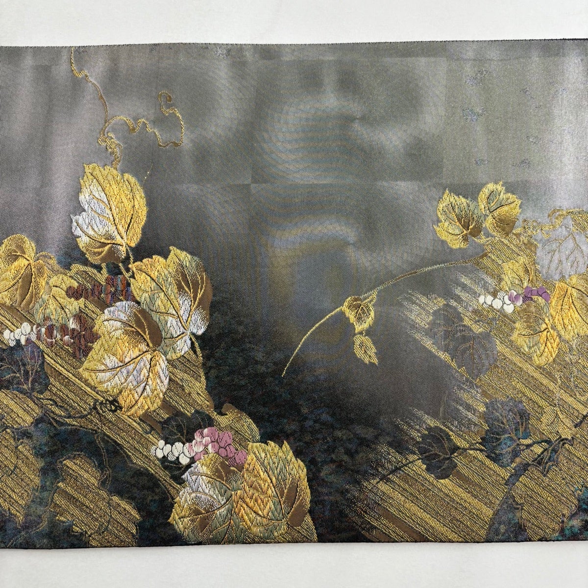 【美品】 袋帯 秀品 草花 華文 螺鈿箔 金彩 銀色 お太鼓柄 正絹